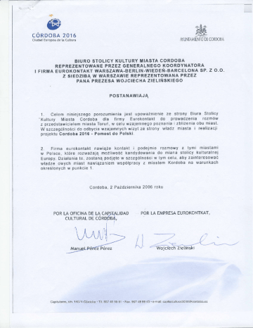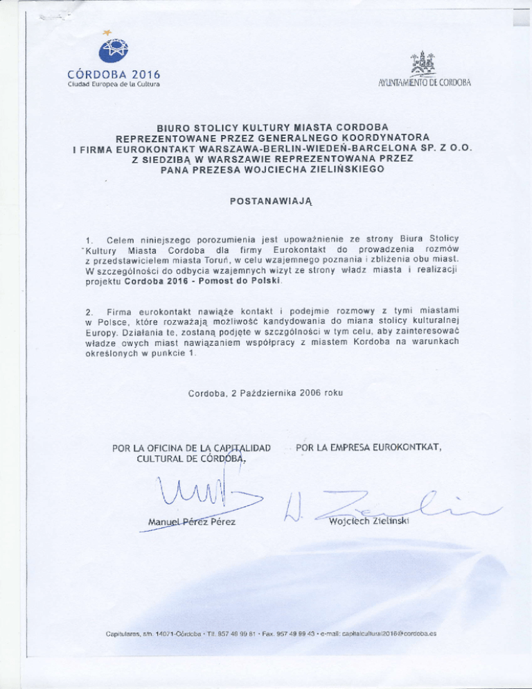 ajL-,!l ,*.E ;Ł I'E!l -fjŚ' cÓRD oBA 201ó ?.8: Dtc0tłD0B'Ą AYu5IAi\1E'M0 Ciudad Europea de h Cultu.a BIU R OST OL I C YKU L T U RYM I AS T AC O RD O B A P RZE Z G E N E RAL N E G OK O O RD Y N AT O B A R E PR E Z E NT OW A NE eLouA sP. z o.o. FIRil|AEuRoKoHTAKT wARszAwA-BERL|N.W|EDEŃ.enRc z sIEDzlBĄ W WARszAW|EREPREzENTowANAPRzEz PA N A PR E ZE S AW O J C I E C H AZI E L T N S K I E G O PosTAt,lAwIAJĄ jest upoważni€ n ieze strony Biu.a sto|icy 1. ce|em niniejszegoporozUmieniż .Ku|tury Miasta cordoba d|a firmy Eurokontaktdo plowadzenia rozmÓw obu miasl. miastaToruń'w ce|uwzajennegopoznanitizb|iżenia stawicie|em z Drzed wizytze stronyW|adzmiaŚta i realizacii do odbyciawzajemnych W szcz€ g Ó|ności proiektucordoba 2016. PÓmost dÓ Polski. 2' Filma eufokontaktnawiążekoniakt i prdeimie rozmowyz tymi miastami do miana stolicy kulturalnei kandydowenia moż|iwoŚĆ w Polsce. ktÓre rozlYażają \,Y w tyrnce|u.aby zainteresować te' zÓstanąpodjęte szezBÓlnoŚci Europy.Działania z miastemKordobana warunkach WspÓtpracy władzeowych miast nawiąfaniEm w pultkcie1rkfeŚ|ońych ?006roku eoldoba'2 Pażdziernika LIDAD PoR Lń EIńPRE5AEURoKoNTKAT' capitu|ares.sr'n.14r7l'córcłobę . TI|-s57 4ł's9 81 ' Fax' 9s7 49 9g 43 .4.mai|]cspila|cu|lu|a|[email protected] ^e;!TB +E + lFĘ".t -F^!t c oR D- o B A 201ó '.ź:' DtCot{DoBA AII]MńM]LM0 Ciudad Eunlpea de [d Cultura cuLTuRALDEcÓRDoBA LA oF|clNADELA cAplTAtlDAD REFRESENTADAPCIRSU COORDINADORGENERAL Y LA EMPRESA EUROKONTKAT sP' z o.o. WAR5ZAWA-BERL|N-V{IEDE|ł-BARCELoNA CON LA SEDE EN VARSOVIAREPRESENTADAPOR EL PRESIDENTESENIOR woJclEcHzlEL|ŃsK| ACUERDAN 1 . E|'presenteacuęrdotiene por objetoautofjzar,por parte de la oficina de [a Capitalidad Cultural, a ta empresa Eurokontaktpara ltevar a cabo las con el representantede ta ciudad de Toruń con e[ objetivo de neqoc.iaciones u.evar a[ conocimiento y acercamiento mutuo- En particular para [a organizacióny realización de yisitas mutuasde tas delegacionesde [a ciudad y |.arealizacióndel proyectoEórdoba 201ó - Puentea Polonia' f . Empresaeurokontaktestableceró contactos y empeceró neqociacionescon |.asciudadęs en Polonia que consideranta posibitidadde preŚrntar su candidaturaat tituto de ta ciudad Europade la cuttura. Estasactividades serón desarrolladasen particular con et objetivo de tlamar la atención de tas autoridades de estas ciudades a la cooperac.ióncon la ciudad de Córdoba conformea las condicionesfijadasen el punto1Córdoba,a 2 de octubrede f00ń POR LA OFICINADE LA CAPJTALIDAD CULTUBALDE CORDBBA, ll \ t I . tl \ /t /\ il ii VVVUI W!F]ł EUROKONTKAT, POR LA EATIPRESA --:. I i ..-mńałnzGrml' l'J -I _-: _-