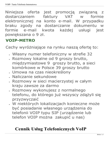 VOIP- Tania Telefonia Internetowa Niniejsza oferta jest promocją związaną z dostarczaniem faktury VAT w formie elektronicznej na konto e-mail. W przypadku braku zgody na dostarczanie dokumentu w formie e-mail kwota każdej usługi jest powiększana o 9 zł. VOIP-METRO Cechy wyróżniające na rynku naszą ofertę to: Własny numer telefoniczny w strefie 32 Rozmowy lokalne od 9 groszy brutto, międzymiastowe 9 groszy brutto, a sieci komórkowe w Polsce 39 groszy brutto Umowa na czas nieokreślony Naliczanie sekundowe Rozmowy w sieci macierzystej w całym kraju zawsze za darmo Rozmowy wykonujesz z normalnego telefonu, do którego już wszyscy zdążyli się przyzwyczaić W niektórych lokalizacjach konieczne może być posiadanie własnego urządzenia do telefonii VOIP typu SIP (urządzenie lub telefon VOIP można zakupić u nas) Cennik Usług Telefonicznych VoIP Strona 1 z 5 VOIP- Tania Telefonia Internetowa GROneT Sp.z o.o. Obowiązuje od 01.12.2009 r. Opłaty za wszystkie połączenia naliczane są co 1s od pierwszej sekundy połączenia Połączenia krajowe Opłata za 1 minutę Rodzaj Okres połączenia (PLN) połączenia Netto Brutto Połączenia całą darmowe darmowe pomiędzy dobę użytkownikami sieci METRO Stacjonarne całą 0,07 0,09 (lokalne i dobę międzymiastowe) Komórkowe całą 0,32 0,39 (Orange, Era, dobę Plus) Strona 2 z 5 VOIP- Tania Telefonia Internetowa Połączenia międzynarodowe Opłata za 1 minutę połączenia Rodzaj połączenia (PLN) Netto Brutto Strefa 1 – z 0,24 0,29 telefonamistacjonarnymi Strefa 1 – z telefonami 1,55 1,90 komórkowymi Strefa 2 – z 4,02 4,90 telefonamistacjonarnymi Strefa 2 – z telefonami 4,02 4,90 komórkowymi Telefonia satelitarna 4,84 5,90 Strefa 1 Unia Europejska, Kanada, USA Strefa 2 Reszta Świata Opłaty instalacyjne » Umowa na czas nieokreślony: 9,90 zł Strona 3 z 5 VOIP- Tania Telefonia Internetowa Opłaty MIESIĘC KWARTA PÓŁROC ROCZN 2 LATA ZNIE LNIE ZNIE IE nett brutt nett brutt nett brutt net brut net brut o o o o o o to to to to 4,96 6,10 FAX-2-MAIL Usługa FAX-2-MAIL (czytaj faxtumail) w tłumaczeniu z angielskiego oznacza dosłownie fax do e-mail czyli konwersję usługi faksowania do e-mail. Dzięki wykupieniu tej usługi mamy możliwość utworzenia faxu o normalnym numerze stacjonarnym ze strefy numeracyjnej 32, który będzie każdy przesłany dokument przesyłał na podane konto e-mail. Bez papieru, bez urządzenia, ale za to z dostępem na całym świecie niewarygodnie wygodny i funkcjonalny fax XXI w. Podaj na wizytówce swój nowy numer faxu i odbieraj emaile w dowolnym miejscu! Opłaty instalacyjne » Umowa na czas nieokreślony: 9,99 zł Strona 4 z 5 VOIP- Tania Telefonia Internetowa Opłaty MIESIĘC KWARTA PÓŁROC ROCZN 2 LATA ZNIE LNIE ZNIE IE nett brutt nett brutt nett brutt net bru net bru o o o o o o to tto to tto 4,00 4,92 - Strona 5 z 5