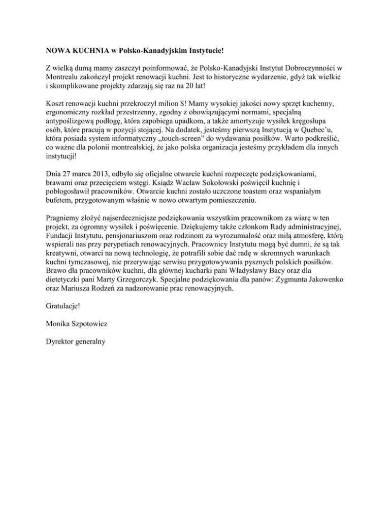 NOWA KUCHNIA w Polsko-Kanadyjskim Instytucie! Z wielką dumą mamy zaszczyt poinformować, że Polsko-Kanadyjski Instytut Dobroczynności w Montrealu zakończył projekt renowacji kuchni. Jest to historyczne wydarzenie, gdyż tak wielkie i skomplikowane projekty zdarzają się raz na 20 lat! Koszt renowacji kuchni przekroczył milion $! Mamy wysokiej jakości nowy sprzęt kuchenny, ergonomiczny rozkład przestrzenny, zgodny z obowiązującymi normami, specjalną antypoślizgową podłogę, która zapobiega upadkom, a także amortyzuje wysiłek kręgosłupa osób, które pracują w pozycji stojącej. Na dodatek, jesteśmy pierwszą Instytucją w Quebec’u, która posiada system informatyczny „touch-screen” do wydawania posiłków. Warto podkreślić, co ważne dla polonii montrealskiej, że jako polska organizacja jesteśmy przykładem dla innych instytucji! Dnia 27 marca 2013, odbyło się oficjalne otwarcie kuchni rozpoczęte podziękowaniami, brawami oraz przecięciem wstęgi. Ksiądz Wacław Sokołowski poświęcił kuchnię i pobłogosławił pracowników. Otwarcie kuchni zostało uczczone toastem oraz wspaniałym bufetem, przygotowanym właśnie w nowo otwartym pomieszczeniu. Pragniemy złożyć najserdeczniejsze podziękowania wszystkim pracownikom za wiarę w ten projekt, za ogromny wysiłek i poświęcenie. Dziękujemy także członkom Rady administracyjnej, Fundacji Instytutu, pensjonariuszom oraz rodzinom za wyrozumiałość oraz miłą atmosferę, którą wspierali nas przy perypetiach renowacyjnych. Pracownicy Instytutu mogą być dumni, że są tak kreatywni, otwarci na nową technologię, że potrafili sobie dać radę w skromnych warunkach kuchni tymczasowej, nie przerywając serwisu przygotowywania pysznych polskich posiłków. Brawo dla pracowników kuchni, dla głównej kucharki pani Władysławy Bacy oraz dla dietetyczki pani Marty Grzegorczyk. Specjalne podziękowania dla panów: Zygmunta Jakowenko oraz Mariusza Rodzeń za nadzorowanie prac renowacyjnych. Gratulacje! Monika Szpotowicz Dyrektor generalny