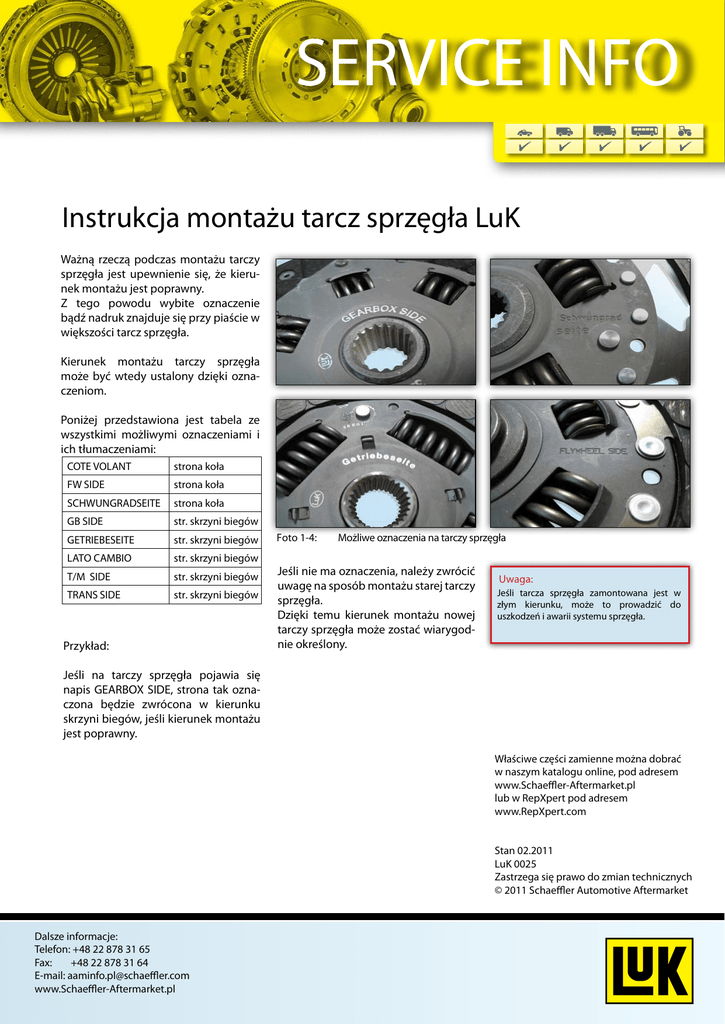 SERVICE INFO Instrukcja montażu tarcz sprzęgła LuK Ważną rzeczą podczas montażu tarczy sprzęgła jest upewnienie się, że kierunek montażu jest poprawny. Z tego powodu wybite oznaczenie bądź nadruk znajduje się przy piaście w większości tarcz sprzęgła. Kierunek montażu tarczy sprzęgła może być wtedy ustalony dzięki oznaczeniom. Poniżej przedstawiona jest tabela ze wszystkimi możliwymi oznaczeniami i ich tłumaczeniami: COTE VOLANT strona koła FW SIDE strona koła SCHWUNGRADSEITE strona koła GB SIDE str. skrzyni biegów GETRIEBESEITE str. skrzyni biegów LATO CAMBIO str. skrzyni biegów T/M SIDE str. skrzyni biegów TRANS SIDE str. skrzyni biegów Przykład: Foto 1-4: Możliwe oznaczenia na tarczy sprzęgła Jeśli nie ma oznaczenia, należy zwrócić uwagę na sposób montażu starej tarczy sprzęgła. Dzięki temu kierunek montażu nowej tarczy sprzęgła może zostać wiarygodnie określony. Uwaga: Jeśli tarcza sprzęgła zamontowana jest w złym kierunku, może to prowadzić do uszkodzeń i awarii systemu sprzęgła. Jeśli na tarczy sprzęgła pojawia się napis GEARBOX SIDE, strona tak oznaczona będzie zwrócona w kierunku skrzyni biegów, jeśli kierunek montażu jest poprawny. Właściwe części zamienne można dobrać w naszym katalogu online, pod adresem www.Schaeffler-Aftermarket.pl lub w RepXpert pod adresem www.RepXpert.com Stan 02.2011 LuK 0025 Zastrzega się prawo do zmian technicznych © 2011 Schaeffler Automotive Aftermarket Dalsze informacje: Telefon: +48 22 878 31 65 Fax: +48 22 878 31 64 E-mail: [email protected] www.Schaeffler-Aftermarket.pl