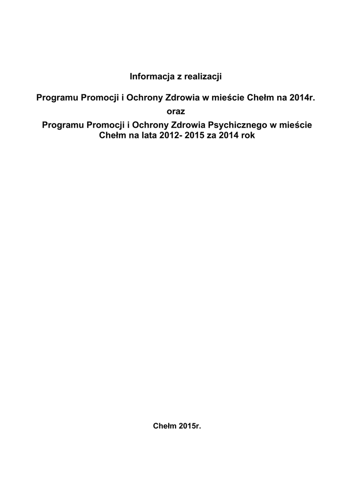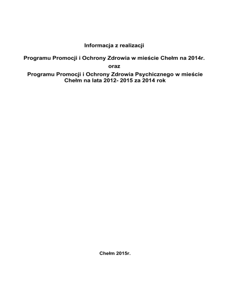 Informacja z realizacji Programu Promocji i Ochrony Zdrowia w mieście Chełm na 2014r. oraz Programu Promocji i Ochrony Zdrowia Psychicznego w mieście Chełm na lata 2012- 2015 za 2014 rok Chełm 2015r. Spis treści I. REALIZACJA ZADAŃ WYNIKAJĄCYCH Z PROGRAMU PROMOCJI I OCHRONY ZDROWIA W MIEŚCIE CHEŁM NA 2014 ROK....................................................................3 II. REALIZACJA ZADAŃ WYNIKAJĄCYCH Z PROGRAMU PROMOCJI I OCHRONY ZDROWIA PSYCHICZNEGO W MIEŚCIE CHEŁM NA LATA 2012 – 2015 W ROKU 2014 ............................................................................................................................................14 III. PODSUMOWANIE .........................................................................................................29 Informacja z realizacji Programu Promocji i Ochrony Zdrowia w mieście Chełm na 2014r. oraz Programu Promocji i Ochrony Zdrowia Psychicznego w mieście Chełm na lata 2012- 2015 za 2014 rok 2 z 31 I REALIZACJA ZADAŃ WYNIKAJĄCYCH Z PROGRAMU PROMOCJI I OCHRONY ZDROWIA W MIEŚCIE CHEŁM NA 2014 ROK Uchwałą Nr XXVI/229/12 z dnia 30 grudnia 2013 r. Rada Miasta Chełm przyjęła „Program Promocji i Ochrony Zdrowia w mieście Chełm na 2014.”, w ramach którego kontynuowano realizację następujących zadań: 1. Zwiększenie dostępności do podstawowych badan przesiewowych w grupie tzw chorób cywilizacyjnych poprzez realizację wieloletnich programów profilaktycznych opracowywanych i wdrażanych przez Miejski Samodzielny Publiczny Zakład Opieki Zdrowotnej w Chełmie. 2. Działania na rzecz zapobiegania chorobom zakaźnym i wirusowym. 3. Realizacja programów na rzecz promocji zdrowia i edukacji zdrowotnej w drodze otwartych konkursów ofert 4. Działania na rzecz zapobiegania chorobom wynikającym ze spożywania alkoholu i narkotyków oraz palenia tytoniu. 5. Działania na rzecz promocji i ochrony zdrowia psychicznego. 6. Pomoc doraźna w stanach nagłego zagrożenia życia. 7. Działania na rzecz przeciwdziałania przemocy w rodzinie. 8. Współpraca z Powiatową Stacją Sanitarno – Epidemiologiczną w Chełmie. 9. Współpraca ze Stowarzyszeniem Zdrowych Miast Polskich. Cel programu Podejmowanie skoordynowanych działań związanych z promocją zdrowia oraz zapobieganiem chorobom cywilizacyjnym i zakaźnym realizowane zadania 1.Zwiększenie dostępności do podstawowych badań przesiewowych w grupie tzw. chorób cywilizacyjnych poprzez realizację wieloletnich programów profilaktycznych opracowanych i wdrażanych przez Miejski Samodzielny Publiczny Zakład Opieki Zdrowotnej w Chełmie W ramach zwiększenia dostępności do podstawowych badań przesiewowych w grupie tzw chorób cywilizacyjnych w roku 2014 kontynuowano realizację czterech programów profilaktycznych współfinansowanych z budżetu Miasta Chełm, tj.: 1) program profilaktyki gruźlicy i raka płuc, 2) program profilaktyki osteoporozy, 3) program profilaktyki chorób układu krążenia, 4) program profilaktyki raka piersi. Na ich realizację Miejski Samodzielny Publiczny Zakład Opieki Zdrowotnej w Chełmie otrzymał dotację w wysokości 400 000,00 zł. Informacja z realizacji Programu Promocji i Ochrony Zdrowia w mieście Chełm na 2014r. oraz Programu Promocji i Ochrony Zdrowia Psychicznego w mieście Chełm na lata 2012- 2015 za 2014 rok 3 z 31 Szczegółowa ocena efektów programów profilaktycznych realizowanych przez Miejski Samodzielny Publiczny Zakład Opieki Zdrowotnej za 2014r. została przekazana Przewodniczącemu Rady Miasta Chełm w lutym 2015r. i była przedmiotem obrad Komisji Rodziny, Zdrowia i Ochrony Środowiska w dniu 24 marca. 2. Działania na rzecz zapobiegania chorobom 1. Kontynuacja realizacji programu zapobiegania chorobom zakaźnym i wirusowym zakaźnym poprzez szczepienia przeciwko pneumokokom. W 2014r. kontynuowano realizację Programu Ochrony Dzieci z Miasta Chełm przed Inwazyjną Chorobą Pneumokokową. Celem Programu była kontynuacja szczepień dzieci urodzonych w latach 2010 - 2011. Na kontynuację realizacji powyższego Programu przekazano Miejskiemu Samodzielnemu Publicznemu Zakładowi Opieki Zdrowotnej w Chełmie dotację w wysokości 50 000,00 zł. Szczegółowe informacje dotyczące realizacji tego zadania zostały przedstawione w Ocenie efektów programów profilaktycznych realizowanych przez Miejski Samodzielny Publiczny Zakład Opieki Zdrowotnej w Chełmie za 2014r, zostały przedstawione i przyjęte na posiedzeniu Komisji Rodziny, Zdrowia i Ochrony Środowiska w dniu 24 marca 2015r. 2. Opracowanie i realizacja programu profilaktyki zakażeń HCV (wirusa wywołującego Wirusowe Zapalenia typu C), skierowanego do dorosłych mieszkańców miasta Chełm, polegającego na wykonaniu testu z krwi na obecność wirusa. W ramach realizacji tego zadania opracowany został projekt Programu Profilaktyki zakażeń HCV dla Miasta Chełm na lata 2014 – 2016. W marcu 2014r. projekt programu został przesłany do Agencji Oceny Technologii Medycznych w celu zaopiniowania. W odpowiedzi Prezes Agencji Technologii Medycznych w miesiącu sierpniu 2014r. przesłał pozytywną opinię dotyczącą przedmiotowego projektu programu. 28 sierpnia 2014r. Rada Miasta Chełm uchwałą Nr XLIV/506/14 przyjęła Program Profilaktyki Zakażeń HCV dla Miasta Chełm na lata 2014 – 2016. 29 września 2014r. ogłoszony został konkurs na wybór realizatora badań diagnostycznych krwi na obecność wirusa HCV w ramach realizacji programu w roku 2014. Powołana przez Prezydenta Miasta Chełm Komisja po przeprowadzeniu postępowania konkursowego dokonała wybory realizatora badań. 04 listopada 2014r. została podpisana umowa pomiędzy Miastem Chełm, a Miejskim Samodzielnym Publicznym Zakładem Opieki Zdrowotnej w Chełmie na realizację badań w ramach programu. Zgodnie z założeniami programu w roku 2014 udało się przebadać 500 mieszkańców miasta Chełm w wieku 18 – 45 lat, spełniających kryteria programowe. Kwa