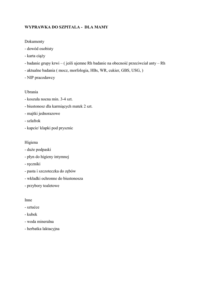 WYPRAWKA DO SZPITALA - DLA MAMY Dokumenty - dowód osobisty - karta ciąży - badanie grupy krwi – ( jeśli ujemne Rh badanie na obecność przeciwciał anty – Rh - aktualne badania ( mocz, morfologia, HBs, WR, cukier, GBS, USG, ) - NIP pracodawcy Ubrania - koszula nocna min. 3-4 szt. - biustonosz dla karmiących matek 2 szt. - majtki jednorazowe - szlafrok - kapcie/ klapki pod prysznic Higiena - duże podpaski - płyn do higieny intymnej - ręczniki - pasta i szczoteczka do zębów - wkładki ochronne do biustonosza - przybory toaletowe Inne - sztućce - kubek - woda mineralna - herbatka laktacyjna