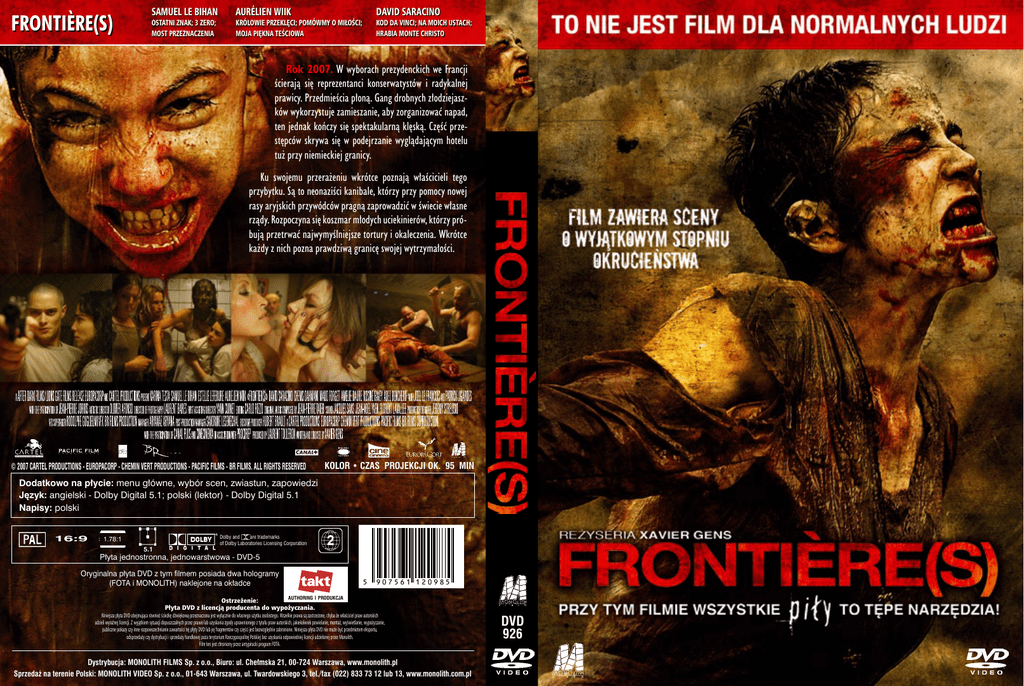 FRONTIÈRE(S) Samuel Le Bihan OSTATNI ZNAK; 3 zero; Most przeznaczenia Aurélien Wiik David Saracino Królowie przeklęci; Pomówmy o miłości; Moja piękna teściowa Kod da Vinci; Na moich ustach; Hrabia Monte Christo Rok 2007. W wyborach prezydenckich we Francji ścierają się reprezentanci konserwatystów i radykalnej prawicy. Przedmieścia płoną. Gang drobnych złodziejaszków wykorzystuje zamieszanie, aby zorganizować napad, ten jednak kończy się spektakularną klęską. Część przestępców skrywa się w podejrzanie wyglądającym hotelu tuż przy niemieckiej granicy. Ku swojemu przerażeniu wkrótce poznają właścicieli tego przybytku. Są to neonaziści kanibale, którzy przy pomocy nowej rasy aryjskich przywódców pragną zaprowadzić w świecie własne rządy. Rozpoczyna się koszmar młodych uciekinierów, którzy próbują przetrwać najwymyślniejsze tortury i okaleczenia. Wkrótce każdy z nich pozna prawdziwą granicę swojej wytrzymałości. © 2007 CARTEL PRODUCTIONS - EUROPACORP - CHEMIN VERT PRODUCTIONS - PACIFIC FILMS - BR FILMS. ALL RIGHTS RESERVED Kolor • czas projekcji ok. 95 min Dodatkowo na płycie: menu główne, wybór scen, zwiastun, zapowiedzi Język: angielski - Dolby Digital 5.1; polski (lektor) - Dolby Digital 5.1 Napisy: polski 16:9 1.78:1 5.1 Dolby and are trademarks of Dolby Laboratories Licensing Corporation Płyta jednostronna, jednowarstwowa - DVD-5 Oryginalna płyta DVD z tym filmem posiada dwa hologramy (FOTA i MONOLITH) naklejone na okładce 5 907561 120985 authoring i produkcja Ostrzeżenie: Płyta DVD z licencją producenta do wypożyczania. Niniejsza płyta DVD obejmująca również ścieżkę dźwiękową przeznaczona jest wyłącznie do własnego użytku osobistego. Wszelkie prawa są zastrzeżone, chyba że właściciel praw autorskich udzieli wyraźnej licencji. Z wyjątkiem sytuacji dopuszczalnych przez prawo lub uzyskania zgody uprawnionego z tytułu praw autorskich, jakiekolwiek powielanie, montaż, wyświetlanie, wypożyczanie, publiczne pokazy czy inne rozpowszechnianie zawartości tej płyty DVD lub jej fragmentów czy części jest bezwzględnie zabronione. Niniejsza płyta DVD nie może być przedmiotem eksportu, odsprzedaży czy dystrybucji i sprzedaży handlowej poza terytorium Rzeczypospolitej Polskiej bez uzyskania odpowiedniej licencji udzielonej przez Monolith. Film ten jest chroniony przez antypiracki program FOTA. Dystrybucja: MONOLITH FILMS Sp. z o.o., Biuro: ul. Chełmska 21, 00-724 Warszawa, www.monolith.pl Sprzedaż na terenie Polski: MONOLITH VIDEO Sp. z o.o., 01-643 Warszawa, ul. Twardowskiego 3, tel./fax (022) 833 73 12 lub 13, www.monolith.com.pl DVD 926
