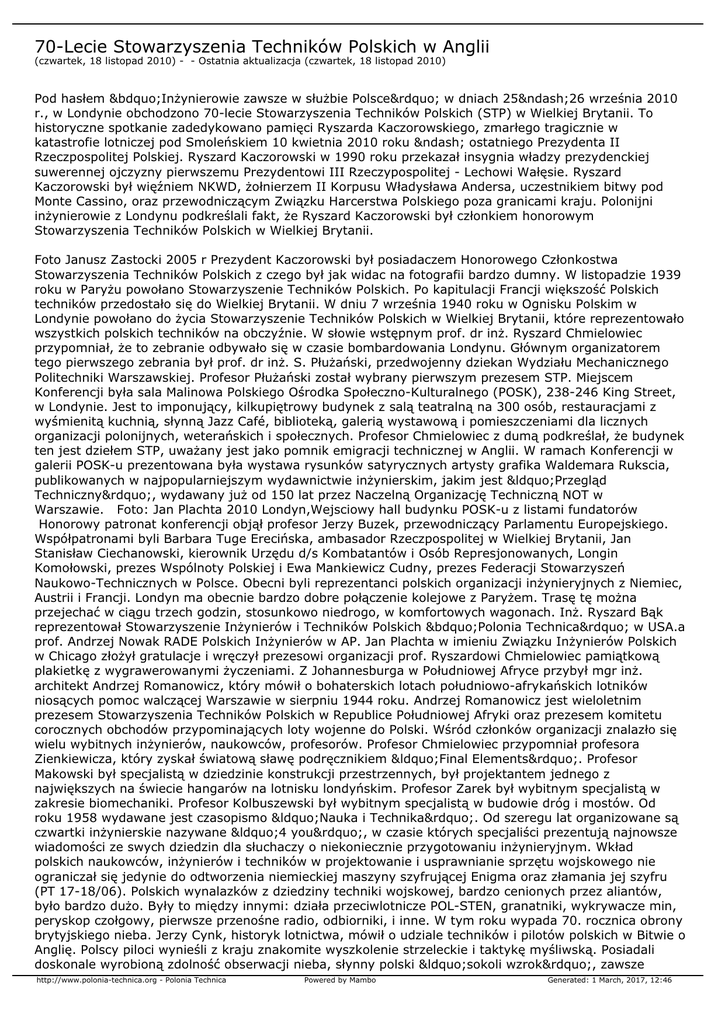 70-Lecie Stowarzyszenia Techników Polskich w Anglii (czwartek, 18 listopad 2010) - - Ostatnia aktualizacja (czwartek, 18 listopad 2010) Pod hasłem „Inżynierowie zawsze w służbie Polsce” w dniach 25–26 września 2010 r., w Londynie obchodzono 70-lecie Stowarzyszenia Techników Polskich (STP) w Wielkiej Brytanii. To historyczne spotkanie zadedykowano pamięci Ryszarda Kaczorowskiego, zmarłego tragicznie w katastrofie lotniczej pod Smoleńskiem 10 kwietnia 2010 roku – ostatniego Prezydenta II Rzeczpospolitej Polskiej. Ryszard Kaczorowski w 1990 roku przekazał insygnia władzy prezydenckiej suwerennej ojczyzny pierwszemu Prezydentowi III Rzeczypospolitej - Lechowi Wałęsie. Ryszard Kaczorowski był więźniem NKWD, żołnierzem II Korpusu Władysława Andersa, uczestnikiem bitwy pod Monte Cassino, oraz przewodniczącym Związku Harcerstwa Polskiego poza granicami kraju. Polonijni inżynierowie z Londynu podkreślali fakt, że Ryszard Kaczorowski był członkiem honorowym Stowarzyszenia Techników Polskich w Wielkiej Brytanii. Foto Janusz Zastocki 2005 r Prezydent Kaczorowski był posiadaczem Honorowego Członkostwa Stowarzyszenia Techników Polskich z czego był jak widac na fotografii bardzo dumny. W listopadzie 1939 roku w Paryżu powołano Stowarzyszenie Techników Polskich. Po kapitulacji Francji większość Polskich techników przedostało się do Wielkiej Brytanii. W dniu 7 września 1940 roku w Ognisku Polskim w Londynie powołano do życia Stowarzyszenie Techników Polskich w Wielkiej Brytanii, które reprezentowało wszystkich polskich techników na obczyźnie. W słowie wstępnym prof. dr inż. Ryszard Chmielowiec przypomniał, że to zebranie odbywało się w czasie bombardowania Londynu. Głównym organizatorem tego pierwszego zebrania był prof. dr inż. S. Płużański, przedwojenny dziekan Wydziału Mechanicznego Politechniki Warszawskiej. Profesor Płużański został wybrany pierwszym prezesem STP. Miejscem Konferencji była sala Malinowa Polskiego Ośrodka Społeczno-Kulturalnego (POSK), 238-246 King Street, w Londynie. Jest to imponujący, kilkupiętrowy budynek z salą teatralną na 300 osób, restauracjami z wyśmienitą kuchnią, słynną Jazz Café, biblioteką, galerią wystawową i pomieszczeniami dla licznych organizacji polonijnych, weterańskich i społecznych. Profesor Chmielowiec z dumą podkreślał, że budynek ten jest dziełem STP, uważany jest jako pomnik emigracji technicznej w Anglii. W ramach Konferencji w galerii POSK-u prezentowana była wystawa rysunków satyrycznych artysty grafika Waldemara Rukscia, publikowanych w najpopularniejszym wydawnictwie inżynierskim, jakim jest “Przegląd Techniczny”, wydawany już od 150 lat przez Naczelną Organizację Techniczną NOT w Warszawie. Foto: Jan Plachta 2010 Londyn,Wejsciowy hall budynku POSK-u z listami fundatorów Honorowy patronat konferencji objął profesor Jerzy Buzek, przewodniczący Parlamentu Europejskiego. Współpatronami byli Barbara Tuge Erecińska, ambasador Rzeczpospolitej w Wielkiej Brytanii, Jan Stanisław Ciechanowski, kierownik Urzędu d/s Kombatantów i Osób Represjonowanych, Longin Komołowski, prezes Wspólnoty Polskiej i Ewa Mankiewicz Cudny, prezes Federacji Stowarzyszeń Naukowo-Technicznych w Polsce. Obecni byli reprezentanci polskich organizacji inżynieryjnych z Niemiec, Austrii i Francji. Londyn ma obecnie bardzo dobre połączenie kolejowe z Paryżem. Trasę tę można przejechać w ciągu trzech godzin, stosunkowo niedrogo, w komfortowych wagonach. Inż. Ryszard Bąk reprezentował Stowarzyszenie Inżynierów i Techników Polskich „Polonia Technica” w USA.a prof. Andrzej Nowak RADE Polskich Inżynierów w AP. Jan Plachta w imieniu Związku Inżynierów Polskich w Chicago złożył gratulacje i wręczył prezesowi organizacji prof. Ryszardowi Chmielowiec pamiątkową plakietkę z wygrawerowanymi życzeniami. Z Johannesburga w Południowej Afryce przybył mgr inż. architekt Andrzej Romanowicz, który mówił o bohaterskich lotach południowo-afrykańskich lotników niosących pomoc walczącej Warszawie w sierpniu 1944 roku. Andrzej Romanowicz jest wieloletnim prezesem Stowarzyszenia Techników Polskich w Republice Południowej Afryki oraz prezesem komitetu corocznych obchodów przypominających loty wojenne do Polski. Wśród członków organizacji znalazło się wielu wybitnych inżynierów, naukowców, profesorów. Profesor Chmielowiec przypomniał profesora Zienkiewicza, który zyskał światową sławę podręcznikiem “Final Elements”. Profesor Makowski był specjalistą w dziedzinie konstrukcji przestrzennych, był projektantem jednego z największych na świecie hangarów na lotnisku londyńskim. Profesor Zarek był wybitnym specjalistą w zakresie biomechaniki. Profesor Kolbuszewski był wybitnym specjalistą w budowie dróg i mostów. Od roku 1958 wydawane jest czasopismo “Nauka i Technika”. Od szeregu lat organizowane są czwartki inżynierskie nazywane “4 you”, w czasie których specjaliści prezentują najnowsze wiadomości ze swych dziedzin dla słuchaczy o niekoniecznie przygotowaniu inżynieryjnym. Wkład polskich naukowców, inżynierów i techników w projektowanie i usprawnianie sprzętu wojskowego nie ograniczał się jedynie do odtworzenia niemieckiej maszyny szyfrującej Enigma oraz złamania jej szyfru (PT 17-18/06). Polskich wynalazków z dziedziny techniki wojskowej, bardzo cenionych przez aliantów, było bardzo dużo. Były to między innymi: działa przeciwlotnicze POL-STEN, granatniki, wykrywacze min, peryskop czołgowy, pierwsze przenośne radio, odbiorniki, i inne. W tym roku wypada 70. rocznica obrony brytyjskiego nieba. Jerzy Cynk, historyk lotnictwa, mówił o udziale techników i pilotów polskich w Bitwie o Anglię. Polscy piloci wynieśli z kraju znakomite wyszkolenie strzeleckie i taktykę myśliwską. Posiadali doskonale wyrobioną zdolność obserwacji nieba, słynny polski “sokoli wzrok”, zawsze ht