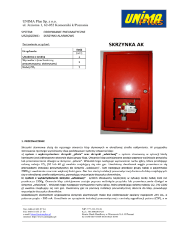 Plus UNIMA Plus Sp. z o.o. ul. Jeziorna 1, 62-052 Komorniki k/Poznania SYSTEM: URZĄDZENIE: ODDYMIANIE PNEUMATYCZNE SKRZYNKI ALARMOWE SKRZYNKA AK Zestawienie urządzeń: Urządzenia: Obudowa z szybką Wyzwalacz (mechaniczny, pneumatyczny, elektryczny) Nabój CO2 Ilość (szt.) 1 1 1 1. PRZEZNACZENIE Skrzynki alarmowe służą do ręcznego otwarcia klap dymowych w określonej strefie oddymiania. W przypadku sterowania ręcznego wyróżniamy dwa podstawowe systemy otwarcia klap: a) system z wykorzystaniem: skrzynki „pilota” oraz skrzynki „właściwej” – system stosowany w sytuacji kiedy konieczne jest jednoczesne otwarcie dużej grupy klap. Otwarcie klap zainicjowane zostaje poprzez wciśnięcie przycisku lub przemieszczenie dźwigni w skrzynce „pilocie”. Wskutek tego następuje wymuszenie ruchu iglicy, która przebijając osłonę naboju CO2 (20 lub 40 g) uwalnia znajdujący się nim gaz. Uwolniony dwutlenek węgla przemieszcza się przewodami instalacji pneumatycznej do skrzynki „właściwej”. Tam następuje przebicie grupy naboi o pojemności 2000 g i uwolnienie znacznie większej ilości gazu. Gaz ten siecią instalacji pneumatycznej dociera do klap znajdujących się w określonej strefie oddymiania, powodując wysunięcie tłoczyska siłowników, b) system z wykorzystaniem skrzynki „właściwej” - system stosowany najczęściej w sytuacji kiedy nabój CO2 nie przekracza 1500g. Otwarcie klap zainicjowane zostaje poprzez wciśnięcie przycisku lub przemieszczenie dźwigni w skrzynce „właściwej”. Wskutek tego następuje wymuszenie ruchu iglicy, która przebijając osłonę naboju CO2 (40-1500 g) uwalnia znajdujący się nim gaz. Uwolniony gaz za pomocą instalacji pneumatycznej dociera do klap, powodując wysunięcie tłoczyska siłowników. Dodatkowym elementem wyposażenia skrzynek alarmowych może być elektrozawór zasilany napięciem 24V DC, o poborze prądu - 300 mA. Umożliwia on sprzężenie instalacji pneumatycznej z centralą sygnalizacji pożaru (CSP), a w Tel.: 048 61 833 27 34 Fax: 048 61 833 27 36 e-mail: [email protected] internet: http://www.unimaplus.pl NIP: 777-313-94-36 K.Z.: 305.000,00 PLN Konto: Bank Handlowy w Warszawie S.A. O/Poznań 02 1030 0019 0109 8530 0025 8398 UNIMA Plus Sp. z o.o. ul. Jeziorna 1, 62-052 Komorniki k/Poznania Plus konsekwencji automatyczne uruchomienie systemu oddymiania wskutek dotarcia do skrzynki impulsu elektrycznego z Centrali Sygnalizacji Pożaru. 2. ELEMENTY SKŁADOWE Skrzynka alarmowa składa się z: a) obudowy z szybką, b) urządzenia wyzwalającego (elektrycznego, mechanicznego lub pneumatycznego), c) dźwigni lub przycisku, d) naboju lub grupy naboi CO2, e) instalacji pneumatycznej (rurka miedziana ∅ 6 mm), f) złączek wyprowadzających instalacje na zewnątrz skrzynki. 3. PODSTAWOWE PARAMETRY Skrzynki alarmowe mają kształt prostopadłościanu i wykonane są z blachy pomalowanej na kolor czerwony wg. RAL 3000. Na przedniej ściance skrzynki znajdują się przeszklone drzwiczki zamykane na klucz. Parametry skrzynek zestawiono w poniższej tabeli. typ skrzynki AK10.3 AK10.5 AK10.7 AK10.9 AK10.3 +AK30.7 maksymalny nabój 150 g 500 g 750 g 1500 g 2000 g 4. SCHEMATY BLOKOWE SKRZYNEK Tel.: 048 61 833 27 34 Fax: 048 61 833 27 36 e-mail: [email protected] internet: http://www.unimaplus.pl NIP: 777-313-94-36 K.Z.: 305.000,00 PLN Konto: Bank Handlowy w Warszawie S.A. O/Poznań 02 1030 0019 0109 8530 0025 8398 Plus UNIMA Plus Sp. z o.o. ul. Jeziorna 1, 62-052 Komorniki k/Poznania WARIANT I skrzynka "pilot" + skrzynka "właściwa" inst. pneumat. do klap możliwość sprzężenia układu z centralą wykrywania pożaru HDGs 2x1,0 mm2 24 V DC, 300 mA skrzynka "właściwa" WARIANT II skrzynka "właściwa" inst. pneumat. do klap możliwość sprzężenia układu z centralą wykrywania pożaru skrzynka "właściwa" HDGs 2x1,0 mm2 skrzynka "pilot" 24 V DC, 300 mA schemat elektryczny elektrozaworu schemat elektryczny elektrozaworu Zu Zu -24 V DC 300 mA -24 V DC 300 mA Koszty dojazdu oraz montażu ustalane indywidualnie. Szczegółowe informacje – tel. 603 706 152, 603 555 234. Tel.: 048 61 833 27 34 Fax: 048 61 833 27 36 e-mail: [email protected] internet: http://www.unimaplus.pl NIP: 777-313-94-36 K.Z.: 305.000,00 PLN Konto: Bank Handlowy w Warszawie S.A. O/Poznań 02 1030 0019 0109 8530 0025 8398