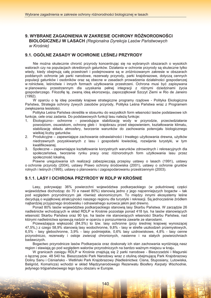 Wybrane zagadnienia w zakresie ochrony różnorodności biologicznej w lasach Raport o stanie środowiska w 2010 r. 9. WYBRANE ZAGADNIENIA W ZAKRESIE OCHRONY RÓŻNORODNOŚCI BIOLOGICZNEJ W LASACH (Regionalna Dyrekcja Lasów Państwowych w Krośnie) 9.1. OGÓLNE ZASADY W OCHRONIE LEŚNEJ PRZYRODY Nie można skutecznie chronić przyrody koncentrując się na wybranych obszarach o wysokich walorach czy na populacjach określonych gatunków. Działania w ochronie przyrody są skuteczne tylko wtedy, kiedy obejmują całą przestrzeń i podejmowane są w zróżnicowanym zakresie w obszarach poddanych ochronie jak parki narodowe, rezerwaty przyrody, parki krajobrazowe, dotyczą cennych populacji gatunków i osobników oraz są obecne w zasadach prowadzenia działalności gospodarczej w rolnictwie, leśnictwie i innych formach użytkowania przestrzeni. Ochrona musi być zapisywana w planowaniu przestrzennym dla uzyskania pełnej integracji z różnymi dziedzinami życia gospodarczego. Filozofię tę, zwaną ideą ekorozwoju, zapoczątkował Szczyt Ziemi w Rio de Janeiro (1992). W oparciu o tę ideę powstały krajowe strategiczne programy rządowe - Polityka Ekologiczna Państwa, Strategia ochrony żywych zasobów przyrody, Polityka Leśna Państwa wraz z Programem zwiększenia lesistości. Polityka Leśna Państwa określiła w stosunku do wszystkich form własności lasów podstawowe ich funkcje, cele oraz zadania. Do podstawowych funkcji lasu należą funkcje: 1. Ekologiczno– ochronne - powodujące stabilizację wody w przyrodzie, przeciwdziałanie powodziom, osuwiskom, ochronę gleb i krajobrazu przed stepowieniem, kształtowanie klimatu, stabilizację składu atmosfery, tworzenie warunków do zachowania potencjału biologicznego wielkiej liczby gatunków. 2. Produkcyjne – zapewniające zachowanie odnawialności i trwałego użytkowania drewna, użytków niedrzewnych pozyskiwanych z lasu i gospodarki łowieckiej, rozwijanie turystyki, w tym kwalifikowanej. 3. Społeczne – zapewniające kształtowanie korzystnych warunków zdrowotnych i rekreacyjnych dla społeczeństwa, tworzenie rynku pracy oraz różnorodnych form użytkowania lasu przez społeczność lokalną. Prawne uregulowania ich realizacji zabezpieczają przepisy ustawy o lasach (1991), ustawy o ochronie przyrody (2004), ustawy Prawo ochrony środowiska (2001), ustawy o ochronie gruntów rolnych i leśnych (1995), ustawy o planowaniu i zagospodarowaniu przestrzennym (2003). 9.1.1. LASY I OCHRONA PRZYRODY W RDLP W KROŚNIE Lasy, pokrywając 36% powierzchni województwa podkarpackiego (w południowej części województwa dochodząc do 70 a nawet 80%) stanowią jedno z jego najcenniejszych bogactw – tak pod względem przyrodniczym jak również ekonomicznym. To między innymi ekosystemy leśne decydują o wyjątkowej atrakcyjności naszego regionu dla turystyki i rekreacji. Są jednocześnie źródłem najbardziej przyjaznego środowisku i odnawialnego surowca jakim jest drewno. Ponad 80% lasów województwa podkarpackiego stanowią lasy Skarbu Państwa. W zarządzie 26 nadleśnictw wchodzących w skład RDLP w Krośnie pozostaje ponad 418 tys. ha lasów stanowiących własność Skarbu Państwa oraz 90 tys. ha lasów nie stanowiących własności Skarbu Państwa, nad którymi nadleśnictwa sprawują nadzór w oparciu o porozumienia zawarte ze starostami. Przeważająca większość (84,5%) to tzw. lasy ochronne (przy średniej krajowej wynoszącej 47,5%,) z czego 58,9% stanowią lasy wodochronne, 9,8% - lasy w strefie uszkodzeń przemysłowych, 6,5% - lasy glebochronne, 3,9% - lasy podmiejskie, 0,6% lasy uzdrowiskowe, 4,8% - lasy cenne przyrodniczo, rezerwaty i ostoje zwierząt chronionych, nasienne i na stałych powierzchniach badawczych. Bogactwo przyrodnicze lasów Podkarpacia oraz doskonały ich stan zachowania wyróżniają nasz region i stawiają go pod względem walorów przyrodniczych na bardzo ważnym miejscu w kraju. W granicach zasięgu RDLP w Krośnie znajdują się 2 parki narodowe - Bieszczadzki i Magurski o łącznej pow. 48 540 ha. Bieszczadzki Park Narodowy wraz z otuliną obejmującą Park Krajobrazowy Doliny Sanu i Ciśniańsko - Wetliński Park Krajobrazowy (Nadleśnictwa: Cisna, Stuposiany, Lutowiska, Baligród, Komańcza) wchodzi w skład Międzynarodowego Rezerwatu Biosfery Karpaty Wschodnie, jedynego trójpaństwowego tego typu obszaru w Europie. 140 140 Raport o stanie środowiska w 2010 r. Wybrane zagadnienia w zakresie ochrony różnorodności biologicznej Na terenach zarządzanych przez RDLP w Krośnie znajdują się następujące formy ochrony utworzone, ustanowione bądź powołane na podstawie ustawy o ochronie przyrody (2004): 74 rezerwaty przyrody o pow. 10,092 ha, 8 parków krajobrazowych o pow. 182 tys. ha,13 obszarów chronionego krajobrazu obejmujących pow. 193 tys. ha, 303 pomniki przyrody ożywionej i nieożywionej, 382 użytki ekologiczne o pow. 2 390 ha, 5 zespołów przyrodniczo-krajobrazowych, 182 strefy ochronne miejsc ostoi, rozrodu i regularnego przebywania gatunków chronionych, 6 Obszarów Specjalnej Ochrony Natura 2000 o pow. 221,6 tys. ha, 14 Specjalnych Obszarów Ochrony Natura 2000 o pow. 201,8 tys. ha. 9.1.2. WYKONYWANIE OCHRONY PRZYRODY W LASACH PAŃSTWOWYCH Integralną częścią planu urządzenia lasu dla Nadleśnictwa - podstawowego dokumentu planistycznego w Lasach Państwowych jest Program ochrony przyrody. Obowiązek sporządzania tego dokumentu nałożyła znowelizowana w 1991 r. ustawa o lasach. Program ochrony przyrody wykonywany jest w celu: 1. Poprawy warunków ochrony i w miarę możliwości wzbogacania zasobów przyrodniczych ekosystemów leśnych, a w szczególności zachowania różnorodności biologicznej na wszystkich poziomach organizacji: genowym, gatunkowym, populacyjnym, ekosystemowym i krajobrazowym. 2. Zinwentaryzowania i zobrazowania warunków przyrodniczych oraz zagrożeń przyrody w nadleśnictwie na tle regionu i kraju. 3. Doskonalenia gospodar