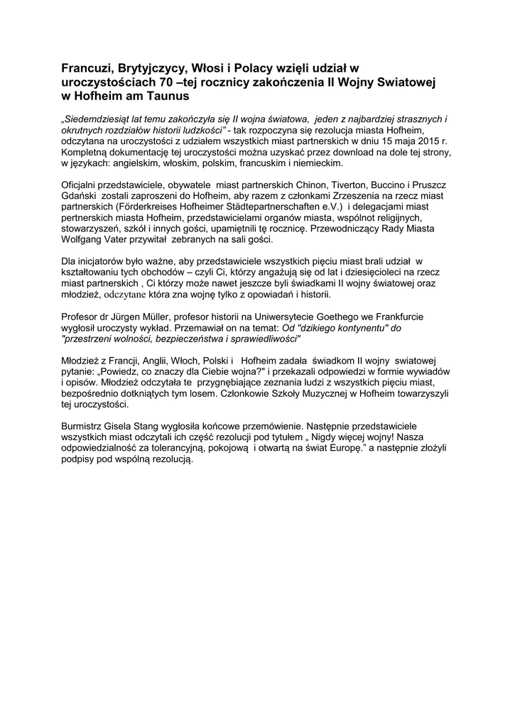 Francuzi, Brytyjczycy, Włosi i Polacy wzięli udział w uroczystościach 70 –tej rocznicy zakończenia II Wojny Swiatowej w Hofheim am Taunus „Siedemdziesiąt lat temu zakończyła się II wojna światowa, jeden z najbardziej strasznych i okrutnych rozdziałów historii ludzkości” - tak rozpoczyna się rezolucja miasta Hofheim, odczytana na uroczystości z udziałem wszystkich miast partnerskich w dniu 15 maja 2015 r. Kompletną dokumentację tej uroczystości można uzyskać przez download na dole tej strony, w językach: angielskim, włoskim, polskim, francuskim i niemieckim. Oficjalni przedstawiciele, obywatele miast partnerskich Chinon, Tiverton, Buccino i Pruszcz Gdański zostali zaproszeni do Hofheim, aby razem z członkami Zrzeszenia na rzecz miast partnerskich (Förderkreises Hofheimer Städtepartnerschaften e.V.) i delegacjami miast pertnerskich miasta Hofheim, przedstawicielami organów miasta, wspólnot religijnych, stowarzyszeń, szkół i innych gości, upamiętnili tę rocznicę. Przewodniczący Rady Miasta Wolfgang Vater przywitał zebranych na sali gości. Dla inicjatorów było ważne, aby przedstawiciele wszystkich pięciu miast brali udział w kształtowaniu tych obchodów – czyli Ci, którzy angażują się od lat i dziesięcioleci na rzecz miast partnerskich , Ci którzy może nawet jeszcze byli świadkami II wojny światowej oraz młodzież, odczytane która zna wojnę tylko z opowiadań i historii. Profesor dr Jürgen Müller, profesor historii na Uniwersytecie Goethego we Frankfurcie wygłosił uroczysty wykład. Przemawiał on na temat: Od "dzikiego kontynentu" do "przestrzeni wolności, bezpieczeństwa i sprawiedliwości" Młodzież z Francji, Anglii, Włoch, Polski i Hofheim zadała świadkom II wojny swiatowej pytanie: „Powiedz, co znaczy dla Ciebie wojna?" i przekazali odpowiedzi w formie wywiadów i opisów. Młodzież odczytała te przygnębiające zeznania ludzi z wszystkich pięciu miast, bezpośrednio dotkniątych tym losem. Członkowie Szkoły Muzycznej w Hofheim towarzyszyli tej uroczystości. Burmistrz Gisela Stang wygłosiła końcowe przemówienie. Następnie przedstawiciele wszystkich miast odczytali ich część rezolucji pod tytułem „ Nigdy więcej wojny! Nasza odpowiedzialność za tolerancyjną, pokojową i otwartą na świat Europę.” a następnie złożyli podpisy pod wspólną rezolucją.