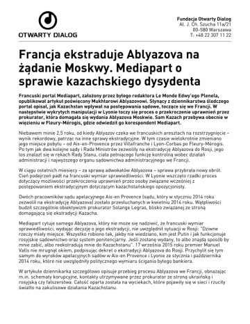 Fundacja Otwarty Dialog Al. J. Ch. Szucha 11a/21 00-580 Warszawa T: +48 22 307 11 22 Francja ekstraduje Ablyazova na żądanie Moskwy. Mediapart o sprawie kazachskiego dysydenta Francuski portal Mediapart, założony przez byłego redaktora Le Monde Edwy’ego Plenela, opublikował artykuł poświęcony Mukhtarowi Ablyazovowi. Słynący z dziennikarstwa śledczego portal opisał, jak Kazachstan wpływał na postępowania sądowe, toczące się we Francji. W następstwie wykrytych manipulacji w Lyonie toczy się proces o przekroczenie uprawnień przez prokurator, która domagała się wydania Ablyazova Moskwie. Sam Kazach przebywa obecnie w więzieniu w Fleury-Mérogis, gdzie odwiedził go korespondent Mediapart. Niebawem minie 2,5 roku, od kiedy Ablyazov czeka we francuskich aresztach na rozstrzygnięcie – wynik rekordowy, patrząc na inne sprawy ekstradycyjne. W tym czasie wielokrotnie zmieniano jego miejsce pobytu – od Aix-en-Provence przez Villefranche i Lyon-Corbas po Fleury-Mérogis. Po tym jak dwa kolejne sądy i Rada Ministrów zezwoliły na ekstradycję Ablyazova do Rosji, jego los znalazł się w rękach Rady Stanu, ciała pełniącego funkcję kontrolną wobec działań administracji i najwyższego organu sądownictwa administracyjnego we Francji. W ciągu ostatnich miesięcy – za sprawą adwokatów Ablyazova – sprawa przybrała nowy obrót. Cień podejrzeń padł na francuski wymiar sprawiedliwości. W Lyonie wszczęto rzadki proces dotyczący możliwości przekroczenia uprawnień przez osoby związane wcześniej z postępowaniem ekstradycyjnym dotyczącym kazachstańskiego opozycjonisty. Dwóch pracowników sądu apelacyjnego Aix-en Provence (sądu, który w styczniu 2014 roku zezwolił na ekstradycję Ablyazova) zostało przesłuchanych w kwietniu 2014 roku. Wątpliwości budził szczególnie obiektywizm prokurator Solange Legras, blisko związanej ze stroną domagającą się ekstradycji Kazacha. Mediapart cytuje samego Ablyazova, który nie może się nadziwić, że francuski wymiar sprawiedliwości, wydając decyzję o jego ekstradycji, nie uwzględnił sytuacji w Rosji: "Dziwne rzeczy miały miejsce. Wszystko robiono tak, jakby nie wiedziano, kim jest Putin i jak funkcjonuje rosyjskie sądownictwo oraz system penitencjarny. Jeśli zostanę wydany, to albo znajdą sposób by mnie zabić, albo reekstradują mnie do Kazachstanu". 17 września 2015 roku premier Manuel Valls nie mrugnął okiem, podpisując dekret o ekstradycji Ablyazova do Rosji. Przychylił się tym samym do wyroków apelacyjnych sądów w Aix-en Provence i Lyonie ze stycznia i października 2014 roku, które nie uwzględniły politycznego wymiaru ścigania byłego bankiera. W artykule dziennikarka szczegółowo opisuje przebieg procesu Ablyazova we Francji, obnażając m.in. schematy korupcyjne, kontakty utrzymywane przez prokurator ze stroną ukraińską i rosyjską czy fałszerstwa. Całość oparta została na wyciekach, które pojawiły się w sieci i rzuciły światło na zakulisowe działania Kazachstanu. W lutym 2014 roku ukraiński portal trust.ua opublikował zhakowane wiadomości e-mail oraz smsy pomiędzy prokurator Solange Legras a ukraińskimi i francuskimi adwokatami. Niedługo później strona Kazaword przejęła pałeczkę, publikując w sieci masę zhakowanych dokumentów kazachstańskich urzędników wysokiego szczebla. Z dokumentów wynikało, że Kazachstan – który nie ma podpisanej z Francją konwencji o ekstradycję – usiłuje wpływać na prace rosyjskich i ukraińskich sądów [przyp. Ukraina i Rosja formalnie domagały się ekstradycji Ablyazova z Francji]. Na jaw wyszły też informacje o opłacaniu lobbystów przez Astanę. Zdaniem Agathe Duparc z Mediapart, za atakami hakerskimi stoi prawdopodobnie grupa związana z byłym bankierem i opozycjonistą, choć sam Ablyazov temu zaprzecza. Jednak bez względu na to, kto dokonał ataku, autentyczność dokumentów nigdy nie została poddana w wątpliwość – nawet przez stronę kazachską. Na podstawie zhakowanych materiałów wszczęto sprawy przeciwko Nicole Besset i Solange Legras. Tę ostatnią podczas przesłuchań pytano m.in. o bliskie stosunki łączące ją z Antonin Lévy, prawnikiem BTA Banku na Europę – banku, którego prezesem w latach 2005-2009 był Ablyazov, a który następnie został znacjonalizowany i przejęty przez kazachstańskie władze. Po dokonanej siłą zmianie właściciela, bank oskarżył byłego prezesa o defraudację miliardów dolarów, rozpoczynając tym samym polowanie na Ablyazova i jego współpracowników na terenie niemal całej Europy. Lévy był obecny na posiedzeniach sądowych w sprawie ekstradycji Ablyazova. Gorliwie dostarczał też prokurator szczegółowych informacji – np. w mejlu z 3 października wyjaśniał proces toczący się przeciwko Ablyazovowi na Ukrainie. Z kolei 8 listopada zapewniał, że w przypadku ekstradycji na Ukrainę lub do Rosji nic nie zagraża Kazachowi i nie zostanie on przekazany Astanie, choć adwokaci Ablyazova dowodzą, że jest dokładnie odwrotnie. 12 grudnia 2013 roku prokurator Legras na sali sądowej w swojej mowie powtórzyła słowa Lévy’ego o nieistniejącym ryzyku związanym z ekstradycją. Z kolei 9 stycznia 2014 roku – jak zauważa dziennikarka w artykule – zapadła decyzja o ekstradycji głównego oponenta politycznego Nursultana Nazarbayeva i byłego finansisty na Ukrainę lub do Rosji, ze wskazaniem na ostatni kraj. Z kolei Legras – jak wynika z ujawnionej korespondencji – poinformowała Lévy’ego o prośbie córki i żony Mukhtara Ablyazova, Madiny Ablyazovej i Almy Shalabayevej. Kobiety zwróciły się do prokurator z prośbą o zgodę na widzenie się z zamkniętym w tamtym czasie w więzieniu Aix-enProvence ojcem i mężem. Legras w wiadomości do Lévy’ego ironizowała też z przedstawianych przez bliskie Ablyazova dowodów na ich prześladowanie przez kazachstańskie władze. Zgody na spotkanie nie udzielił