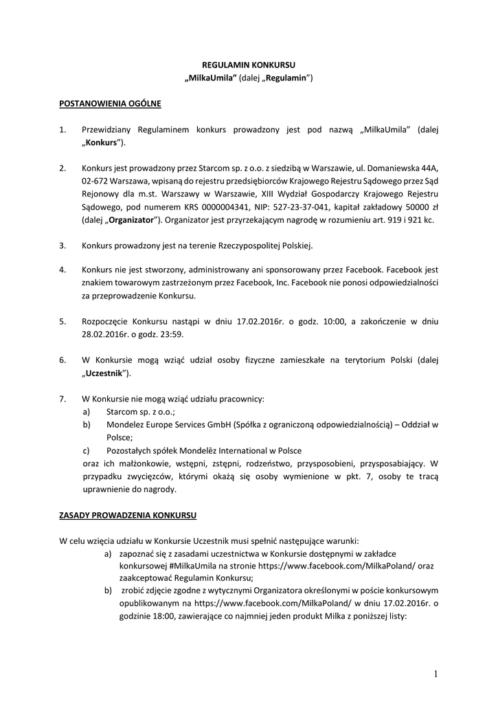 REGULAMIN KONKURSU „MilkaUmila” (dalej „Regulamin”) POSTANOWIENIA OGÓLNE 1. Przewidziany Regulaminem konkurs prowadzony jest pod nazwą „MilkaUmila” (dalej „Konkurs”). 2. Konkurs jest prowadzony przez Starcom sp. z o.o. z siedzibą w Warszawie, ul. Domaniewska 44A, 02-672 Warszawa, wpisaną do rejestru przedsiębiorców Krajowego Rejestru Sądowego przez Sąd Rejonowy dla m.st. Warszawy w Warszawie, XIII Wydział Gospodarczy Krajowego Rejestru Sądowego, pod numerem KRS 0000004341, NIP: 527-23-37-041, kapitał zakładowy 50000 zł (dalej „Organizator”). Organizator jest przyrzekającym nagrodę w rozumieniu art. 919 i 921 kc. 3. Konkurs prowadzony jest na terenie Rzeczypospolitej Polskiej. 4. Konkurs nie jest stworzony, administrowany ani sponsorowany przez Facebook. Facebook jest znakiem towarowym zastrzeżonym przez Facebook, Inc. Facebook nie ponosi odpowiedzialności za przeprowadzenie Konkursu. 5. Rozpoczęcie Konkursu nastąpi w dniu 17.02.2016r. o godz. 10:00, a zakończenie w dniu 28.02.2016r. o godz. 23:59. 6. W Konkursie mogą wziąć udział osoby fizyczne zamieszkałe na terytorium Polski (dalej „Uczestnik”). 7. W Konkursie nie mogą wziąć udziału pracownicy: a) Starcom sp. z o.o.; b) Mondelez Europe Services GmbH (Spółka z ograniczoną odpowiedzialnością) – Oddział w Polsce; c) Pozostałych spółek Mondelēz International w Polsce oraz ich małżonkowie, wstępni, zstępni, rodzeństwo, przysposobieni, przysposabiający. W przypadku zwycięzców, którymi okażą się osoby wymienione w pkt. 7, osoby te tracą uprawnienie do nagrody. ZASADY PROWADZENIA KONKURSU W celu wzięcia udziału w Konkursie Uczestnik musi spełnić następujące warunki: a) zapoznać się z zasadami uczestnictwa w Konkursie dostępnymi w zakładce konkursowej #MilkaUmila na stronie https://www.facebook.com/MilkaPoland/ oraz zaakceptować Regulamin Konkursu; b) zrobić zdjęcie zgodne z wytycznymi Organizatora określonymi w poście konkursowym opublikowanym na https://www.facebook.com/MilkaPoland/ w dniu 17.02.2016r. o godzinie 18:00, zawierające co najmniej jeden produkt Milka z poniższej listy: 1 Milka Sandwich Lu 87g Milka Sandwich Tuc 87g Milka Bubbly Milk 90g Milka Choqsplash Hazelnut 90g Milka Choqsplash Mint 90g Milka Collage Fudge 93g Milka Collage Fruit 93g Milka Bubbly Milk and White 95g Milka Alpine Milk 100g Milka Chips Ahoy 100g Milka Daim 100g Milka Happy Cow 100g Milka Happy Easter 100g Milka Hazelnut 100g Milka Oreo 100g Milka Raisin&Nut 100g Milka Strawberry Yoghurt 100g Milka Sweet Winter 100g Milka Toffee Cream 100g Milka White 100g Milka Yoghurt100g Milka Z Nadz. Malinowym 100g Milka Z Nadz. Wiśniowym 100g Milka Alpine Milk 250g Milka Bubbly Caramel 250g Milka Jelly 250g Milka Wholenuts 250g Milka Alpine Milk 300g Milka Choco&Biscuit 300g Milka Oreo 300g Milka Toffee Wholenuts 300g Milka Triolade 300g Milka Wholenuts 300g Milka Yoghurt 300g 2 c) opublikować zdjęcie, o którym mowa w pkt b) powyżej w jednym z kanałów mediów społecznościowych, m.in. Facebook (o statusie: publiczne ustawienia prywatności), Instagram, Twitter, fora internetowe, blog lub inne. Każde z opublikowanych zdjęć powinno być oznaczone hasztagiem #MILKAUMILA (dalej „Zadanie Konkursowe”); 8. W czasie trwania Konkursu, Uczestnik może zamieścić na kanałach społecznościowych dowolną liczbę Zadań Konkursowych. 9. Organizator zastrzega sobie prawo do wykluczenia z Konkursu Zadania Konkursowego w przypadku: a) zawarcia w Zadaniu Konkursowym wulgaryzmów, treści obraźliwych, politycznych, propagandowych, religijnych lub treści sprzecznych z prawem; b) zawarcia w Zadaniu Konkursowym treści reklamowych dotyczących innych niż Klient podmiotów gospodarczych; c) naruszenia jakichkolwiek praw osób trzecich, w tym w szczególności: dóbr osobistych i praw autorskich oraz prawa do ochrony wizerunku; d) gdy Uczestnik nie posiada praw autorskich lub praw zależnych do Zadania Konkursowego i jego wszystkich elementów w zakresie wskazanym w Regulaminie. 10. Organizator jest uprawniony do wykluczenia Uczestnika z Konkursu w przypadku stwierdzenia, że Uczestnik nie spełnia któregokolwiek z warunków określonych w Regulaminie lub nie przestrzega zasad zawartych w niniejszym Regulaminie, w tym: a) podaje nieprawdziwe dane; b) jego działania są sprzeczne z prawem lub dobrymi obyczajami, zasadami współżycia społecznego, zasadami fair play, stanowią nieuczciwe praktyki, które naruszają uzasadnione interesy Organizatora, godzą w jego wizerunek lub są sprzeczne z prawem lub z innych względów nie nadają się do publicznego rozpowszechniania. Decyzja Organizatora Konkursu w zakresie wykluczenia z Konkursu jest ostateczna. 11. Poprzez przystąpienie do Konkursu Uczestnik oświadcza i gwarantuje, że jest wyłącznie uprawniony do utworów słownych oraz graficznych, które stanowią Zadanie Konkursowe, a prawa do utworów nie są obciążone na rzecz osób trzecich. Ponadto, Uczestnik oświadcza i gwarantuje, że utwory wchodzące w skład Zadania Konkursowego nie naruszają jakichkolwiek praw osób trzecich. NAGRODY 12. Komisja wybierze 500 (pięćset) Zadań Konkursowych, których autorom przyzna nagrodę (dalej „Nagrody”) w postaci 6 produktów Milka Collage i jednego koca – zestaw dla każdego zwycięzcy. Wartość każdego zestawu to 44 zł. 13. Do Nagród dodane są dodatkowe nagrody pieniężne w wysokości 11,11% wartości danej Nagrody. Te nagrody pieniężne nie zostaną wydane zwycięzcom, lecz zostaną odprowadzone przez Organizatora na poczet należnego podatku od osób fizycznych, zgodnie z obowiązującymi 3 przepisami. 14. Jeden Uczestnik może uzyskać prawo tylko do jednej Nagrody. ZASADY WYŁANIANIA ZWYCIĘZCÓW 15. W celu wyłonienia zwycięzców oraz zapewnienia nadzoru nad prawidłowym przebiegiem Konkursu, Organizator powoła komisję konkursową w trzyosobowym składzie (dalej „Komisja”). 16. Komisja będzie oceniać Z