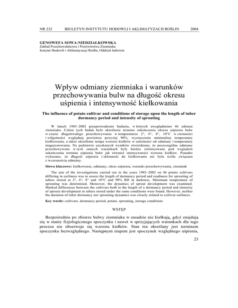 NR 232 BIULETYN INSTYTUTU HODOWLI I AKLIMATYZACJI ROŚLIN 2004 GENOWEFA SOWA-NIEDZIAŁKOWSKA Zakład Przechowalnictwa i Przetwórstwa Ziemniaka Instytut Hodowli i Aklimatyzacji Roślin, Oddział Jadwisin Wpływ odmiany ziemniaka i warunków przechowywania bulw na długość okresu uśpienia i intensywność kiełkowania The influence of potato cultivar and conditions of storage upon the length of tuber dormancy period and intensity of sprouting W latach 1985–2002 przeprowadzono badania, w których uwzględniono 46 odmian ziemniaka. Celem tych badań było określenie terminu zakończenia okresu uśpienia bulw w czasie długotrwałego przechowywania w temperaturze 2°, 6°, 8°, 10°C w ciemności i wilgotności względnej powietrza powyżej 90%, wyznaczenie minimalnej temperatury kiełkowania, a także określenie tempa wzrostu kiełków w zależności od odmiany i temperatury magazynowania. Na podstawie uzyskanych wyników stwierdzono, że poszczególne odmiany przechowywane w tych samych warunkach były bardzo zróżnicowane pod względem zakończenia terminu uśpienia bulw jak również intensywności wzrostu kiełków. Ponadto wykazano, że długość uśpienia i skłonność do kiełkowania nie była ściśle związana z wczesnością odmiany. Słowa kluczowe: kiełkowanie, odmiany, okres uśpienia, warunki przechowywania, ziemniak The aim of the investigations carried out in the years 1985–2002 on 46 potato cultivars differing in earliness was to assess the length of dormancy period and readiness for sprouting of tubers stored at 2°, 6°, 8° and 10°C and 90% RH in darkness. Minimum temperature of sprouting was determined. Moreover, the dynamics of sprout development was examined. Marked differences between the cultivars both in the length of a dormancy period and intensity of sprouts development in tubers stored under the same conditions were found. However, neither the duration of tuber dormancy nor sprouting dynamics was closely related to cultivar earliness. Key words: cultivars, dormancy period, potato, sprouting, storage conditions WSTĘP Bezpośrednio po zbiorze bulwy ziemniaka w zasadzie nie kiełkują, gdyż znajdują się w stanie fizjologicznego spoczynku i nawet w sprzyjających warunkach dla tego procesu nie obserwuje się wzrostu kiełków. Stan ten określany jest terminem spoczynku bezwzględnego. Następnym etapem jest spoczynek względnego uśpienia, 23 Genowefa Sowa-Niedziałkowska na który duży wpływ wywierają warunki przechowywania. Największy wpływ na długość uśpienia bulw ma temperatura w miejscach magazynowania, która może przyspieszać lub hamować proces kiełkowania. Przyjmuje się, że okres uśpienia kończy się wówczas, gdy 80% bulw wytworzy kiełki 3 mm długości (Reust, 1986). Bulwy znajdujące się w stadium uśpienia cechuje niska intensywność procesów fizjologicznych (oddychanie i transpiracja), wysoka wartość odżywcza i jakość kulinarna. Dlatego też głównym zadaniem przechowalnictwa jest maksymalne wydłużenie okresu uśpienia bulw. Na długość okresu uśpienia oddziałują uwarunkowania genetyczne odmiany oraz warunki termiczno-wilgotnościowe w czasie wzrostu i przechowywania bulw (Ittersum, Scholte, 1992; Struik, Wiersema, 1999; Martin, 2002; Sowa-Niedziałkowska, 2002). Przechowywanie bulw ziemniaka w warunkach niskich temperatur powoduje wydłużenie ich uśpienia, wzrost kiełków jest powolniejszy, a u niektórych odmian wręcz zahamowany. Jednakże przechowywanie ziemniaków w tych warunkach jest kosztowne, gdyż wiąże się z wyposażeniem obiektów przechowalniczych w agregaty chłodnicze, ponieważ nie zawsze naturalne warunki klimatyczne mogą być wykorzystane dla osiągnięcia pożądanej temperatury. Dotyczy to zwłaszcza miesięcy: kwiecień, maj i czerwiec. Niskie temperatury magazynowania skutecznie wydłużają okres uśpienia i ograniczają proces kiełkowania, ale sprzyjają gromadzeniu cukrów i pogarszają jakość kulinarną bulw. Z kolei w otoczeniu wyższych temperatur, skracany jest okres uśpienia bulw, tym samym proces kiełkowania rozpoczyna się wcześniej i wzrost kiełków jest intensywniejszy. W związku z tym ubytki naturalne spowodowane procesami oddychania i transpiracji gwałtownie wzrastają, ponieważ wydalanie wody przez kiełki jest intensywniejsze niż przez perydermę bulw. Konsekwencją wzmożonych procesów życiowych jest nie tylko wzrost ubytków masy bulw, ale także utrata turgoru. Bulwy stają się gąbczaste i bardziej podatne na ciemnienie miąższu. We wszystkich asortymentach ziemniaka jadalnego, zarówno przeznaczonego bezpośrednio do konsumpcji jak również kierowanego do przetwórstwa spożywczego, wymagane są wyższe temperatury przechowywania, celem utrzymania dobrej jakości w czasie całego okresu magazynowania. Przemysł przetwórczy wymaga przechowywania bulw ziemniaka w temperaturze 6–8°C, a nawet i wyższej, ze względu na konieczność utrzymania niskiej zawartości cukrów redukujących (Zgórska, Frydecka-Mazurczyk, 2000). Jednakże przy tej temperaturze składowania występuje nadmierny wzrost kiełków i intensywne wydalanie wody z bulw. W krajach o rozwiniętym przetwórstwie ziemniaczanym, jednym z podstawowych zabiegów w czasie przechowywania w warunkach wyższych temperatur jest zapobieganie kiełkowaniu bulw przy użyciu środków hamujących ten proces. Są to najczęściej następujące substancje chemiczne: estry izopropylowe kwasu fenylokarbaminowego (karbaminiany izopropylowe), tj. IPC — izopropylo-Nfenylokarbaminian i CIPC — izopropylo-N-3-chlorofenylokarbaminian oraz maleinowego kwasu hydrazyd lub jego sole. 24 Genowefa Sowa-Niedziałkowska W Polsce zarejestrowane są następujące preparaty chemiczne ograniczające wzrost kiełków (zalecenia IOR): — stosowane w okresie wegetacji, których substancją biologicznie czynną jest melainowego kwasu hydrazyd — Fazor 80 SG i Elnoch 39 EC; — stosowane w czasie przechow