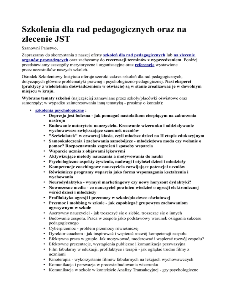 Szkolenia dla rad pedagogicznych oraz na zlecenie JST Szanowni Państwo, Zapraszamy do skorzystania z naszej oferty szkoleń dla rad pedagogicznych lub na zlecenie organów prowadzących oraz zachęcamy do rezerwacji terminów z wyprzedzeniem. Poniżej przedstawiamy szczegóły merytoryczne i organizacyjne oraz referencje wystawione przez uczestników naszych szkoleń. Ośrodek Szkoleniowy Instytutu oferuje szeroki zakres szkoleń dla rad pedagogicznych, dotyczących głównie problematyki prawnej i psychologiczno-pedagogicznej. Nasi eksperci (praktycy z wieloletnim doświadczeniem w oświacie) są w stanie zrealizować je w dowolnym miejscu w kraju. Wybrane tematy szkoleń (najczęściej zamawiane przez szkoły/placówki oświatowe oraz samorządy; w wypadku zainteresowania inną tematyką - prosimy o kontakt): • szkolenia psychologiczne : • Depresja jest bolesna - jak pomagać nastolatkom cierpiącym na zaburzenia nastroju • Budowanie autorytetu nauczyciela. Kreowanie wizerunku i oddziaływanie wychowawcze zwiększające szacunek uczniów • "Sześciolatek" w czwartej klasie, czyli młodsze dzieci na II etapie edukacyjnym • Samookaleczenia i zachowania samobójcze - młodzieżowa moda czy wołanie o pomoc? Rozpoznawania zagrożeń i sposoby wsparcia • Wsparcie ucznia z objawami lękowymi • Aktywizujące metody nauczania a motywowania do nauki • Psychologiczne aspekty żywienia, nadwagi i otyłości dzieci i młodzieży • Kompetencje coachingowe nauczyciela rozwijające potencjał uczniów • Rówieśnicze programy wsparcia jako forma wspomagania kształcenia i wychowania • Neurodydaktyka - wymysł marketingowy czy nowy horyzont dydaktyki? • Nowoczesne media - co nauczyciel powinien wiedzieć o agresji elektronicznej wśród dzieci i młodzieży • Profilaktyka agresji i przemocy w szkole/placówce oświatowej • Przemoc i mobbing w szkole - jak zapobiegać grupowym zachowaniom agresywnym w szkole • Asertywny nauczyciel - jak troszczyć się o siebie, troszcząc się o innych • Budowanie zespołu. Praca w zespole jako podstawowy warunek osiągania sukcesu pedagogicznego • Cyberprzemoc - problem przemocy rówieśniczej • Dyrektor coachem - jak inspirować i wspierać rozwój kompetencji zespołu • Efektywna praca w grupie. Jak motywować, moderować i wspierać rozwój zespołu? • Efektywne prezentacje, wystąpienia publiczne i komunikacja perswazyjna • Film fabularny w edukacji, profilaktyce i terapii - jak oglądać trudne filmy z uczniami • Kinoterapia - wykorzystanie filmów fabularnych na lekcjach wychowawczych • Komunikacja i perswazja w procesie budowania wizerunku • Komunikacja w szkole w kontekście Analizy Transakcyjnej - gry psychologiczne uczniów, nauczycieli i rodziców • Komunikacja wewnętrzna i zewnętrzna w sytuacji kryzysowej w szkole • Mistrzowskie prezentacje i wystąpienia publiczne - jak przemawiać na forum i osiągać cele • Motywowanie nauczycieli do pracy Motywowanie uczniów do nauki Nauczyciel coachem - jak inspirować i wspierać rozwój kompetencji uczniów Praca z uczniem o specjalnych wymaganiach Prowadzenie zebrań i procesy grupowego podejmowania decyzji - jak organizować i wspierać pracę zespołu • Rozwiązywanie konfliktów i mediacje szkolne - jak rozwiązywać szkolne konflikty z pożytkiem dla wszystkich • Skuteczny lider, czyli sukces szkoły jako wynik efektywnego zarządzania i motywowania • • • • • • • • • • Świadoma komunikacja w szkole - jak się komunikować, by osiągać cele Trudny rodzic w szkole - jak zamienić walkę we współpracę Współczesna młodzież wobec zagrożeń cywilizacyjnych Zapobieganie wypaleniu zawodowemu nauczycieli i stresowi w pracy Zastosowanie technik behawioralnych w pracy z uczniem o zaburzonym zachowaniu • i wiele innych... • szkolenia prawne i inne : • Zadania dyrektora, rad pedagogicznych i organów prowadzących wynikające z ostatnich zmian w prawie oświatowym (m.in.: ocenianie, egzaminy, kształcenie specjalne w szkołach ogólnodostępnych, przyjmowanie uczniów w trakcie roku szkolnego, dokumentacja przebiegu nauczania • Zarządzanie szkołą/placówką - relacje dyrektora szkoły i organu prowadzącego: obszary współpracy i podział kompetencji • Zagrożenie terrorystyczne w szkołach i placówkach oświatowych - procedury i odpowiedzialność za zapewnienie bezpieczeństwa uczniów • Marketingowe spojrzenie na szkołę, czyli promocja szkoły, budowanie wizerunku, co wpływa na nabór • Jak oceniać, aby motywować uczniów do nauki? • Ochrona danych osobowych oraz podstawy prawne ich przetwarzania • Udostępnianie informacji publicznej • EWD (Edukacyjna Wartość Dodana) i PWE (Porównywalne Wyniki Egzaminów) jako miary efektywności pracy szkoły • Prawa i obowiązki nauczycieli i szkoły wobec agresji uczniów • Przepisy prawa wsparciem dla procesu zarządzania w przedszkolu, szkole, placówce • Prawne i emocjonalne konsekwencje decyzji dyrektora związane ze zmianami organizacyjnymi w szkołach i placówkach oświatowych • Bezpieczeństwo uczniów w szkole. Zadania i obowiązki oraz odpowiedzialność dyscyplinarna, karna, cywilna i materialna nauczyciela • Diagnoza dla rozwoju - wykorzystanie wyników oceniania szkolnego i zewnętrznego • Ewaluacja jako narzędzie do autentycznego podnoszenia jakości pracy nauczyciela, wychowawcy, szkoły • Ewaluacja wewnętrzna i zewnętrzna w szkole • Gospodarowanie rzeczowym majątkiem oświatowym • Jak trafnie i efektywnie wykorzystywać wyniki egzaminów? • Koncepcja pracy szkoły - strona formalna i znaczenie dla funkcjonowania szkoły • Kontrola realizacji obowiązku szkolnego i obowiązku nauki • Kontrola zarządcza w szkole/placówce oświatowej • Nowatorstwo i innowacje w szkole • Obowiązki dyrektora szkoły wynikające z Karty Nauczyciela i Kodeksu pracy w świetle obowiązujących przepisów i planowanych zmian • Ocenia