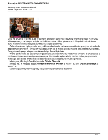 Poznajcie MISTRZA MITOLOGII GRECKIEJ. Wpisany przez Małgorzata Worach środa, 16 grudnia 2015 11:07 Dnia 15 grudnia o godz. 8.55 w czytelni biblioteki szkolnej odbył się finał Szkolnego Konkursu Mitologicznego, w którym wzięło udział 6 uczniów z klas pierwszych. Uzyskali oni minimum 80% możliwych do zdobycia punktów w części pisemnej. Celem konkursu było przede wszystkim rozbudzenie zainteresowań kulturą antyku, utrwalenie popularnych zwrotów i wyrażeń wywodzących się z mitologii oraz nauka szlachetnej rywalizacji. Przygotowały go p. Małgorzata Worach i p. Anna Sękulska. Warto podkreślić, że poziom przygotowania uczestników był niezwykle wysoki, a rywalizacja o czołowe miejsca naprawdę emocjonująca. Uczniowie wykazali się bardzo dobrą znajomością mitologii, ponieważ znakomicie odpowiadali na szczegółowe i trudne pytania. Mistrzynią Mitologii Greckiej została Oliwia Chudzik z klasy 1d. II miejsce zajęła Wiktoria Błońska- Pleban z klasy 1 d, a III Olga Kowalczyk z klasy 1 a. Dziewczęta otrzymały nagrody książkowe i pamiątkowe dyplomy. 1/1