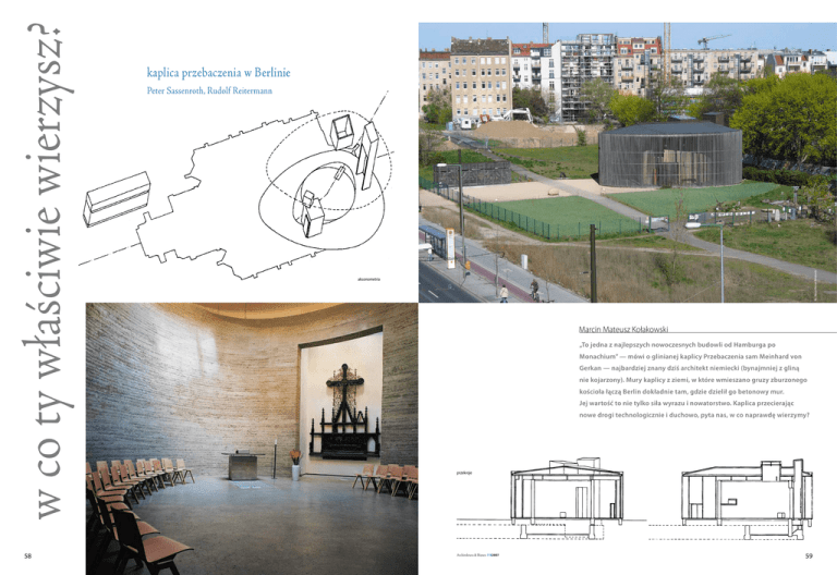 Peter Sassenroth, Rudolf Reitermann fot.: Marcin Mateusz Kołakowski w co ty właściwie wierzysz? 58 kaplica przebaczenia w Berlinie aksonometria Marcin Mateusz Kołakowski „To jedna z najlepszych nowoczesnych budowli od Hamburga po Monachium” — mówi o glinianej kaplicy Przebaczenia sam Meinhard von Gerkan — najbardziej znany dziś architekt niemiecki (bynajmniej z gliną nie kojarzony). Mury kaplicy z ziemi, w które wmieszano gruzy zburzonego kościoła łączą Berlin dokładnie tam, gdzie dzielił go betonowy mur. Jej wartość to nie tylko siła wyrazu i nowatorstwo. Kaplica przecierając nowe drogi technologicznie i duchowo, pyta nas, w co naprawdę wierzymy? przekroje Architektura & Biznes 7/82007 Architektura & Biznes 7/82007 59 w co ty właściwie wierzysz? KAPLICA PRZEBACZENIA Berlin INWESTOR Evangelische Versöhnungsgemeinde PROJEKT Peter Sassenroth, Rudolf Reitermann Wykonanie, artystyczne modelowanie gliny i kolorystyka Martin Rauch, Baukunst GmbH Schlins/Österreich wraz z woluntariuszami z 14 krajów Europy KONSTRUKCJA TU-Berlin Fachbereich Architektur Klaus Dierks, Christof Ziegert KALENDARIUM — projekt: 1999 — realizacja: 2000 POWIERZCHNIA UŻYTKOWA: 100 m2 KOSZT: 971 454 euro trudno uniknąć wrażenia, że wyrażają one przede wszystkim kompleksy i lęk, a jeśli już wiarę, to w siłę, wielkość i historię. Obawiam się, że wbrew zamierzeniom twórców, mogą się oni przyczynić (jak w moim przypadku) do kilku raczej od- niż nawróceń. Tym bardziej budujące jest zobaczenie innych przykładów… Proszę pozwolić, że zacznę od wyznania nietypowego dla prasy branżowej, istotnego wszakże dla poruszonego w tym numerze tematu. Zawsze intrygowało mnie, jak wierzą ci, którzy tworzą kościoły. Myślę, że i Czytelnik ma prawo zadać to pytanie piszącym o kościołach. Odpowiadam: kiedyś byłem osobą bardzo religijną. Chciałem nawet zostać księdzem. Wśród powodów, o których mówić tu nie będę, to właśnie architektura przyczyniła się ostatecznie do tego, że wierzyć przestałem. Chcąc ratować wiarę, postanowiłem pojechać do Watykanu. O ile jednak wchodząc do Bazyliki św. Piotra tliła się ona we mnie, o tyle wyszedłem stamtąd jako ateista. Przepych i wielkość widziałem jako nieszczerość. Miałem wrażenie, że wszyscy chcą, bym wierzył, ale nikt nie wierzy we mnie. Zachowując szacunek do mądrości zawartych w religiach, lubiłem jednak potem już jako niewierzący odwiedzać kościoły. Wchodząc do kaplicy Przebaczenia w Berlinie, rozmawiając z tamtejszym pastorem i parafianami, przeżyłem uczucie odwrotne niż to watykańskie. Nie, nie tyle że znów chciałem zostać księdzem. Nie uwierzyłem też od razu w Boga. Uwierzyłem jednak w ludzi tworzących ten kościół i w to, że oni wierzą we mnie. W obydwóch wypadkach architektura miała znaczenie zasadnicze. Od tego czasu myślę, że budynki sakralne mówią dużo więcej o ludziach niż o Bogu. Historia moja niech będzie przestrogą dla niewierzących w znaczenie architektury. Widząc współczesne polskie giganto-sakralne tryumfy, Czy wierzysz w symbol? fot.: Marcin Mateusz Kołakowski poniżej: obejście, zamknięte żaluzją pionowych drewnianych listew, to doskonałe miejsce nieformalnych spotkań Czy wierzysz w architekturę? 60 Niezwykłą dynamikę wnętrza tworzą dwie przecinające się osie. Jedna kontynuuje oś byłego kościoła, a wyznacza ją nisza z ocalałą nastawą dawnego ołtarza i świetlik, druga natomiast, położona na osi wschód-zachód wyznacza wejście i nowy ołtarz, który stoi w miejscu poprzedniego, lecz jest inaczej zorientowany. Nowa oś przywołuje przedchrześcijańską tradycję. Rytuał orientowania kościołów ku wschodowi, opisany już przez Witruwiusza wiek przed narodzinami Chrystusa, w średniowieczu miał ucieleśniać uzgodnienie porządku kosmicznego i ziemskiego. W berlińskiej kaplicy nowa oś również wyraża pragnienie uzgodnienia tych porządków, mimo politycznych zawieruch. Choć kaplica Przebaczenia wpisywana jest dziś w kanon architektury współczesnej, to jej historia sięga Augusty Wiktorii — ostatniej cesarzowej Niemiec, która przekazała parafii klucze w 1894 roku. Co ciekawe, zachowany z tego okresu ołtarz przypomina podobny, znajdujący się w kościele Zbawiciela w Katowicach-Szopienicach, a to dlatego, że ufundowała go ta sama cesarzowa, symbolicznie podkreślając zasięg cesarstwa. Po pół wieku świątynię przykrył cień innego symbolu — swastyki. Jej zwolennicy dzielili i niszczyli kościół od wewnątrz, a walczący z nimi burzyli go od zewnątrz. Częściowo odbudowana w latach 50. świątynia poddana została kolejnej próbie. Trasa budowanego w 1961 roku berlińskiego muru przechodziła dokładnie przez budynek kościoła. Znalazł się on w „martwej strefie” — zaoranym, strzeżonym pasie pomiędzy murami. Dla władz NRD kościół — pod tak symbolicznym wezwaniem — był cierniem w oku. W 1985 roku „w celu poprawy bezpieczeństwa i porządku” został wysadzony w powietrze. Barbarzyński akt na żywo pokazywało wiele stacji telewizyjnych na świecie. Pod murem, z zachodniej strony artyści organizowali happeningi i przedstawienia. Sztukę pt. „Mówiąc do ściany” Manfred Fisher kończył proroczym mottem: „symbole mają moc przemieniania niemożliwego w możliwe”. Za niecałe pięć lat w okolicznościach dużo radośniejszych mur runął. W sąsiedztwie miało powstać centrum dokumentacji poświęcone murowi berlińskiemu z zachowanym siedemdziesięciopięciometrowym jego odcinkiem. Narodziła się idea nowego symbolu — kaplicy w miejscu dawnego kościoła. Przy budowach kościołów aktywność parafian ogranicza się zwykle do ofiarowania składek i wysłuchiwania ogłoszeń duszpasterskich. Tym razem pastor wierzył jednak nie tylko w Boga i ekspertów, lecz także w ludzi. Chciał, by świątynia rosła wraz z parafianami. To on