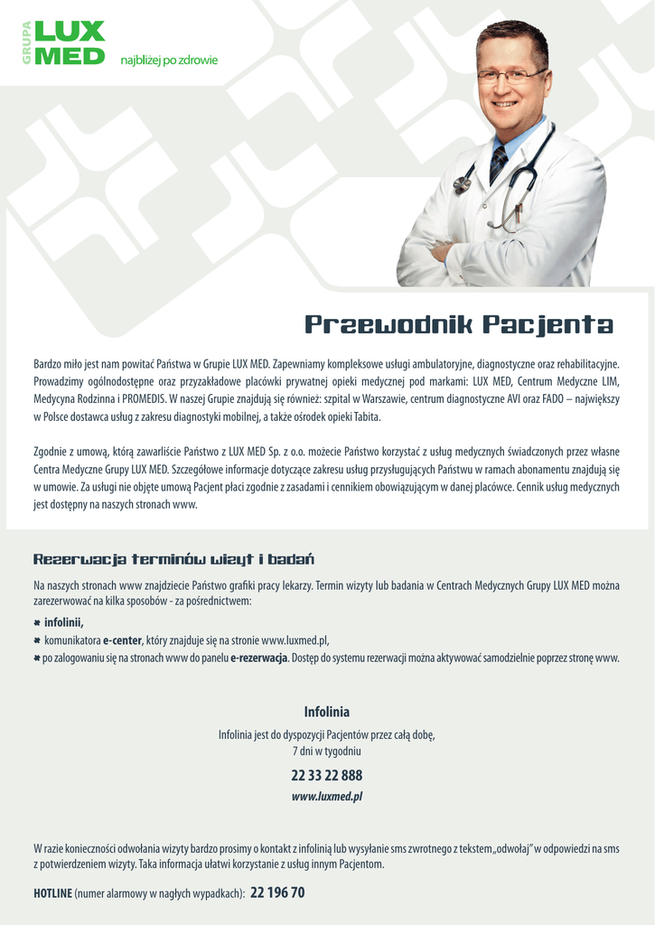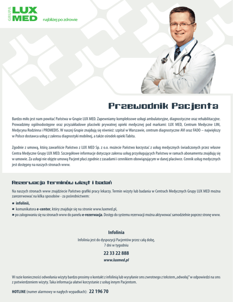 Bardzo miło jest nam powitać Państwa w Grupie LUX MED. Zapewniamy kompleksowe usługi ambulatoryjne, diagnostyczne oraz rehabilitacyjne. Prowadzimy ogólnodostępne oraz przyzakładowe placówki prywatnej opieki medycznej pod markami: LUX MED, Centrum Medyczne LIM, Medycyna Rodzinna i PROMEDIS. W naszej Grupie znajdują się również: szpital w Warszawie, centrum diagnostyczne AVI oraz FADO – największy w Polsce dostawca usług z zakresu diagnostyki mobilnej, a także ośrodek opieki Tabita. Zgodnie z umową, którą zawarliście Państwo z LUX MED Sp. z o.o. możecie Państwo korzystać z usług medycznych świadczonych przez własne Centra Medyczne Grupy LUX MED. Szczegółowe informacje dotyczące zakresu usług przysługujących Państwu w ramach abonamentu znajdują się w umowie. Za usługi nie objęte umową Pacjent płaci zgodnie z zasadami i cennikiem obowiązującym w danej placówce. Cennik usług medycznych jest dostępny na naszych stronach www. Rezerwacja terminów wizyt i badan Na naszych stronach www znajdziecie Państwo grafiki pracy lekarzy. Termin wizyty lub badania w Centrach Medycznych Grupy LUX MED można zarezerwować na kilka sposobów - za pośrednictwem: infolinii, komunikatora e-center, który znajduje się na stronie www.luxmed.pl, po zalogowaniu się na stronach www do panelu e-rezerwacja. Dostęp do systemu rezerwacji można aktywować samodzielnie poprzez stronę www. Infolinia Infolinia jest do dyspozycji Pacjentów przez całą dobę, 7 dni w tygodniu 22 33 22 888 www.luxmed.pl W razie konieczności odwołania wizyty bardzo prosimy o kontakt z infolinią lub wysyłanie sms zwrotnego z tekstem „odwołaj” w odpowiedzi na sms z potwierdzeniem wizyty. Taka informacja ułatwi korzystanie z usług innym Pacjentom. HOTLINE (numer alarmowy w nagłych wypadkach): 22 196 70 Zwolnienia lekarskie Do wystawienia zwolnienia lekarskiego niezbędne są dane: PESEL i NIP Pacjenta, a także NIP zakładu pracy. Recepta na leki refundowane Do uzyskania recepty na leki refundowane konieczne jest przedłożenie lekarzowi aktualnego dokumentu potwierdzającego prawo do świadczeń opieki zdrowotnej finansowanych ze środków NFZ, w szczególności dokumentu potwierdzającego opłacenie składki ubezpieczenia zdrowotnego. Karta Pacjenta Każdy Pacjent Grupy LUX MED otrzymuje Kartę Pacjenta, która zawiera indywidualny, unikalny numer Pacjenta. Karta potwierdza prawo do korzystania z usług medycznych w placówkach własnych Grupy LUX MED na terenie całego kraju. Dostęp do poszczególnych sieci placówek własnych jest określony w umowie. Karty Pacjenta są przesyłane w ciągu 30 dni roboczych od aktywacji usług medycznych na adres korespondencyjny wskazany w Umowie przez Zleceniodawcę. Do czasu otrzymania Karty Pacjenta korzystanie z usług odbywa się na podstawie wpisu w systemie informatycznym po okazaniu dowodu tożsamości. Kartę, łącznie z dowodem tożsamości należy okazywać w recepcji, podczas każdej wizyty w placówce Dzia Badania Satysfakcji Klienta Państwa opinia jest dla nas bardzo ważna. Wszelkie uwagi oraz sugestie prosimy przesyłać e-mailem pod adres: [email protected] lub skorzystać z Ankiety Satysfakcji Klienta dostępnej na stronach www albo w Centrach Medycznych. Dzia Sprzeda y Telefonicznej Jeżeli są Państwo zainteresowani szczegółami oferty Grupy LUX MED lub zastanawiają się Państwo nad wykupieniem, zmianą, przedłużeniem pakietu opieki medycznej dla Klientów Indywidualnych, prosimy o kontakt: tel.: 22 339 37 33, e-mail: [email protected] Informacja Zachęcamy do korzystania z naszych stron www, gdzie można znaleźć informacje m.in. o przygotowaniu do badań, godzinach pracy placówek, grafikach konsultacjil lekarskich, realizowanych przez nas akcjach promocyjnych i profilaktycznych, a także przeczytać ciekawe artykuły i wywiady dotyczące zdrowia.