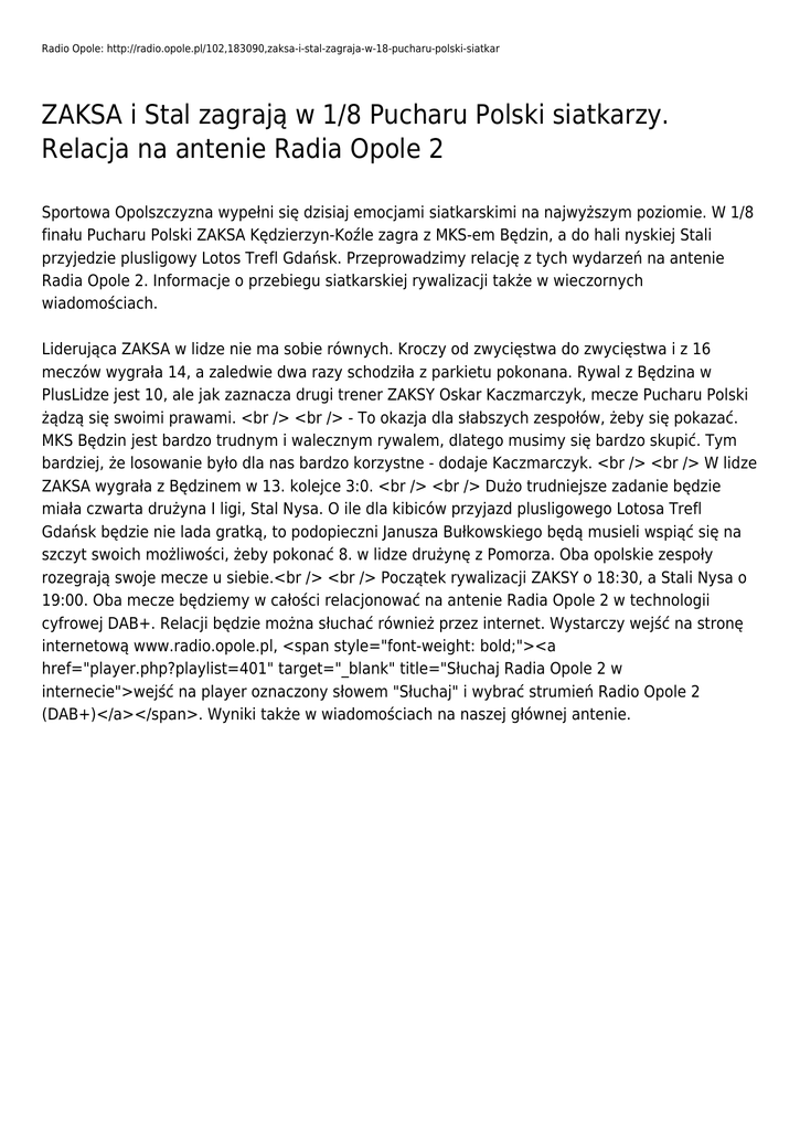 Radio Opole: http://radio.opole.pl/102,183090,zaksa-i-stal-zagraja-w-18-pucharu-polski-siatkar ZAKSA i Stal zagrają w 1/8 Pucharu Polski siatkarzy. Relacja na antenie Radia Opole 2 Sportowa Opolszczyzna wypełni się dzisiaj emocjami siatkarskimi na najwyższym poziomie. W 1/8 finału Pucharu Polski ZAKSA Kędzierzyn-Koźle zagra z MKS-em Będzin, a do hali nyskiej Stali przyjedzie plusligowy Lotos Trefl Gdańsk. Przeprowadzimy relację z tych wydarzeń na antenie Radia Opole 2. Informacje o przebiegu siatkarskiej rywalizacji także w wieczornych wiadomościach. Liderująca ZAKSA w lidze nie ma sobie równych. Kroczy od zwycięstwa do zwycięstwa i z 16 meczów wygrała 14, a zaledwie dwa razy schodziła z parkietu pokonana. Rywal z Będzina w PlusLidze jest 10, ale jak zaznacza drugi trener ZAKSY Oskar Kaczmarczyk, mecze Pucharu Polski żądzą się swoimi prawami. <br /> <br /> - To okazja dla słabszych zespołów, żeby się pokazać. MKS Będzin jest bardzo trudnym i walecznym rywalem, dlatego musimy się bardzo skupić. Tym bardziej, że losowanie było dla nas bardzo korzystne - dodaje Kaczmarczyk. <br /> <br /> W lidze ZAKSA wygrała z Będzinem w 13. kolejce 3:0. <br /> <br /> Dużo trudniejsze zadanie będzie miała czwarta drużyna I ligi, Stal Nysa. O ile dla kibiców przyjazd plusligowego Lotosa Trefl Gdańsk będzie nie lada gratką, to podopieczni Janusza Bułkowskiego będą musieli wspiąć się na szczyt swoich możliwości, żeby pokonać 8. w lidze drużynę z Pomorza. Oba opolskie zespoły rozegrają swoje mecze u siebie.<br /> <br /> Początek rywalizacji ZAKSY o 18:30, a Stali Nysa o 19:00. Oba mecze będziemy w całości relacjonować na antenie Radia Opole 2 w technologii cyfrowej DAB+. Relacji będzie można słuchać również przez internet. Wystarczy wejść na stronę internetową www.radio.opole.pl, <span style="font-weight: bold;"><a href="player.php?playlist=401" target="_blank" title="Słuchaj Radia Opole 2 w internecie">wejść na player oznaczony słowem "Słuchaj" i wybrać strumień Radio Opole 2 (DAB+)</a></span>. Wyniki także w wiadomościach na naszej głównej antenie.
