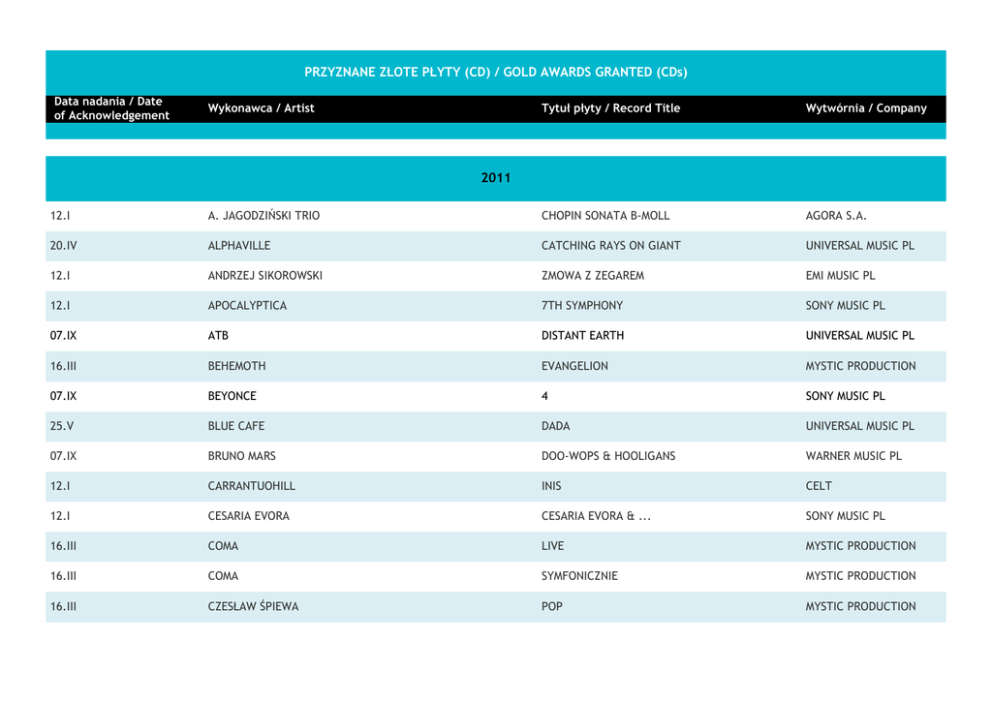 PRZYZNANE ZŁOTE PŁYTY (CD) / GOLD AWARDS GRANTED (CDs) Data nadania / Date of Acknowledgement Wykonawca / Artist Tytuł płyty / Record Title Wytwórnia / Company 2011 12.I A. JAGODZIŃSKI TRIO CHOPIN SONATA B-MOLL AGORA S.A. 20.IV ALPHAVILLE CATCHING RAYS ON GIANT UNIVERSAL MUSIC PL 12.I ANDRZEJ SIKOROWSKI ZMOWA Z ZEGAREM EMI MUSIC PL 12.I APOCALYPTICA 7TH SYMPHONY SONY MUSIC PL 07.IX ATB DISTANT EARTH UNIVERSAL MUSIC PL 16.III BEHEMOTH EVANGELION MYSTIC PRODUCTION 07.IX BEYONCE 4 SONY MUSIC PL 25.V BLUE CAFE DADA UNIVERSAL MUSIC PL 07.IX BRUNO MARS DOO-WOPS & HOOLIGANS WARNER MUSIC PL 12.I CARRANTUOHILL INIS CELT 12.I CESARIA EVORA CESARIA EVORA & ... SONY MUSIC PL 16.III COMA LIVE MYSTIC PRODUCTION 16.III COMA SYMFONICZNIE MYSTIC PRODUCTION 16.III CZESŁAW ŚPIEWA POP MYSTIC PRODUCTION PRZYZNANE ZŁOTE PŁYTY (CD) / GOLD AWARDS GRANTED (CDs) Data nadania / Date of Acknowledgement Wykonawca / Artist Tytuł płyty / Record Title Wytwórnia / Company 16.III CZESŁAW ŚPIEWA TESCO VALUE MYSTIC PRODUCTION 12.I DIANA KRALL HEARTDROPS UNIVERSAL MUSIC PL 15.VII DODA 7 POKUS GŁÓWNYCH UNIVERSAL MUSIC PL 12.I DŻEM MUZA AGENCJA KONCERTOWA L. MARTINEK 16.III ELDO NNIE PYTAJ O NIĄ MY MUSIC GROUP 30.III ENRIQUE IGLESIAS EUPHORIA UNIVERSAL MUSIC PL 25.V FIRMA NASZA BROŃ TO NASZA PASJA FONOGRAFIKA 16.III GABA KULKA HAT MEET RABBIT MYSTIC PRODUCTION 16.III GRZEGORZ TURNAU FABRYKA KLAMEK MYSTIC PRODUCTION 16.III HAPPYSAD MÓW MI DOBRZE MYSTIC PRODUCTION 25.V HEMP GRU JEDNOŚĆ FONOGRAFIKA 07.IX HUGH LAURIE LET THEM TALK WARNER MUSIC PL 07.IX JAMES BLUNT SOME KIND OF TROUBLE WARNER MUSIC PL 16.III JAN GARBAREK GROUP JAN GARBAREK GROUP UNIVERSAL MUSIC PL 07.IX JAN TREBUNIA TUTKA I MIREK KOWALIK DROGA DO CIEBIE - PIOSENKI PRZYBORY 4EVER MUSIC 07.IX JEAN MICHAEL JARRE ESSENTIALS & RARITIES DREAM MUSIC PRZYZNANE ZŁOTE PŁYTY (CD) / GOLD AWARDS GRANTED (CDs) Data nadania / Date of Acknowledgement Wykonawca / Artist Tytuł płyty / Record Title Wytwórnia / Company 29.VII LADY PANK MARATON SONY MUSIC PL 07.IX MACIEJ MALEŃCZUK Z ZESPOŁEM PSYCHODANCING WYSOCKI MALEŃCZUKA WARNER MUSIC PL 07.IX MAGDA UMER KOLEKCJA 20-LECIA POMATONU EMI MUSIC PL 07.IX MARCIN WASILEWSKI TRIO FAITHFUL UNIVERSAL MUSIC PL 20.IV MAREK TORZEWSKI L'AMORE EMI MUSIC PL 16.III MATT DUSK GOOD NEWS UNIVERSAL MUSIC PL 25.V MICHAŁ LORENC JAN PAWEŁ II - SZUKAŁEM WAS POLSKIE RADIO S.A. 25.V MICHAŁ LORENC RÓŻYCZKA - MUZYKA FILMOWA POLSKIE RADIO S.A. 15.VI MYSLOVITZ NIEWAŻNE JAK WYSOKO JESTEŚMY CHAOS 07.IX PAT METHENY WHAT’S IT ALL ABOUT WARNER MUSIC PL 12.I PROJEKT OSTRY EMADE ZŁODZIEJE ZAPALNICZEK ASFALT RECORDS 16.III RAZ DWA TRZY DWADZIEŚCIA 4EVER MUSIC 07.IX RED HOT CHILLI PEPPERS I'M WITH YOU WARNER MUSIC PL 16.III RIVERSIDE ANNO DOMINI HIGH DEFINITION MYSTIC PRODUCTION 16.III ROBERT M. GOLD MY MUSIC GROUP 07.IX RÓŻNI WYKONAWCY (VARIOUS) THE BEST OPERA EMI MUSIC PL PRZYZNANE ZŁOTE PŁYTY (CD) / GOLD AWARDS GRANTED (CDs) Data nadania / Date of Acknowledgement Wykonawca / Artist Tytuł płyty / Record Title Wytwórnia / Company 07.IX RÓŻNI WYKONAWCY (VARIOUS) RMF FM MUZYKA NAJLEPSZA POD SŁOŃCEM 2011 EMI MUSIC PL 16.III RÓŻNI WYKONAWCY (VARIOUS) THE BEST MUSICALS...EVER! EMI MUSIC PL 07.IX RÓŻNI WYKONAWCY (VARIOUS) PINCODE SONIC 25.V RÓŻNI WYKONAWCY (VARIOUS) PINCODE SONIC 16.III RÓŻNI WYKONAWCY (VARIOUS) GREATEST HITS VOL.1 RADIO ZET SONY MUSIC PL 16.III RÓŻNI WYKONAWCY (VARIOUS) MAREK SIEROCKI PRZEDSTAWIA: I LOVE LATINO SONY MUSIC PL 25.V RÓŻNI WYKONAWCY (VARIOUS) RMF NAJLEPSZA MUZYKA NA WIOSNĘ SONY MUSIC PL 07.IX RÓŻNI WYKONAWCY (VARIOUS) BRAVO HITS LATO 2011 UNIVERSAL MUSIC PL 07.IX RÓŻNI WYKONAWCY (VARIOUS) ZET LATO 2011 UNIVERSAL MUSIC PL 16.III RÓŻNI WYKONAWCY (VARIOUS) IMPRESKA VOL.5 UNIVERSAL MUSIC PL 16.III RÓŻNI WYKONAWCY (VARIOUS) IN THE MIX 6 UNIVERSAL MUSIC PL 20.IV RÓŻNI WYKONAWCY (VARIOUS) IMPRESKA VOL.6 UNIVERSAL MUSIC PL 07.IX RÓŻNI WYKONAWCY (VARIOUS) - ARTYŚCI TEATRU ROMA LES MISERABLES TEATR MUZYCZNY ROMA 25.V SABATON COAT OF ARMS WARNER MUSIC PL 16.III SELENA GOMEZ YEAR WITHOUT RAIN UNIVERSAL MUSIC PL 16.III STARE DOBRE MAŁŻEŃSTWO BLUES NOCY BIESZCZADZKIEJ EMI MUSIC PL PRZYZNANE ZŁOTE PŁYTY (CD) / GOLD AWARDS GRANTED (CDs) Data nadania / Date of Acknowledgement Wykonawca / Artist Tytuł płyty / Record Title Wytwórnia / Company 30.III WWO WITAM WAS W RZECZYWISTOŚCI FONOGRAFIKA 25.V ZESPÓŁ PIEŚNI I TAŃCA "ŚLĄSK" ALBOŚMY TO JACY TACY - ZŁOTA KOLEKCJA ZPIT ŚLĄSK 2010 03.III A. PIASECZNY / S. KRAJEWSKI NA PRZEKÓR NOWYM CZASOM SONY MUSIC PL 05.V AC / DC IRON MAN 2 SONY MUSIC PL 03.III ALICIA KEYS THE ELEMENT OF FREEDOM SONY MUSIC PL 16.VI ANIA WYSZKONI PAN I PANI ROCK HOUSE 13.I ANITA LIPNICKA HARD LAND OF WONDER EMI MUSIC PL 01.XII ANNA JANTAR WIELKA DAMA EMI MUSIC PL 16.VI ARCHIVE CONTROLLING CROWDS WARNER MUSIC PL 15.XII ARMIN VAN BUUREN MIRAGE SONY MUSIC PL 08.IX ATB SUNSET BEACH DJ SESSION UNIVERSAL MUSIC PL 05.V ATB THE DJ - IN THE MIX 5 UNIVERSAL MUSIC PL 08.XII BON JOVI GREATEST HITS - ULTIMATE COLLECTION UNIVERSAL MUSIC PL 13.I BUDKA SUFLERA ZAWSZE CZEGOŚ BRAK WYDAWNICTWO BAUER PRZYZNANE ZŁOTE PŁYTY (CD) / GOLD AWARDS GRANTED (CDs) Data nadania / Date of Acknowledgement Wykonawca / Artist Tytuł płyty / Record Title Wytwórnia / Company 13.X CARLOS SANTANA GUITAR HEAVEN...THE GREATEST GUITAR CLASSICS... SONY MUSIC PL 01.XII CARO EMERALD DELETED SCENES FROM CUTTING ROOM FLOOR UNIVERSAL MUSIC PL 16.VI CITY OF PRAGUE PHILHARMONIC ORCHESTRA CHARLIE CHAPLIN AGORA S.A. 16.VI CITY OF PRAGUE PHILHARMONIC ORCHESTRA HANS ZIMMER AGORA S.A. 16.VI CITY OF PRAGUE PHILHARMONIC ORCHESTRA JOHN BARRY AGORA S.A. 16.VI CITY OF PRAGUE PHILHARMONIC ORCHESTRA JOHN WILLIAMS AGORA S.A. 16.VI CITY OF PRAGUE PHILHARMONIC ORCHESTRA MAURICE JARRE AGORA S.A. 16.VI CITY OF PRAGUE PHILHARMONIC ORCHESTRA MAX STEINER AGORA S.A. 16.VI CITY OF PRAGUE PHILHARMONIC ORCHESTRA NINO ROTA AGORA S.A. 27.I CZERWONE GITARY O.K. CZERWONE GITARY GROUP J. SKRZYPCZYK 05.V DOROTA MIŚKIEWICZ C