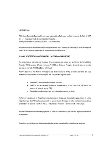 !!" # ( $ % & ) ) * +, !!0 * & % - ' & & - & 1 & % +- 53 % & % 3 # < - * & % & $ ;: 4 % & ; CD E ) ( > @ & $ % A +- % Notas Anexas ao Balanço e Demonstração de Resultados -2007 % ? 1 B - 1 +E ' A ) $% & ; & & $ ) & & +, &+- & ;: @ &+- & 5;: 6 %? +- & : ; ? & % & $ = & ) & %) ) : : ) 3 + ) 3 +- ./ 3 7 .8 ! ! 9 + - .08 ! ! 9 ) +- & & 6 & ' 2 +, 4 ' & % +, & ' +- +- ) +, $ ) Página 1 de 1112 > - # ! - " % #" & ) = ' % A & ? & & H ? & & & $B $ I % %! ! " " +, 4 % $ & A +, & I ) ? ? & (% & & (= ? J ) $ & & ? 1 & & = +? 4 A A +, & > .! +, B & I ( A +, & Notas Anexas ao Balanço e Demonstração de Resultados -2007 4 & & B B & ( = H B B I A = ? 1 FG - % & A ) # & $ +- ' ! ' ($ & = & ) B +- A +- ? A F & % B & B 6 ' & A = " " = % - H # & ' 1 & FG - ? 1 & % ' = & % & A +- ? & (% = % 5B (% , B = % # (% .! 0 K 0 0 Página 2 de 1112 A # B $ ! ! ' ($ +- A B % " I & F A +, J ) & & & ! & % $B $ $ $ & B B = ) +- 1 ' - & & % - & +- - 5 ) % 6 % & % % B ( + 4 & %(% ) & & 4 # % ) +- B ) # ' & & - % - ) +- ! !' ! ? & % - % 4 & 4 & %(% & ) +- & ) ) & % & % - # # % < - H B ) ) & L C8D 9 % & % ) & & % , I A +- & ) & 4 ? & % ) ! " + % & !' - % ' & M % ( +) - % 3 A M ' # & $ $& & # - ' A +- B = - & ? - & $ ) %) 1 & B +, - ) & & ) * B +- $ !" ! " %) K % + ( ; - % Notas Anexas ao Balanço e Demonstração de Resultados -2007 # ? & +, ) % B & (% +- & $ = $ !!K Página 3 de 1112 !!" , - .) ! !!/ ? " ) #" E ' C. & ? !!" & ? +- /) #" ) ! ! " C. A > Aplicações em Instituições de Crédito Aplicações No País Em outras instituições de crédito Depósitos a 3 meses No Estrangeiro Em outras instituições de crédito Aplicações a muito curto prazo I A +, 9 C"N 8 & A & ! 0 31-12-2007 167.897,66 170.656,50 635.000,00 335.994,38 4.701.737,69 5.504.635,35 4.205.971,47 4.712.622,35 ? ? & 31-12-2006 & $ 9"D CC. D C 8 = ; & & ' +, C. A ? ! ! " C. ) A - !!9 > 31-12-2007 Crédito e Juros Vencidos Crédito a Clientes Crédito Interno De 1 a 5 anos I # 1) ! $ ! ; = % " " $% O : ) 4 & % ) !!" * ' " " # A & ) I ) +, & A +& B Notas Anexas ao Balanço e Demonstração de Resultados -2007 : B $ 7 8 !!! # % 88.824,00 88.824,00 & % ! .K C. G # & 31-12-2006 76.445,46 76.445,46 $ % +# ( & % Página 4 de 1112 7 +, 8D D - 3 A Q RQ < I &? $ 3* Q * 99! ! 99! ! . . . . * +- +- + 3 QI &J & A & ) ? ) & A I ) +, Q I Q G 8! C# ! .K Q 2 $ ) $% - $ ! ' ($ # & % C. .!/ .!/ A / /.! / /.! !!" % = ! ! ' ($ & # % C. A !!" % ) $% - = 4 I % % Impostos diferiros 2005 2006 2007 I * B = # $% 3 * 3 * P & 4 $A & & Prejuizos Fiscais & # ) 28.501,00 110.573,00 - Limite de utilização 2007 2008 2009 2010 2011 Notas Anexas ao Balanço e Demonstração de Resultados -2007 + Movimento para resultados 54.039,00 25.538,00 136.111,00 & Ano gerador 2001 2002 2003 2004 2005 ) ) > Montante 245.135,31 468.154,97 162.964,95 74.897,07 213.531,68 1.164.683,98 Impostos Imposto diferidos activos reportável registados 61.283,83 25.538,00 117.038,74 110.573,00 40.741,24 0,00 18.724,27 0 53.382,92 0 291.171,00 136.111,00 Página 5 de 1112 > & ) & !!0 =& +- 5 E ) % % (% & $ ) & & % % & +- 3 :; C. A I % % = & $ & ) A $ !!/ 31-Dez-06 39.439,39 14.003,95 164.439,81 217.883,15 +, 47.164,99 38.821,40 113.799,94 199.786,33 # ) * & & & +, & +) = : & & & ) ) % C! - = B + ! ! " C. 31-Dez-07 B & > Outros Activos Devedores e Outras Aplicações Despesas com custo Diferido Outras Contas de Regularização J & & A & % " & +, +, ? % & % ( $ ) & A ) , I J & % & 6 % ) !!" & & % B ) 4 +- !!0 ! # C.# : A #! " C.# A #! / & ? % & & 7 & $ # ? % & % $ E ( % ? & % , Notas Anexas ao Balanço e Demonstração de Resultados -2007 K /K K ! 0" // .0 0! 0 / K // 0D / 0 7 C8D 9 % #& K C! D 0 C/ /" K. K D " 9 ! "" ) # ) Página 6 de 1112 & % , - : % ? % = ? 3 = ) $ !! 3 !!K ) 1 & B Q & & % ) & %+ $ ' + % (% ' & % - $ = $ !!" !!9 !!K & ) +, A ; & !!C ' +- +, G & & & % $ A Q 4( +- Q ' # - +- 4 & + & 4 ) % (% ( ) & - K ) 4 $ & +- G B 1 &, = # ) ( - J & & % , # B ) > Saldo no inicío do ano Rubrica de Provisões 2. Para Crédito Vencido 2.2. Crédito 88.824,00 9. Para Riscos Gerais de Crédito 13. Outras 874,00 32.500,25 Total .8 Movimento Acumulado de Provisões Anulações Dotações Utilizações Transf. reposições 12.378,54 A ! !!/ ) E ) 0,00 2.500,25 % % ) # ) 12.378,54 C. 31-12-2007 $ 874,00 30.000,00 0,00 A 107.319,46 !!" C. > Outros Passivos Retenção de Impostos na fonte Restantes Impostos Contribuições para a Seg. Social .. 76.445,46 2.500,25 122.198,25 $ Saldo Final % % 31-12-2006 19.397,54 4.466,35 2.829,83 26.300,65 2.436,98 2.906,28 26.693,72 31.643,91 C. A !!" C. > Notas Anexas ao Balanço e Demonstração de Resultados -2007 Página 7 de 1112 A !!/ 31-12-2007 31-12-2006 74.397,97 46.141,37 123.116,29 47.817,70 112.665,43 243.655,63 160.483,13 Outros Passivos Fornecedores Custos a Pagar Outras Contas de Regularização ./ #3 !!" A A I 5 & & & ) ) Q & B & & ' % ? C D 0! ! ! ! +, % ! 9S 6 % +- & % & .1 - ' ; = & 9 ! ! E C. & 31-12-2006 1.790.000,00 125.000,00 1.236,76 -1.350.226,59 64.671,46 Capital Prémio de Emissão de Acções Reservas Resultados Transitados Resultados Liquidos do Exercício A ! ! " C. 7C9 Movimentos 200.000,00 A !!/ !" ! ) ) " $ #I & % ) ' # ) > 31-12-2006 31.099,50 10.613,85 4.303,66 26.795,84 1.485,25 9.128,60 - $ - Notas Anexas ao Balanço e Demonstração de Resultados -2007 & 31-12-2007 1.990.000,00 125.000,00 1.236,76 -1.285.555,13 346.067,87 64.671,46 -64.671,46 31-12-2007 Juros e rendimentos similares Aplicações em Instituições Financeiras Juros e Encargos similares Recursos de Outras Inst. de Crédito Margem Financeira .2 & Página 8 de 1112 & & > Proveitos por segmento de negócio Comissões de Corretagem Comissões de Gestão de Carteiras Outros .3 " " + 31-12-2007 31-12-2006 957.932,27 718.162,03 10.557,79 23.356,54 523,86 595,64 969.013,92 742.114,21 : Outros Proveitos e Lucros 31-12-2007 31-12-2006 Proveitos pela prestação de serviços 6.065,34 2.770,67 Comissões por negociação na plataforma 299.654,54 181.617,57 Outros Custos e Prejuízos 0,00 