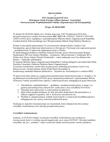 Sprawozdanie z XXV Konferencji EUFASA (European Union Foreign Affairs Spouses’ Association – Stowarzyszenie Współmałżonków Służby Zagranicznej Unii Europejskiej) Praga, 26-28.04.2009 W dniach 26-28.04.09 odbyła się w Pradze doroczna, XXV Konferencja EUFASA, przygotowana przez czeskie stowarzyszenie SRP -MZV CR FOREIGN SERVICE SPOUSES´ ASSOCIATION) przy współpracy i pod patronatem Ministra Spraw Zagranicznych Republiki Czeskiej Karela Schwarzenberga oraz Wiceprezydenta Miasta Pragi Markety Reedovej. Wzięli w niej udział reprezentanci 22 stowarzyszeń członkowskich z krajów Unii Europejskiej, uprzywilejowani obserwatorzy ze Szwajcarii i Norwegii oraz zaproszeni goście – przedstawiciele 12 placówek dyplomatycznych w Pradze. W skład delegacji polskiej wchodziły Grażyna Prawda- prezes Stowarzyszenia Rodzin Dyplomatów RP oraz Joanna Olendzka - wiceprezes. Obserwatorami z Ambasady RP w Pradze były Panie Jolanta Wójcik-Niedzielska – radca ambasady oraz Ewa BorkowskaPastwa – małżonka ambasadora. W imieniu Ministra Spraw Zagranicznych Republiki Czeskiej delegatów powitała Edita Hrda, Dyrektor Generalny Gabinetu Ministra Spraw Zagranicznych. Uczestnicy konferencji zostali także przyjęci przez małżonkę prezydenta Czech Livię Klausovą oraz wiceprezydenta miasta Pragi Marie Kousalokovą. Konferencję zamknęła Marketa Sarbochova – Dyrektor ds. Personalnych w czeskim MSZ. W pierwszym dniu obrad, po wygłoszeniu przemówienia okolicznościowego w związku z 25tą jubileuszową konferencją EUFASA przez inicjatorkę konferencji i reprezentantkę Włoch, Francescę Vattani, przedstawiono raporty z całorocznych prac następujących grup roboczych: 1. Zatrudnienie współmałżonków – problemy z podejmowaniem pracy w kraju i za granicą (prezentacja bazy danych dot. rynku pracy oraz certyfikatu EUFASA) 2. Ubezpieczenie zdrowotne w czasie pobytu na placówce 3. Jakie należy podjąć działania, by móc pozostać atrakcyjnym dla pracodawcy w obliczu ciągłych wyjazdów, luk w życiorysie zawodowym etc. 4. Wykład nt. autoprezentacji, technik stosowanych w rozmowach kwalifikacyjnych z ubiegającymi się o pracę, metod poszukiwania pracy Dyskusję nt. raportów kontynuowano na warsztatach, które obejmowały dwa tematy: certyfikat wolontariusza oraz metody poszukiwania pracy. Certyfikat wolontariusza: ustalono, że EUFASA będzie wystawiać certyfikat wolontariusza tym osobom ze stowarzyszeń, które w wybitny sposób angażowały się w prace EUFASY. Również podobny certyfikat, ale tzw. „rodzimy”, może wystawiać każde stowarzyszenie swoim członkom. 1 Odrębną rekomendacją dla MSZ ma być propozycja wystawiania certyfikatów wolontariusza lub podobnych poświadczeń przez szefów placówek dla tych współmałżonków, którzy w sposób szczególny dobrowolnie i społecznie wykonywali prace na rzecz placówki. Wszystkie certyfikaty/opinie/poświadczenia mogą stanowić istotny element w poszukiwaniu pracy. W drugim dniu obrad administrator sieci internetowej EUAFASA zaprezentował całkowicie zmienioną szatę graficzną i treść internetowej strony publicznej EUFASY. Komentarze i uwagi do tej propozycji stowarzyszenia mogą wnosić do końca czerwca 2009. Ponadto przeprowadzano następujące głosowania: 1. Jednogłośnie przedłużono na kolejne 2 lata umowę z administratorem sieci internetowej EUFASA. 2. Nazwa EUFASA pozostaje niezmieniona, jednakże jej interpretacja brzmi: European Union Foreign Affairs Spouses, Partners, Families Association t.j Europejskie Stowarzyszenie Wspólmałżonków, Partnerów i Rodzin Dyplomatów (wcześniej rozwinięcie skrótu odnosiło się jedynie do współmałżonków: European Union Foreign Affairs Spouses Association) Polska wstrzymała się od głosu, gdyż nasze ustawodawstwo nie przewiduje związków partnerskich. 3. Zmiana statutowa EUFASA dot. składu tzw. Komitetu Kierującego (Steering Committee. Tworzą go: Trio – Czechy, Hiszpania, Węgry oraz administrator sieci. Polska oraz Cypr zostały zaproszone do pracy tego Komitetu z racji zbliżających się ich prezydencji w Unii Europejskiej w roku 2011 i 2012. Polska oraz Cypr zostały przed konferencją zapytane o możliwość przeprowadzenia konferencji EUFASA w pierwszym półroczu 2012, t.j. poza okresem swego przewodniczenia Unii Europejskiej. Powodem tego jest brak stowarzyszenia w Danii, której prezydencja wypada w I półroczu 2012r. Nasze stowarzyszenie, po uprzednim ustaleniu z Kierownictwem MSZ (dyr. Gabinetu Ministra SZ oraz Dyr. Generalny SZ), zgłosiło swoją gotowość. Również stowarzyszenie cypryjskie zadeklarowało swoją chęć zorganizowania konferencji. Cypr ma do tego pierwszeństwo, ponieważ będzie przewodniczyć UE w drugim półroczu 2012. Ustalono 2 obszary prac na kolejny rok: Jak uatrakcyjnić członkostwo w stowarzyszeniu (Polska zgłosiła swój akces) Adaptacja po powrocie z placówki do kraju 2 Planowana nowelizacja ustawy we Francji Stowarzyszenie francuskie poinformowało o projekcie ustawy zmieniającym tzw. „dodatek rodzinny” na tzw. „zasiłek dla współmałżonka”. Dotychczasowy „dodatek rodzinny” oznacza uzupełnienie pensji delegowanego za granicę pracownika. „Zasiłek dla współmałżonka” ma być świadczeniem, wypłacanym bezpośrednio współmałżonkowi. Nowelizacja ustawy ma być poddana dyskusji i głosowaniu przez Zgromadzenie Narodowe latem br. Na koniec Hiszpania, która będzie przewodniczyć Unii Europejskiej w pierwszym półroczu 2010 roku zobowiązała się zorganizować konferencję EUFASA oraz ogłosiła wstępny jej termin i miejsce tj. 3 maja w Madrycie. Sporz.: Grażyna Prawda Joanna Olendzka 24.05.2009 3