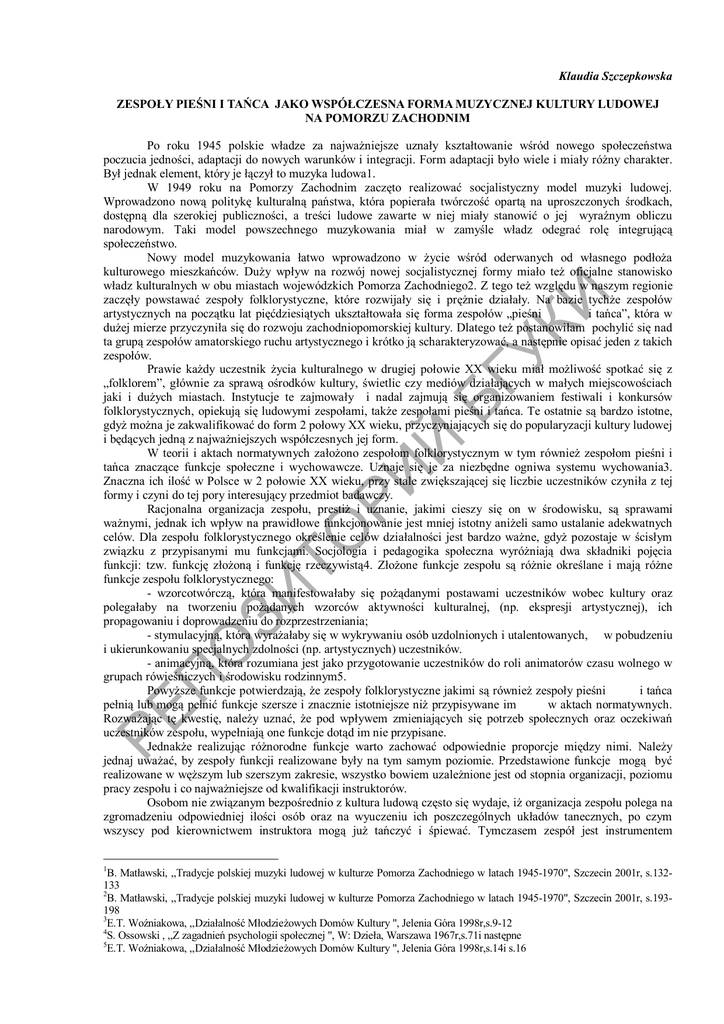 Klaudia Szczepkowska ZESPOŁY PIEŚNI I TAŃCA JAKO WSPÓŁCZESNA FORMA MUZYCZNEJ KULTURY LUDOWEJ NA POMORZU ZACHODNIM РЕ П О ЗИ ТО РИ Й БГ УК И Po roku 1945 polskie władze za najważniejsze uznały kształtowanie wśród nowego społeczeństwa poczucia jedności, adaptacji do nowych warunków i integracji. Form adaptacji było wiele i miały różny charakter. Był jednak element, który je łączył to muzyka ludowa1. W 1949 roku na Pomorzy Zachodnim zaczęto realizować socjalistyczny model muzyki ludowej. Wprowadzono nową politykę kulturalną państwa, która popierała twórczość opartą na uproszczonych środkach, dostępną dla szerokiej publiczności, a treści ludowe zawarte w niej miały stanowić o jej wyraźnym obliczu narodowym. Taki model powszechnego muzykowania miał w zamyśle władz odegrać rolę integrującą społeczeństwo. Nowy model muzykowania łatwo wprowadzono w życie wśród oderwanych od własnego podłoża kulturowego mieszkańców. Duży wpływ na rozwój nowej socjalistycznej formy miało też oficjalne stanowisko władz kulturalnych w obu miastach wojewódzkich Pomorza Zachodniego2. Z tego też względu w naszym regionie zaczęły powstawać zespoły folklorystyczne, które rozwijały się i prężnie działały. Na bazie tychże zespołów artystycznych na początku lat pięćdziesiątych ukształtowała się forma zespołów „pieśni i tańca”, która w dużej mierze przyczyniła się do rozwoju zachodniopomorskiej kultury. Dlatego też postanowiłam pochylić się nad ta grupą zespołów amatorskiego ruchu artystycznego i krótko ją scharakteryzować, a następnie opisać jeden z takich zespołów. Prawie każdy uczestnik życia kulturalnego w drugiej połowie XX wieku miał możliwość spotkać się z „folklorem”, głównie za sprawą ośrodków kultury, świetlic czy mediów działających w małych miejscowościach jaki i dużych miastach. Instytucje te zajmowały i nadal zajmują się organizowaniem festiwali i konkursów folklorystycznych, opiekują się ludowymi zespołami, także zespołami pieśni i tańca. Te ostatnie są bardzo istotne, gdyż można je zakwalifikować do form 2 połowy XX wieku, przyczyniających się do popularyzacji kultury ludowej i będących jedną z najważniejszych współczesnych jej form. W teorii i aktach normatywnych założono zespołom folklorystycznym w tym również zespołom pieśni i tańca znaczące funkcje społeczne i wychowawcze. Uznaje się je za niezbędne ogniwa systemu wychowania3. Znaczna ich ilość w Polsce w 2 połowie XX wieku, przy stale zwiększającej się liczbie uczestników czyniła z tej formy i czyni do tej pory interesujący przedmiot badawczy. Racjonalna organizacja zespołu, prestiż i uznanie, jakimi cieszy się on w środowisku, są sprawami ważnymi, jednak ich wpływ na prawidłowe funkcjonowanie jest mniej istotny aniżeli samo ustalanie adekwatnych celów. Dla zespołu folklorystycznego określenie celów działalności jest bardzo ważne, gdyż pozostaje w ścisłym związku z przypisanymi mu funkcjami. Socjologia i pedagogika społeczna wyróżniają dwa składniki pojęcia funkcji: tzw. funkcję złożoną i funkcję rzeczywistą4. Złożone funkcje zespołu są różnie określane i mają różne funkcje zespołu folklorystycznego: - wzorcotwórczą, która manifestowałaby się pożądanymi postawami uczestników wobec kultury oraz polegałaby na tworzeniu pożądanych wzorców aktywności kulturalnej, (np. ekspresji artystycznej), ich propagowaniu i doprowadzeniu do rozprzestrzeniania; - stymulacyjną, która wyrażałaby się w wykrywaniu osób uzdolnionych i utalentowanych, w pobudzeniu i ukierunkowaniu specjalnych zdolności (np. artystycznych) uczestników. - animacyjną, która rozumiana jest jako przygotowanie uczestników do roli animatorów czasu wolnego w grupach rówieśniczych i środowisku rodzinnym5. Powyższe funkcje potwierdzają, że zespoły folklorystyczne jakimi są również zespoły pieśni i tańca pełnią lub mogą pełnić funkcje szersze i znacznie istotniejsze niż przypisywane im w aktach normatywnych. Rozważając tę kwestię, należy uznać, że pod wpływem zmieniających się potrzeb społecznych oraz oczekiwań uczestników zespołu, wypełniają one funkcje dotąd im nie przypisane. Jednakże realizując różnorodne funkcje warto zachować odpowiednie proporcje między nimi. Należy jednaj uważać, by zespoły funkcji realizowane były na tym samym poziomie. Przedstawione funkcje mogą być realizowane w węższym lub szerszym zakresie, wszystko bowiem uzależnione jest od stopnia organizacji, poziomu pracy zespołu i co najważniejsze od kwalifikacji instruktorów. Osobom nie związanym bezpośrednio z kultura ludową często się wydaje, iż organizacja zespołu polega na zgromadzeniu odpowiedniej ilości osób oraz na wyuczeniu ich poszczególnych układów tanecznych, po czym wszyscy pod kierownictwem instruktora mogą już tańczyć i śpiewać. Tymczasem zespół jest instrumentem 1 B. Matławski, ,,Tradycje polskiej muzyki ludowej w kulturze Pomorza Zachodniego w latach 1945-1970", Szczecin 2001r, s.132133 2 B. Matławski, ,,Tradycje polskiej muzyki ludowej w kulturze Pomorza Zachodniego w latach 1945-1970", Szczecin 2001r, s.193198 3 E.T. Woźniakowa, ,,Działalność Młodzieżowych Domów Kultury ", Jelenia Góra 1998r,s.9-12 4 S. Ossowski , ,,Z zagadnień psychologii społecznej ", W: Dzieła, Warszawa 1967r,s.71i następne 5 E.T. Woźniakowa, ,,Działalność Młodzieżowych Domów Kultury ", Jelenia Góra 1998r,s.14i s.16 РЕ П О ЗИ ТО РИ Й БГ УК И zbiorowym, składającym się z żywych ludzi o bardzo różnych cechach i temperamentach, z których to instruktor ma stworzyć organizm, zdolny do wykonywania zadań artystycznych, przy czym jest to organizm dość skomplikowany i delikatny. Dlatego też praca organizacyjna i wychowawcza warunkuje pracę muzyczną i wyniki artystyc