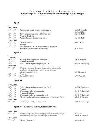 Program Zjazdów w I semestrze Specjalizacja nr 17: Epizootiologia i Administracja Weterynaryjna Zjazd I 20.03.2009 1100 – 1200 Rozpoczęcie zajęć, sprawy organizacyjne 1200 – 1400 1400 – 1500 1500 – 1730 21. 03. 2009 900 – 1130 1130 – 1200 1200 – 1400 Zarys administracji wet. od 1918 do dziś Przerwa obiadowa Administracja weterynaryjna. Cz 1. Choroby koni. Cz. 1. Przerwa Środki ochronne w UE przy zakaŜeniu zwierząt i produktów pochodzenia zwierzęcego prof. Z. Grądzki prof. J. Kita mgr M. Rudy mgr M. Rudy prof. J. Kita dr A. Rudy Zjazd II 17.04.2009 1000 – 1345 1345 – 1445 1445 – 1745 18.04.2009 900 – 1200 1200 – 1215 1215 – 1345 Systemy informatyczne w weterynarii Przerwa obiadowa Etyka i deontologia weterynaryjna. Cz. 1. Warunki weterynaryjne przy zbieraniu, przetwarzaniu, grzebaniu lub spalaniu zwłok zwierzęcych oraz odpadów poubojowych Przerwa śywność GMSO mgr T. Wojtalik prof. N. Pospieszny dr P. Kołodziej dr T. Woźniak Zjazd III 15. 05. 2009 1000 – 1130 1130 – 1145 1145 – 1315 1315 – 1415 1415 – 1515 1515 – 1745 16. 05. 2009 900 – 1400 Etyka i deontologia weterynaryjna. Cz. 2. Przerwa Wojskowa słuŜba weterynaryjna Przerwa obiadowa Wojskowa słuŜba weterynaryjna - cd. Choroby bydła podlegające zgłaszaniu i zwalczaniu. Cz. 1. prof. N. Pospieszny płk. dr D. Jackowski dr hab. K. Rypuła Marketing w praktyce lekarza wet. dr R. Karczmaczyk płk. dr D. Jackowski Zjazd IV – zajęcia wyjazdowe, Szklarska Poręba 26. 06. 2009 900 – 1800 27. 06. 2009 900 – 1300 Kontrola Inspekcji Weterynaryjnej w zakresie urzędowego nadzoru nad produkcją zwierzęcego pochodzenia dr Z. Król dr hab. K. Rypuła Choroby koni. Cz II. prof. J. Kita