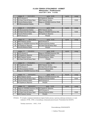 II LIGA TENISA STOŁOWEGO - KOBIET Małopolsko - Podkarpacka sezon 2011 / 2012 kolejka 8 14.01.2012 II runda godz. 14:00 22 KKTS Krosno II KS Spektrum Słopnice 23 KS Start Park-M Nowy Sącz MKS Radość Gorlice Chomik-Rokicie-Gdów Magnum-WESEM Koźmice Wielk. 24 KS Bronowianka Kraków kolejka 9 25 godz. 14:00 26 KS Start Park-M Nowy Sącz Magnum-WESEM Koźmice Wlk. Chomik-Rokicie-Gdów KS Spektrum Słopnice KKTS Krosno II godz. 14:00 28 MKS Radość Gorlice 29 Magnum-WESEM Koźmice Wlk. KS Bronowianka Kraków 30 KS Spektrum Słopnice KS Start Park-M Nowy Sącz Chomik-Rokicie-Gdów PAUZA 3.03.2012 godz. 14:00 KKTS Krosno II Magnum-WESEM Koźmice Wlk. 32 KS Spektrum Słopnice KS Bronowianka Kraków 33 MKS Radość Gorlice Chomik-Rokicie -Gdów KS Start Park-M Nowy Sącz kolejka 12 godz. 14:00 35 KKTS Krosno II KS Start Park-M Nowy Sącz KS Bronowianka Kraków Chomik-Rokicie-Gdów uwagi wynik uwagi Wynik uwagi Wynik uwagi PAUZA Magnum-WESEM Koźmice Wlk. 24.03.2012 godz. 14:00 37 MKS Radość Gorlice Magnum-WESEM Koźmice Wlk. 38 KS Start Park-M Nowy Sącz KS Bronowianka Kraków 39 Chomik-Rokicie-Gdów KKTS Krosno II KS Spektrum Słopnice 13:00 PAUZA 28.04.2012 godz. 14:00 40 Magnum-WESEM Koźmice Wlk. KS Spektrum Słopnice 41 KS Bronowianka Kraków KKTS Krosno II KS Start Park-M Nowy Sącz Chomik-Rokicie-Gdów 42 wynik MKS Radość Gorlice 36 kolejka 14 13:00 PAUZA 17.03.2012 KS Spektrum Słopnice kolejka 13 uwagi KKTS Krosno II 31 34 wynik PAUZA 28.01.2012 kolejka 11 13:00 MKS Radość Gorlice 27 kolejka 10 uwagi PAUZA 21.01.2012 KS Bronowianka Kraków wynik MKS Radość Gorlice wynik uwagi 13:00 PAUZA UWAGA : W związku z napiętym kalendarzem imprez bardzo proszę o sprawną realizację terminarza a w razie trudności ( WTK , OTK ) o konsultację z drużynami przeciwnymi i Wydziałem Gier KOZTS. Terminy rezerwowe : 18.02 , 31.03 Przewodniczący WGiD KOZTS /-/ Andrzej Wieczorek