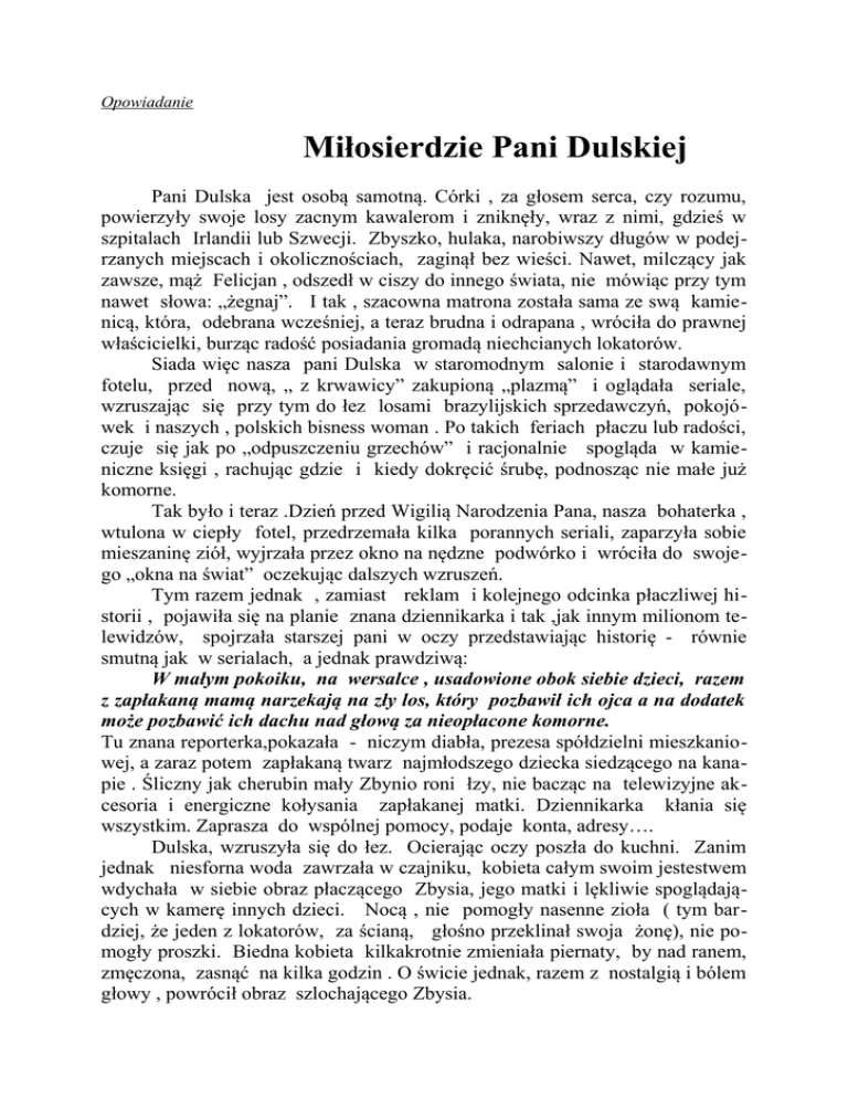 Opowiadanie Miłosierdzie Pani Dulskiej Pani Dulska jest osobą samotną. Córki , za głosem serca, czy rozumu, powierzyły swoje losy zacnym kawalerom i zniknęły, wraz z nimi, gdzieś w szpitalach Irlandii lub Szwecji. Zbyszko, hulaka, narobiwszy długów w podejrzanych miejscach i okolicznościach, zaginął bez wieści. Nawet, milczący jak zawsze, mąż Felicjan , odszedł w ciszy do innego świata, nie mówiąc przy tym nawet słowa: „żegnaj”. I tak , szacowna matrona została sama ze swą kamienicą, która, odebrana wcześniej, a teraz brudna i odrapana , wróciła do prawnej właścicielki, burząc radość posiadania gromadą niechcianych lokatorów. Siada więc nasza pani Dulska w staromodnym salonie i starodawnym fotelu, przed nową, „ z krwawicy” zakupioną „plazmą” i oglądała seriale, wzruszając się przy tym do łez losami brazylijskich sprzedawczyń, pokojówek i naszych , polskich bisness woman . Po takich feriach płaczu lub radości, czuje się jak po „odpuszczeniu grzechów” i racjonalnie spogląda w kamieniczne księgi , rachując gdzie i kiedy dokręcić śrubę, podnosząc nie małe już komorne. Tak było i teraz .Dzień przed Wigilią Narodzenia Pana, nasza bohaterka , wtulona w ciepły fotel, przedrzemała kilka porannych seriali, zaparzyła sobie mieszaninę ziół, wyjrzała przez okno na nędzne podwórko i wróciła do swojego „okna na świat” oczekując dalszych wzruszeń. Tym razem jednak , zamiast reklam i kolejnego odcinka płaczliwej historii , pojawiła się na planie znana dziennikarka i tak ,jak innym milionom telewidzów, spojrzała starszej pani w oczy przedstawiając historię - równie smutną jak w serialach, a jednak prawdziwą: W małym pokoiku, na wersalce , usadowione obok siebie dzieci, razem z zapłakaną mamą narzekają na zły los, który pozbawił ich ojca a na dodatek może pozbawić ich dachu nad głową za nieopłacone komorne. Tu znana reporterka,pokazała - niczym diabła, prezesa spółdzielni mieszkaniowej, a zaraz potem zapłakaną twarz najmłodszego dziecka siedzącego na kanapie . Śliczny jak cherubin mały Zbynio roni łzy, nie bacząc na telewizyjne akcesoria i energiczne kołysania zapłakanej matki. Dziennikarka kłania się wszystkim. Zaprasza do wspólnej pomocy, podaje konta, adresy…. Dulska, wzruszyła się do łez. Ocierając oczy poszła do kuchni. Zanim jednak niesforna woda zawrzała w czajniku, kobieta całym swoim jestestwem wdychała w siebie obraz płaczącego Zbysia, jego matki i lękliwie spoglądających w kamerę innych dzieci. Nocą , nie pomogły nasenne zioła ( tym bardziej, że jeden z lokatorów, za ścianą, głośno przeklinał swoja żonę), nie pomogły proszki. Biedna kobieta kilkakrotnie zmieniała piernaty, by nad ranem, zmęczona, zasnąć na kilka godzin . O świcie jednak, razem z nostalgią i bólem głowy , powrócił obraz szlochającego Zbysia. - Tak nie można ! – wykrzyknęła do siebie, ścieląc wielkie małżeńskie łoże – Ludzie muszą sobie pomagać ! Poranek wigilijny był tego roku smutny. Ostry mróz i puszysty śnieg uciekły gdzieś, zostawiając wigilię bez jakichkolwiek białych złudzeń . Ot, tak… Tylko dzieci, zapatrzone wcześniej w kolorowe reklamy, stawały się bardziej natarczywe i oczekujące prezentów , nie bacząc na możliwości rodzinnych portfeli. W tej właśnie atmosferze , nasza droga pani Dulska podjęła ostateczną decyzję. Ruszyła w kierunku staromodnej szafy, gdzie spoczywały garnitury ś. p. Felicjana i z jednej kieszeni, owych zabytkowych ubrań wybrała kilka papierowych nominałów…. - Przecież to Wigilia ! – myślała – Trzeba szybko ! Biegła przez szare korytarze domu. Rozpłomieniona przyjętą misją , nie zauważyła nawet małego Sławka . Ten cichy, wychudzony dziesięciolatek sypiał często na klatce schodowej , kiedy mama zapraszała na noc „gościa” , który nie bardzo chciał opuścić łoże przed dziesiątą . Dulska potrąciła go tylko, mrucząc, że: Klatka to nie lokal . A i tak za dodatkowy lokal to trzeba zapłacić…. Na szczęście sklep z zabawkami był blisko . Tu też oberwało się sprzedawczyniom bo starsza pani , mając serialowe doświadczenie , oceniła ich kompetencję na poziom: „minus zero” . W rezultacie kupiła sześć piłek , dwanaście lalek, różnej wielkości i konia na biegunach, bo jak twierdził jedyny i miły jej zdaniem sprzedawca – Dla chłopaka ? W sam raz! Droga powrotna w górę nie była taka łatwa. Dulska , pozbywszy się i tak kilku większych bagaży, teraz zmuszała swoje ciało do sporego wysiłku. Zasapana, ze złośliwą zazdrością obserwowała gromadę dzieci biegnących po drugiej stronie. A tam: dwie starsze dziewczynki, pewnie z drugiej lub trzeciej klasy pełniły role domowych opiekunek. Jedna taszczyła zdobyty ( chyba na śmietniku ) i kulejący wózek , a w nim postarzałe brudem niemowlę. Druga , z dumą nieustępliwej matki zabraniała wszystkiego trzymanej kurczowo, czteroletniej i brudnej jak inni dziewczynce. Tą, zwyczajną, codzienną procesję uzupełniał umorusany sześciolatek , biegający dookoła starszych sióstr i zaglądający ( niby od niechcenia ale chyba z głodu ) do wszystkich puszek na śmieci - Znów ta hałastra! – Dulska otarła pot z czoła - Czemu ja mam takich lokatorów ? Gdyby żył mój ojciec…. – Niech matka przyjdzie umyć schody ! – krzyknęła za nimi i po cichu mruknęła do siebie – Choć tyle z tego robactwa będę miała. W takich smutnych przypadkach nasza bohaterka wspominała najwdzięczniejsze lata życia i ginęła w tych wspomnieniach jak w morzu. Teraz jednak nie . Wdrapała się na pierwsze piętro i w zaciszu ogromnej kuchni borykała z nową dla niej metodą przesyłek pocztowych. - Sznurek był i było dobrze – marudziła sama do siebie – A teraz te „klejki” i „klejki” … Po kilku próbach udało się jednak przygotować przesyłkę. Dulska chw