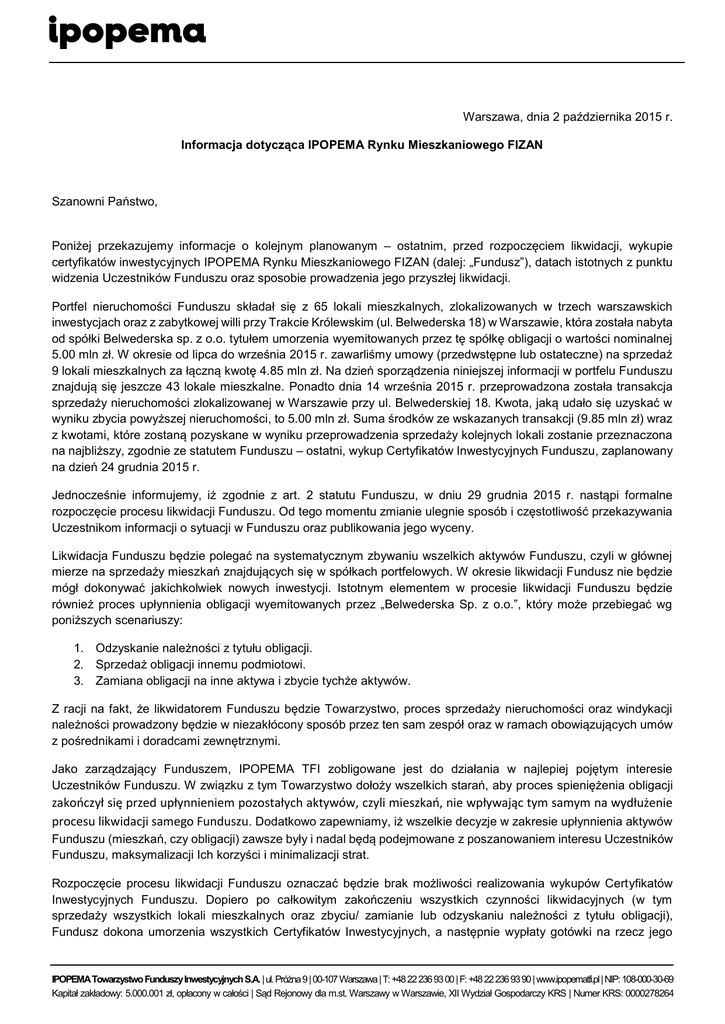 Warszawa, dnia 2 października 2015 r. Informacja dotycząca IPOPEMA Rynku Mieszkaniowego FIZAN Szanowni Państwo, Poniżej przekazujemy informacje o kolejnym planowanym – ostatnim, przed rozpoczęciem likwidacji, wykupie certyfikatów inwestycyjnych IPOPEMA Rynku Mieszkaniowego FIZAN (dalej: „Fundusz”), datach istotnych z punktu widzenia Uczestników Funduszu oraz sposobie prowadzenia jego przyszłej likwidacji. Portfel nieruchomości Funduszu składał się z 65 lokali mieszkalnych, zlokalizowanych w trzech warszawskich inwestycjach oraz z zabytkowej willi przy Trakcie Królewskim (ul. Belwederska 18) w Warszawie, która została nabyta od spółki Belwederska sp. z o.o. tytułem umorzenia wyemitowanych przez tę spółkę obligacji o wartości nominalnej 5.00 mln zł. W okresie od lipca do września 2015 r. zawarliśmy umowy (przedwstępne lub ostateczne) na sprzedaż 9 lokali mieszkalnych za łączną kwotę 4.85 mln zł. Na dzień sporządzenia niniejszej informacji w portfelu Funduszu znajdują się jeszcze 43 lokale mieszkalne. Ponadto dnia 14 września 2015 r. przeprowadzona została transakcja sprzedaży nieruchomości zlokalizowanej w Warszawie przy ul. Belwederskiej 18. Kwota, jaką udało się uzyskać w wyniku zbycia powyższej nieruchomości, to 5.00 mln zł. Suma środków ze wskazanych transakcji (9.85 mln zł) wraz z kwotami, które zostaną pozyskane w wyniku przeprowadzenia sprzedaży kolejnych lokali zostanie przeznaczona na najbliższy, zgodnie ze statutem Funduszu – ostatni, wykup Certyfikatów Inwestycyjnych Funduszu, zaplanowany na dzień 24 grudnia 2015 r. Jednocześnie informujemy, iż zgodnie z art. 2 statutu Funduszu, w dniu 29 grudnia 2015 r. nastąpi formalne rozpoczęcie procesu likwidacji Funduszu. Od tego momentu zmianie ulegnie sposób i częstotliwość przekazywania Uczestnikom informacji o sytuacji w Funduszu oraz publikowania jego wyceny. Likwidacja Funduszu będzie polegać na systematycznym zbywaniu wszelkich aktywów Funduszu, czyli w głównej mierze na sprzedaży mieszkań znajdujących się w spółkach portfelowych. W okresie likwidacji Fundusz nie będzie mógł dokonywać jakichkolwiek nowych inwestycji. Istotnym elementem w procesie likwidacji Funduszu będzie również proces upłynnienia obligacji wyemitowanych przez „Belwederska Sp. z o.o.”, który może przebiegać wg poniższych scenariuszy: 1. Odzyskanie należności z tytułu obligacji. 2. Sprzedaż obligacji innemu podmiotowi. 3. Zamiana obligacji na inne aktywa i zbycie tychże aktywów. Z racji na fakt, że likwidatorem Funduszu będzie Towarzystwo, proces sprzedaży nieruchomości oraz windykacji należności prowadzony będzie w niezakłócony sposób przez ten sam zespół oraz w ramach obowiązujących umów z pośrednikami i doradcami zewnętrznymi. Jako zarządzający Funduszem, IPOPEMA TFI zobligowane jest do działania w najlepiej pojętym interesie Uczestników Funduszu. W związku z tym Towarzystwo dołoży wszelkich starań, aby proces spieniężenia obligacji zakończył się przed upłynnieniem pozostałych aktywów, czyli mieszkań, nie wpływając tym samym na wydłużenie procesu likwidacji samego Funduszu. Dodatkowo zapewniamy, iż wszelkie decyzje w zakresie upłynnienia aktywów Funduszu (mieszkań, czy obligacji) zawsze były i nadal będą podejmowane z poszanowaniem interesu Uczestników Funduszu, maksymalizacji Ich korzyści i minimalizacji strat. Rozpoczęcie procesu likwidacji Funduszu oznaczać będzie brak możliwości realizowania wykupów Certyfikatów Inwestycyjnych Funduszu. Dopiero po całkowitym zakończeniu wszystkich czynności likwidacyjnych (w tym sprzedaży wszystkich lokali mieszkalnych oraz zbyciu/ zamianie lub odzyskaniu należności z tytułu obligacji), Fundusz dokona umorzenia wszystkich Certyfikatów Inwestycyjnych, a następnie wypłaty gotówki na rzecz jego IPOPEMA Towarzystwo Funduszy Inwestycyjnych S.A. | ul. Próżna 9 | 00-107 Warszawa | T: +48 22 236 93 00 | F: +48 22 236 93 90 | www.ipopematfi.pl | NIP: 108-000-30-69 Kapitał zakładowy: 5.000.001 zł, opłacony w całości | Sąd Rejonowy dla m.st. Warszawy w Warszawie, XII Wydział Gospodarczy KRS | Numer KRS: 0000278264 Uczestników. Informacja o zakończeniu czynności likwidacyjnych Funduszu zostanie opublikowana na stronie internetowej www.ipopematfi.pl. Środki z tytułu umorzenia Certyfikatów Inwestycyjnych zostaną wypłacone Uczestnikom w terminie 14 dni od momentu publikacji powyższej informacji. Rozpoczęcie likwidacji Funduszu spowoduje również wstrzymanie notowań Certyfikatów Inwestycyjnych Funduszu na Giełdzie Papierów Wartościowych w Warszawie. Zgodnie z § 32 Szczegółowych Zasad Obrotu Giełdowego Certyfikaty Inwestycyjne Funduszu notowane będą po raz ostatni na sesji giełdowej odbywającej się 21 grudnia 2015 r., chyba że Zarząd Giełdy postanowi inaczej. Stosowana dotychczas praktyka nie wskazuje jednak na podejmowanie przez Zarząd Giełdy tego rodzaju decyzji. Dodatkowo informujemy, że w okresie likwidacji aktywa Funduszu nie będą podlegały kwartalnej wycenie, jak to miało miejsce dotychczas. IPOPEMA TFI, działające jako likwidator Funduszu, obowiązane będzie natomiast do publikowania półrocznej informacji o stanie likwidacji Funduszu, na potrzeby której sporządzana będzie wycena aktywów Funduszu. Mając na uwadze potrzeby Uczestników Funduszu, IPOPEMA TFI dołoży wszelkich starań, by w ramach przepisów prawa przekazywać Uczestnikom bieżące informacje o istotnych zdarzeniach w trakcie procesu likwidacji Funduszu. Tymczasem, aby wyjść naprzeciw oczekiwaniom Inwestorów, utworzyliśmy dedykowany adres e-mail: [email protected], na który można składać zapytania dotyczące funkcjonowania Funduszu. W poniższej tabeli przekazujemy Państwu informację na temat dat podejmowanych czynności, istotnych z punktu widzenia Uczestników Funduszu. 4 listopada 2015 2 grudnia 2015 3 – 17 grudnia 2015 21 grudnia 20
