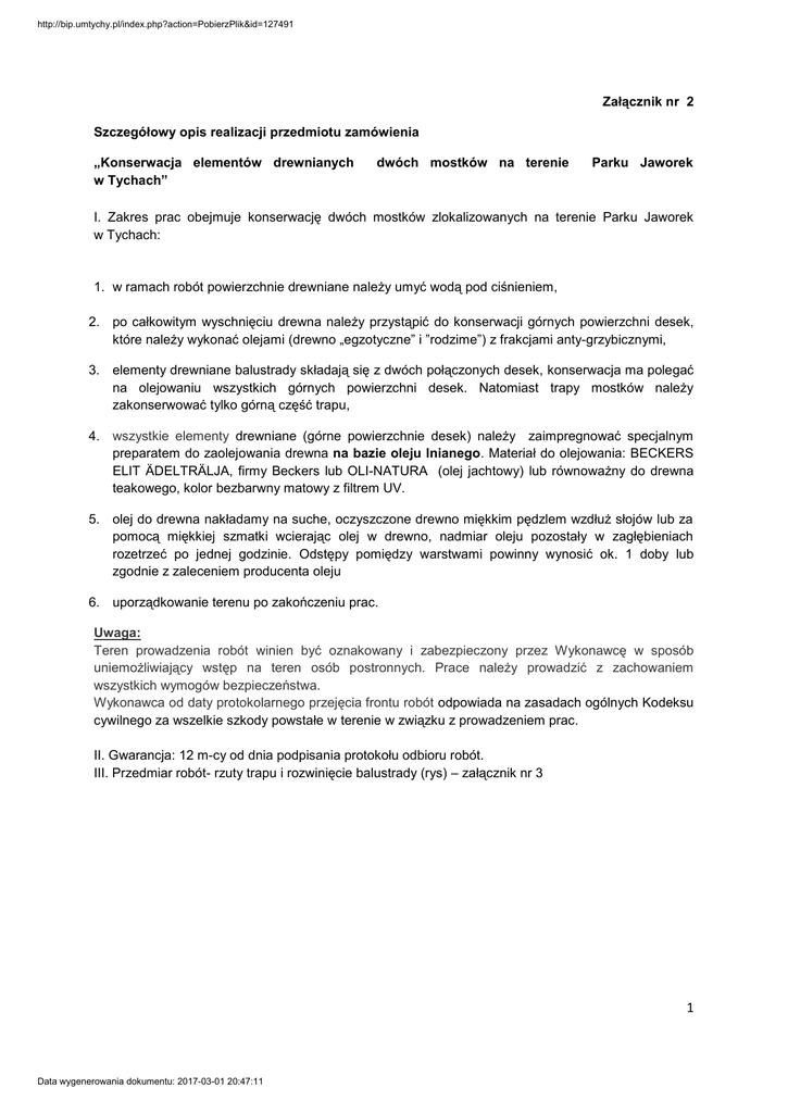 http://bip.umtychy.pl/index.php?action=PobierzPlik&id=127491 Załącznik nr 2 Szczegółowy opis realizacji przedmiotu zamówienia „Konserwacja elementów drewnianych w Tychach” dwóch mostków na terenie Parku Jaworek I. Zakres prac obejmuje konserwację dwóch mostków zlokalizowanych na terenie Parku Jaworek w Tychach: 1. w ramach robót powierzchnie drewniane należy umyć wodą pod ciśnieniem, 2. po całkowitym wyschnięciu drewna należy przystąpić do konserwacji górnych powierzchni desek, które należy wykonać olejami (drewno „egzotyczne” i ”rodzime”) z frakcjami anty-grzybicznymi, 3. elementy drewniane balustrady składają się z dwóch połączonych desek, konserwacja ma polegać na olejowaniu wszystkich górnych powierzchni desek. Natomiast trapy mostków należy zakonserwować tylko górną część trapu, 4. wszystkie elementy drewniane (górne powierzchnie desek) należy zaimpregnować specjalnym preparatem do zaolejowania drewna na bazie oleju lnianego. Materiał do olejowania: BECKERS ELIT ÄDELTRÄLJA, firmy Beckers lub OLI-NATURA (olej jachtowy) lub równoważny do drewna teakowego, kolor bezbarwny matowy z filtrem UV. 5. olej do drewna nakładamy na suche, oczyszczone drewno miękkim pędzlem wzdłuż słojów lub za pomocą miękkiej szmatki wcierając olej w drewno, nadmiar oleju pozostały w zagłębieniach rozetrzeć po jednej godzinie. Odstępy pomiędzy warstwami powinny wynosić ok. 1 doby lub zgodnie z zaleceniem producenta oleju 6. uporządkowanie terenu po zakończeniu prac. Uwaga: Teren prowadzenia robót winien być oznakowany i zabezpieczony przez Wykonawcę w sposób uniemożliwiający wstęp na teren osób postronnych. Prace należy prowadzić z zachowaniem wszystkich wymogów bezpieczeństwa. Wykonawca od daty protokolarnego przejęcia frontu robót odpowiada na zasadach ogólnych Kodeksu cywilnego za wszelkie szkody powstałe w terenie w związku z prowadzeniem prac. II. Gwarancja: 12 m-cy od dnia podpisania protokołu odbioru robót. III. Przedmiar robót- rzuty trapu i rozwinięcie balustrady (rys) – załącznik nr 3 1 Data wygenerowania dokumentu: 2017-03-01 20:47:11 Powered by TCPDF (www.tcpdf.org)