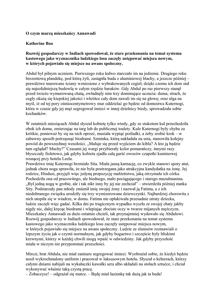 O czym marzą mieszkańcy Annawadi Katherine Boo Rozwój gospodarczy w Indiach spowodował, że stare przekonania na temat systemu kastowego jako wyznacznika ludzkiego losu zaczęły ustępować miejsca nowym, w których pojawiało się miejsce na awans społeczny. Abdul był pilnym uczniem. Pierwszego roku ledwo starczało im na jedzenie. Drugiego roku brezentową plandekę, pod którą żyli, zastąpiła buda z aluminiowej blachy, a jeszcze później – prawdziwe murowane ściany wzniesione z wybrakowanych cegieł, dzięki czemu ich dom stał się najsolidniejszą budowlą w całym rzędzie baraków. Gdy Abdul po raz pierwszy stanął przed świeżo wymurowaną chatą, owładnęły nim trzy dominujące uczucia: duma; strach, że cegły okażą się kiepskiej jakości i wkrótce cały dom zawali im się na głowę; oraz ulga na myśl, iż od tej pory ośmiocentymetrowy mur oddzielać go będzie od domostwa Kuternogi, która w czasie gdy jej mąż segregował śmieci w innej dzielnicy biedy, sprowadzała sobie kochanków. W ostatnich miesiącach Abdul słyszał kobietę tylko wtedy, gdy ze stukotem kul przechodziła obok ich domu, zmierzając na targ lub do publicznej toalety. Kule Kuternogi były chyba za krótkie, ponieważ by się na nich oprzeć, musiała wypiąć pośladki, a żeby zrobić krok – w zabawny sposób potrząsnąć biodrami. Szminka, którą nakładała na usta, stanowiła kolejny powód do powszechnej wesołości. „Maluje się przed wyjściem do kibla? A kto ją będzie tam oglądał? Muchy?” Czasami jej wargi przybierały kolor pomarańczy, innymi razy błyszczały fioletowo, jak gdyby kobieta zjadła całą garść owoców czapetki kuminowej rosnącej przy hotelu Leela. Prawdziwe imię Kuternogi brzmiało Sita. Miała jasną karnację, co zwykle stanowi spory atut, jednak chora noga sprawiła, że nie była postrzegana jako atrakcyjna kandydatka na żonę. Jej rodzice, Hindusi, przyjęli więc jedyną propozycję małżeństwa, jaką otrzymała ich córka. Pochodziła ona od pracowitego, ale biednego, mało pociągającego i starego muzułmanina. „Był jedną nogą w grobie, ale i tak nikt inny by jej nie zechciał” – stwierdziła później matka Sity. Podstarzały pan młody zmienił imię swojej żony i nazwał ją Fatima, a z ich niedobranego związku urodziły się trzy wymizerowane dziewczynki. Najbardziej chorowita z nich utopiła się w wiadrze, w domu. Fatima nie opłakiwała przesadnie utraty dziecka, ludzie zaczęli więc gadać. Kilka dni po tragicznym wypadku wyszła ze swojej chaty jakby nigdy nic, dalej kręcąc biodrami i wlepiając złociste oczy w twarze mijanych mężczyzn. Mieszkańcy Annawadi za dużo ostatnio chcieli, tak przynajmniej wydawało się Abdulowi. Rozwój gospodarczy w Indiach spowodował, że stare przekonania na temat systemu kastowego jako wyznacznika ludzkiego losu zaczęły ustępować miejsca nowym, w których pojawiało się miejsce na awans społeczny. Ludzie ze slumsów rozmawiali o lepszym życiu jak o czymś normalnym, jak gdyby bogactwo i szczęście były bliskimi krewnymi, którzy w każdej chwili mogą wpaść w odwiedziny. Jak gdyby przyszłość miała w niczym nie przypominać przeszłości. Mirczi, brat Abdula, nie miał zamiaru segregować śmieci. Wyobrażał sobie, że kiedyś będzie nosił wykrochmalony uniform i pracował w luksusowym hotelu. Słyszał o kelnerach, którzy całymi dniami nabijali na wykałaczki kawałki sera albo układali na stołach sztućce, i chciał wykonywać właśnie taką czystą pracę. – Zobaczysz! – odgrażał się matce. – Będę miał łazienkę tak dużą jak ta buda! Marzenia Radży Kamblego, chorego na serce sprzątacza toalet, który mieszkał ulicę od Abdula, związane były z osiągnięciami współczesnej medycyny. Mężczyzna marzył o nowej zastawce, która przedłużyłaby mu życie i umożliwiła wychowanie dzieci. Mieszkająca za rogiem piętnastoletnia Mina tęskniła za przygodą i wolnością, które widziała w serialach telewizyjnych, dlatego wcale nie kwapiła się do zaaranżowanego małżeństwa i życia posłusznej, przykładnej żony. Sunil, niewyrośnięty dwunastoletni śmieciarz, chciał wreszcie się najadać i zacząć rosnąć. Asza, zadziorna kobieta zajmująca barak nieopodal publicznej toalety, miała inne ambicje. Pragnęła zostać pierwszą kobietą zarządzającą slumsami, a następnie przenieść się do miasta i awansować do klasy średniej. Jej nastoletnia córka Mandżu za bardziej szlachetne uznawała własne aspiracje, ponieważ za cel postawiła sobie ukończenie studiów. Gdyby się jej powiodło, byłaby pierwszą wywodzącą się z Annawadi absolwentką uczelni wyższej. Najbardziej niedorzeczne marzenie, przynajmniej w opinii ogółu, miała jednak Kuternoga, którą interesowało tylko jedno: seks pozamałżeński. Jeżeli parałaby się tym zajęciem głównie w celach zarobkowych, ludzie zrozumieliby ją, ale kobiecie chodziło o coś innego. Pragnęła zdjąć z siebie odium, jakie nałożyła na nią niepełnosprawność, zyskać szacunek i być postrzegana jako atrakcyjna partnerka. Sąsiedzi z Annawadi uważali tymczasem, że mrzonki tego typu nie przystoją kalece. Pragnienia Abdula sprowadzały się do dwóch rzeczy: żony, która nie zna słów takich jak „alfons” czy „skurwiel” i która nie przywiązuje zbytniej wagi do tego, czym pachnie jej mąż; oraz domu, który znajdowałby się w jakimkolwiek innym miejscu, byle nie w Annawadi. Podobnie jak inni mieszkańcy slumsów, i na dobrą sprawę ludzie na całym świecie, chłopak wierzył, że jego marzenia w pełni odzwierciedlają jego możliwości. z angielskiego przełożyła Adriana Sokołowska-Ostapko (fragment książki „Zawsze piękne. Życie, śmierć i nadzieja w slumsach Bombaju” Katherine Boo, wyd. Znak)