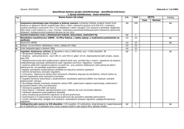 Sprawa: 05/ZA/2009 Lp. Załacznik nr 1 do SIWZ Specyfikacja dostawy sprzętu oświetleniowego - specyfikacja techniczna. I. Sprzęt oświetleniowy - Scena kameralna Nazwa towaru lub usługi J.m. Ilość NETTO Cena 1 2 3 4 4a 4b 5 6 kratownica aluminiowa typu trisystem w kolorze czarnym o przekroju trójkąta, grubość ścianki 2mm, średnica rur głównych 50mm, przekrój boku 29cm x 29cm, kratownice łączone na 6 śrub fi12. z kratownic uzyskać prostokąt o wymiarach 15m x 11m dodatkowo 3 belki o długości 11m wpisane w prostokąt, dodatkowo dwie wieże z w/w kratownicy- o wys. 7metrów (malowanie proszkowe))niedopuszczalne kratownice zakończone odlewami, niedopuszczalne kratownice łączone na tzw. kliny montaż kratownicy wraz z atestowanymi hakami, łańcuchami, zawiesiami itp. Naświetlacz asymetryczny 1000W , na filtry foliowe, z siatką zabezp ,z możliwością postawienia na podłodze Palnik R7S 1000W Uchwyt na rure 50mm, atestowany, czarny, udźwig min 10kg Linka zabezpieczająca z atestem 30kg regulator stacjonarny cyfrowy 36 obwodów o mocy 3,3KW każdy, wej, • liczba obwodów 36 • obciążalność każdego obwodu 3,3 kW • obudowa - szafa przyścienna - wys=140 cm, szer=56 cm, głęb= 20 cm, doprowadzenie kabli od góry, złącza typu ZUG • zabezpieczenie przed złym podłączeniem zasilania (brak zera, zamiana fazy z zerem) - pojawienie się napięcia międzyfazowego powoduje zablokowanie wyjść regulatora (ochrona i regulatora, i żarówek) • zasilanie elektroniki regulatora odporne na zaniki faz - przy zasilaniu trójfazowym zanik jednej lub dwóch, dowolnych faz, nie powoduje wyłączenia regulatora • łagodne wchodzenie wysterowanych obwodów po włączeniu zasilania regulatora • kontrola temperatury wewnątrz regulatora • cicha praca - dopiero przy bardzo złych warunkach chłodzenia włączają się wentylatory, których obroty są płynnie regulowane przez wewnętrzny komputer • wygodne elementy komunikacji z użytkownikiem: wyświetlacz graficzny128x64, trzy klawisze i pokrętło (potencjometr cyfrowy) • dla każdego obwodu możliwość ustawienia: adresu DMX, ograniczenia napięcia wyjściowego, podżarzenia i przypisania jednej z kilku charakterystyk • sterowanie sygnałem DMX lub lokalne • praca lokalna - możliwość zaprogramowania scen i efektów (55 scen lub kroków efektów) • możliwość testowania poszczególnych obwodów • pełna wizualizacja parametrów regulatora na ekranie graficznym: • wysterowanie w % pokazywane na ekranie graficznym dla wszystkich obwodów jednocześnie • rysunki charakterystyk ,podgląd scen lokalnych, wyświetlanie ustawień regulatora ,podgląd temperatury regulatora inteligentne pole ręczne na 120 obwodów ( 120 suwaków, 24 submastery, programowanie i zapamiętywanie do 12 spektakli po 12 zestawów scen, menu w języku polskim, dwa wyjścia dmx, gniazdo lampki) Katalog Wartość mb 100 tak kpl szt 1 10 tak szt szt szt kpl 10 10 10 3 tak kpl 1 tak tak Pulpit sterowniczy + pole dodatkowych submasterów w ilosci 2x20szt Obsługa min. 1024 urządzeń konwencjonalnych i automatycznych w komplecie dwa monitory LCD, przystawka umożliwiająca podłączenie dodatkowych suwaków oraz dwa skrzydła suwaków adresowanie min. 12 linii DMX współpraca z konwerterami Ethernet <-> DMX ,2 bezpośrednie wyjścia dwukierunkowego DMX w standardzie RDM niezależny przełącznik - wyciemnienie/zamrożenie/standard, min. 4 kołowe enkodery ze zintegrowanym przyciskiem - obsługa świateł automatycznych Zintegrowana klawiatura - możliwość nadawania nazw pamięciom i elementom spektaklu min. 4x999 palet (pozycja, kolor, plama, wszystkie),min. 999 grup, min. 999 makr, min. 999 sekwencji/pętli ,min. 999 stron masterów (potencjometrów odtwarzania),min. 999 szablonów efektów dynamicznych Konsoleta oświetleniowa obsługująca oprawy konwencjonalne, ruchome, LED oraz media , serwery w komplecie z dwoma monitorami LCD, pracująca w trybie graficznym wyposażona w dysk twardy, współpraca z siecią Ethernet 1 para konfigurowalnych potencjometrów CrossFader dla odtwarzania w stylu teatralnym potencjometr sumy generalnej Grand Master Fader min.14 klawiszy bezpośredniego wyboru z możliwością przełączania stron – błyskawiczny dostęp do widoków, grup, palet i efektów Import spektakli zapisanych na starszych konsoletach (Safari, Expert, Pronto, Presto, Strand 500, Expression, Emphasis) Graficzny interfejs obsługi oparty na sytemie Windows Embedded, w komplecie 2 monitory, polska instrukcja oraz polska wersja językowa interfejsu Wymiary: szerokość 440 (+/-10) mm x wysokość 140 (+/-10) mm x głębokość 460 (+/-10)mm Długość potencjometrów min. 45mm,Wymiary: szerokość 630 (+/-10) mm x wysokość 140 (+/-10) mm x głębokość 460 (+/-10)mm Moc maksymalna 10mW,Waga maksymalna 290g,Wymiary maksymalne 120mmx70mmx20mm Sterownie zgodne z normami europejskim dotyczące kompatybilności elektromagnetycznej EMC. Możliwość połączenia z dodatkowym panelem (skrzydłem) zawierającym 40 potencjometrów (masterów) sprzężonych z graficznymi wyświetlaczami LCD w pełni programowalnych. Podłączenie panela bez użycia kabli z obu stron konsolety .Możliwość podłączenia: mysz lub trackball, klawiatura, drukarka - Interfejs USB wejście i wyjście MIDI,Możliwość podłączenia radiowego sterowania bezprzewodowego. Panel zwierający 40 potencjometrów (masterów) w pełni programowalnych, sprzężonych z graficznymi wyświetlaczami LCD, Podłączenie panela do konsolety głównej bez użycia kabli zarówno z lewej jak i prawej strony w komplecie przystawka pozwalająca na podłączenie zewnętrznego pola ręcznego . szt 1 tak 8 Pilot zdalnego sterowania do pulpitu sterowniczego 9 pulpit obwodów nieregulowanych (6 obwodów)+wyłącznik główny do sterowania stycznikiem głównym 10 kaseta do sterowania pojedynczym obwodem nieregulowanym ( umieszczona przy wejściu na widownię oraz przy wejści