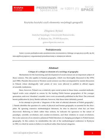 Krytyka Critique Krytyka krytyki czyli elementy socjologii geografii Zbigniew Rykiel Instytut Socjologii, Uniwersytet Rzeszowski, al. Rejtana 16c, 35-959 Rzeszów, [email protected] Podziękowania Autor wyraża podziękowanie anonimowemu recenzentowi, którego uwagi przyczyniły się do niewątpliwej poprawy argumentacji przedstawionej w niniejszym tekście. Abstract Critique of a critique or elements of a sociology of geography Mechanisms for the functioning and development of social sciences are an important subject of those sciences. This also applies to human geography, which was thoroughly discussed in the 1970s and 1980s. Pluralist discussion in Western social sciences was then accompanied by monist discussion in Poland, where ideologically „safe‟ points of view were allowed to publish in official organs of scientific institutions. Since, however, Poland was a relatively open social system in those times, essential methodological works were adopted as canons by the leading Polish human geographers of the younger generation, and even „dissident‟ scientific views were occasionally published in the West. The criticised herein publication by Jerzy Bański indicates, however, that those times definitely passed. In his attempt to provide a „diagnosis of the state of selected elements of Polish geography‟, J. Bański identifies the question of a unity of physical and human geography as essential for the discipline. By ignoring extensive methodological literature, he tries to discover what has yet been discovered. Referring to labels rather than notions, he indicates his ignorance in the nature of paradigm, scientific revolutions and counter-revolutions, and their relations to social revolutions. He is also unaware of an extensive polemical Polish literature on changing paradigms in Polish human geography. In this context, he misidentifies the role of the methodological conference in Rydzyna in 1983, in which he seems to believe in mythical rather than factual categories. socialspacejournal.eu 1 Krytyka krytyki czyli elementy socjologii geografii Most importantly, J. Bański does not refer to any theoretical concepts, and analyses symptoms rather than points to the mechanisms for change in Polish human geography. The latter could hardly be revealed while abstracted from social stratification within the geographical community, symbolic violence, the group formation processes, including interest groups and, especially, anti-developmental interest groups. The critical state of Polish geography he indicates is an even more explicit characteristic of the critical thinking of some Polish geographers who grew up in and were taught of the Orwellan vision of the history of the discipline. What the contemporary Polish human geography really needs is therefore a sociological analysis of geography. Słowa kluczowe: geografia społeczno-ekonomiczna, Rydzyna, rewolucja naukowa, przemoc symboliczna, selekcja negatywna kadr naukowych, socjologia geografii. Key words: human geography, Rydzyna, scientific revolution, symbolic violence, negative selection of scientific cadres, sociology of geography. Mechanizmy funkcjonowania i rozwoju nauki, w tym zwłaszcza nauk społecznych, są ważnym i interesującym przedmiotem badań tychże nauk. W odniesieniu do geografii społeczno-ekonomicznej mechanizmami tymi zajmowało się wielu badaczy, a żywa dyskusja metodologiczna, składająca się na pokaźną bibliotekę, toczyła się zwłaszcza w latach siedemdziesiątych i osiemdziesiątych XX wieku. Co ciekawe, lecz nie zaskakujące, żywej dyskusji na Zachodzie, w której wyrażano różne poglądy, towarzyszyła reglamentowana pseudodyskusja w Polsce. Monopolowi wydawniczemu, w którym rynek intelektualny zastąpiono oficjalnymi organami instytucji naukowych, towarzyszył tu nieuchronny w tych okolicznościach monizm metodologiczny, w ramach którego publikowano tylko poglądy „słuszne”, gdyż bezpieczne – bardziej zresztą dla establishmentu naukowego niż pozanaukowego. Szczęśliwie Polska lat siedemdziesiątych i osiemdziesiątych XX wieku była systemem społecznym względnie otwartym na świat zewnętrzny, istniała więc możliwość publikowania „dysydenckich” poglądów naukowych na Zachodzie, z której to możliwości polscy geografowie społeczno-ekonomiczni korzystali jednak powściągliwie, być może w przekonaniu, że rewolucji naukowych nie da się przeprowadzić zza miedzy. Cokolwiek by jednak mówić o tych trudnych czasach, socialspacejournal.eu 2 Krytyka krytyki czyli elementy socjologii geografii warto zauważyć, że dyskutowano wówczas o metodologii nauk społecznych, w tym geografii społeczno-ekonomicznej, i o rewolucjach naukowych, a podstawowe dzieła literatury światowej na ten temat były kanonem dla czołówki intelektualnej geografów polskich młodszego – całkiem wówczas licznego – pokolenia. Że czas ten już dawno minął, pokazuje publikacja Jerzego Bańskiego (2010), w której podjął się on „diagnozy stanu wybranych elementów polskiej geografii” (tamże: 401). Publikacja ta ma zarówno zalety, jak i wady. Do tych pierwszych należą: (1) podjęcie przez jej autora próby krytycznej oceny stanu geografii polskiej, (2) opublikowanie tego tekstu w „Przeglądzie Geograficznym”, uważanym wciąż za najpoważniejsze czasopismo geograficzne w Polsce, oraz (3) zaproszenie przez autora do dyskusji nad tym tekstem. Do wad tekstu należą natomiast: (1) ograniczone kompetencje autora z dziedziny metodologii i historii geografii polskiej, (2) rozpatrywanie geografii polskiej w izolacji od jej otoczenia społecznego, (3) słabość aparatury pojęciowej autora w zakresie nauk społecznych, w związku z czym przeprowadzona analiza jest powierzchowna, (4) mała precyzja w operowaniu językiem naukowym oraz (5) wątpliwość piszącego te słowa, czy „Przegląd Geograficzny” jest właściwym forum dla krytycznej analizy stanu geografii polskiej,