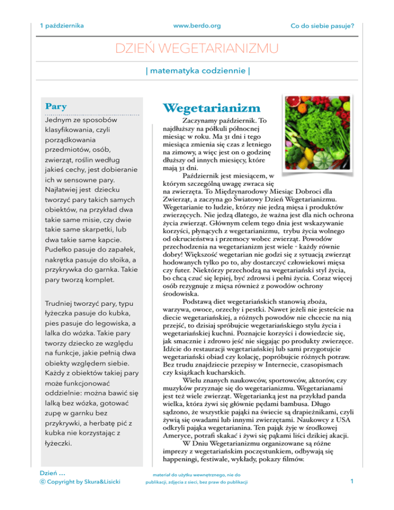 1 października www.berdo.org Co do siebie pasuje? DZIEŃ WEGETARIANIZMU | matematyka codziennie | Pary Wegetarianizm Jednym ze sposobów klasyfikowania, czyli Zaczynamy październik. To najdłuższy na półkuli północnej miesiąc w roku. Ma 31 dni i tego miesiąca zmienia się czas z letniego na zimowy, a więc jest on o godzinę dłuższy od innych miesięcy, które mają 31 dni. Październik jest miesiącem, w którym szczególną uwagę zwraca się na zwierzęta. To Międzynarodowy Miesiąc Dobroci dla Zwierząt, a zaczyna go Światowy Dzień Wegetarianizmu. Wegetarianie to ludzie, którzy nie jedzą mięsa i produktów zwierzęcych. Nie jedzą dlatego, że ważna jest dla nich ochrona życia zwierząt. Głównym celem tego dnia jest wskazywanie korzyści, płynących z wegetarianizmu, trybu życia wolnego od okrucieństwa i przemocy wobec zwierząt. Powodów przechodzenia na wegetarianizm jest wiele - każdy równie dobry! Większość wegetarian nie godzi się z sytuacją zwierząt hodowanych tylko po to, aby dostarczyć człowiekowi mięsa czy futer. Niektórzy przechodzą na wegetariański styl życia, bo chcą czuć się lepiej, być zdrowsi i pełni życia. Coraz więcej osób rezygnuje z mięsa również z powodów ochrony środowiska. Podstawą diet wegetariańskich stanowią zboża, warzywa, owoce, orzechy i pestki. Nawet jeżeli nie jesteście na diecie wegetariańskiej, a różnych powodów nie chcecie na nią przejść, to dzisiaj spróbujcie wegetariańskiego stylu życia i wegetariańskiej kuchni. Poznajcie korzyści i dowiedzcie się, jak smacznie i zdrowo jeść nie sięgając po produkty zwierzęce. Idźcie do restauracji wegetariańskiej lub sami przygotujcie wegetariański obiad czy kolację, popróbujcie różnych potraw. Bez trudu znajdziecie przepisy w Internecie, czasopismach czy książkach kucharskich. Wielu znanych naukowców, sportowców, aktorów, czy muzyków przyznaje się do wegetarianizmu. Wegetarianami jest też wiele zwierząt. Wegetarianką jest na przykład panda wielka, która żywi się głównie pędami bambusa. Długo sądzono, że wszystkie pająki na świecie są drapieżnikami, czyli żywią się owadami lub innymi zwierzętami. Naukowcy z USA odkryli pająka wegetarianina. Ten pająk żyje w środkowej Ameryce, potrafi skakać i żywi się pąkami liści dzikiej akacji. W Dniu Wegetarianizmu organizowane są różne imprezy z wegetariańskim poczęstunkiem, odbywają się happeningi, festiwale, wykłady, pokazy filmów. porządkowania przedmiotów, osób, zwierząt, roślin według jakieś cechy, jest dobieranie ich w sensowne pary. Najłatwiej jest dziecku tworzyć pary takich samych obiektów, na przykład dwa takie same misie, czy dwie takie same skarpetki, lub dwa takie same kapcie. Pudełko pasuje do zapałek, nakrętka pasuje do słoika, a przykrywka do garnka. Takie pary tworzą komplet. Trudniej tworzyć pary, typu łyżeczka pasuje do kubka, pies pasuje do legowiska, a lalka do wózka. Takie pary tworzy dziecko ze względu na funkcje, jakie pełnią dwa obiekty względem siebie. Każdy z obiektów takiej pary może funkcjonować oddzielnie: można bawić się lalką bez wózka, gotować zupę w garnku bez przykrywki, a herbatę pić z kubka nie korzystając z łyżeczki. Dzień … Copyright by Skura&Lisicki materiał do użytku wewnętrznego, nie do publikacji, zdjęcia z sieci, bez praw do publikacji 1 1 października www.berdo.org Co do siebie pasuje? Przygotujcie kartki (mogą być duże kartki formatu A3) kredki Warto W Polsce Międzynarodowy Dzień Wegetarianizmu organizuje Stowarzyszenie Empatia www.empatia.pl oraz Fundacja Viva! www.viva.org.pl. Dziecko powinno spożywać 5 porcji warzyw i owoców dziennie. Ile to porcja - tyle ile mieści się w dłoni dziecka. Pamiętajcie, że dziecko nie rodzi się z brakiem „genu szpinakowego“ i dlatego nie lubi szpinaku. Nie lubi, bo tego się nauczyło od dorosłych. Możecie więc łatwo nauczyć się razem lubić wszystkie warzyw i owoców. W Polsce rośnie popularność wegetarianizmu. Z badań wynika, że około miliona dorosłych mieszkańców Polski jest wegetarianami. Warzywno - owocowe memory na podłodze Zacznijcie od przygotowania kart do gry. Bedą to duże kartki, na których narysujecie pary różnych owoców, czy warzyw. W każdej parze będą takie same owoce lub warzywa, ale narysowany trochę inaczej, na przykład: małe jabłko i duże jabłko, żółta gruszka i zielona gruszka, marchewka z natką i marchewka bez natki, jedna malina i dużo malin, banan żółty i banan zielony. Im więcej kart przygotujecie, tym zadanie będzie trudniejsze. Dziecko uczy się tworzyć pary pasujących do siebie obiektów (małe jabłko i duże jabłko) liczyć i określać, ile jest posługiwać pojęciem para wskazywać i nazywać różne warzyw i owoce rozwija też pamięć wzrokową Dzień … Copyright by Skura&Lisicki Potasujcie karty. Na podłodze lub na trawie w ogródku rozłóżcie je w rzędach, na przykład 3 rzędy po 4 karty w każdym. Karty połóżcie obrazkami do dołu. Na zmienę odkrywajcie po dwie karty. Jeżeli będzie to para gracz zabiera ją i może odkryć kolejne dwie pary. Jeżeli nie będzie to para, to odwraca karty z powrotem. Gracie dopóki będą karty. Potem każdy z Was liczy karty, liczy pary kart i ten, kto ma więcej wygrywa. W nagrodę może przygotować sałatkę, oczywiście wegetariańską, na kolację. Na koniec „przeczytajcie“ wszystkie odkryte pary, na przykład: małe jabłko i duże jabłko. Możecie umówić się na inne dobieranie kart w pary: żółty banan i żółta gruszka; zielony banan i zielona gruszka … materiał do użytku wewnętrznego, nie do publikacji, zdjęcia z sieci, bez praw do publikacji 2