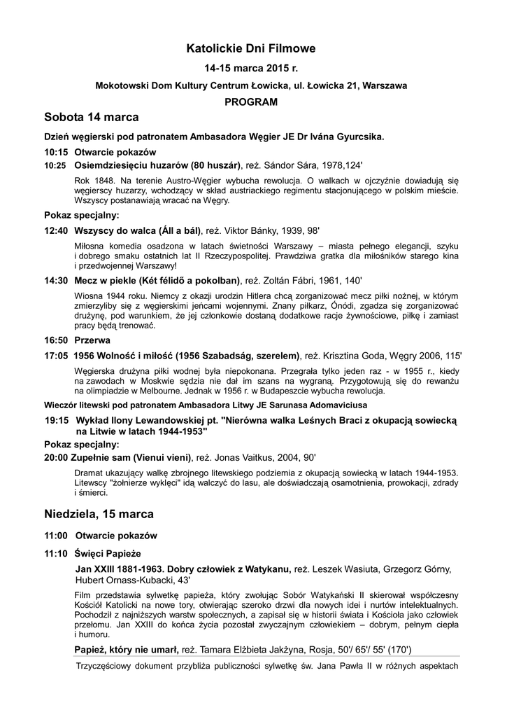 Katolickie Dni Filmowe 14-15 marca 2015 r. Mokotowski Dom Kultury Centrum Łowicka, ul. Łowicka 21, Warszawa PROGRAM Sobota 14 marca Dzień węgierski pod patronatem Ambasadora Węgier JE Dr Ivána Gyurcsika. 10:15 Otwarcie pokazów 10:25 Osiemdziesięciu huzarów (80 huszár), reż. Sándor Sára, 1978,124' Rok 1848. Na terenie Austro-Węgier wybucha rewolucja. O walkach w ojczyźnie dowiadują się węgierscy huzarzy, wchodzący w skład austriackiego regimentu stacjonującego w polskim mieście. Wszyscy postanawiają wracać na Węgry. Pokaz specjalny: 12:40 Wszyscy do walca (Áll a bál), reż. Viktor Bánky, 1939, 98' Miłosna komedia osadzona w latach świetności Warszawy – miasta pełnego elegancji, szyku i dobrego smaku ostatnich lat II Rzeczypospolitej. Prawdziwa gratka dla miłośników starego kina i przedwojennej Warszawy! 14:30 Mecz w piekle (Két félidő a pokolban), reż. Zoltán Fábri, 1961, 140' Wiosna 1944 roku. Niemcy z okazji urodzin Hitlera chcą zorganizować mecz piłki nożnej, w którym zmierzyliby się z węgierskimi jeńcami wojennymi. Znany piłkarz, Ónódi, zgadza się zorganizować drużynę, pod warunkiem, że jej członkowie dostaną dodatkowe racje żywnościowe, piłkę i zamiast pracy będą trenować. 16:50 Przerwa 17:05 1956 Wolność i miłość (1956 Szabadság, szerelem), reż. Krisztina Goda, Węgry 2006, 115' Węgierska drużyna piłki wodnej była niepokonana. Przegrała tylko jeden raz - w 1955 r., kiedy na zawodach w Moskwie sędzia nie dał im szans na wygraną. Przygotowują się do rewanżu na olimpiadzie w Melbourne. Jednak w 1956 r. w Budapeszcie wybucha rewolucja. Wieczór litewski pod patronatem Ambasadora Litwy JE Sarunasa Adomaviciusa 19:15 Wykład Ilony Lewandowskiej pt. "Nierówna walka Leśnych Braci z okupacją sowiecką na Litwie w latach 1944-1953" Pokaz specjalny: 20:00 Zupełnie sam (Vienui vieni), reż. Jonas Vaitkus, 2004, 90' Dramat ukazujący walkę zbrojnego litewskiego podziemia z okupacją sowiecką w latach 1944-1953. Litewscy "żołnierze wyklęci" idą walczyć do lasu, ale doświadczają osamotnienia, prowokacji, zdrady i śmierci. Niedziela, 15 marca 11:00 Otwarcie pokazów 11:10 Święci Papieże Jan XXIII 1881-1963. Dobry człowiek z Watykanu, reż. Leszek Wasiuta, Grzegorz Górny, Hubert Ornass-Kubacki, 43' Film przedstawia sylwetkę papieża, który zwołując Sobór Watykański II skierował współczesny Kościół Katolicki na nowe tory, otwierając szeroko drzwi dla nowych idei i nurtów intelektualnych. Pochodził z najniższych warstw społecznych, a zapisał się w historii świata i Kościoła jako człowiek przełomu. Jan XXIII do końca życia pozostał zwyczajnym człowiekiem – dobrym, pełnym ciepła i humoru. Papież, który nie umarł, reż. Tamara Elżbieta Jakżyna, Rosja, 50'/ 65'/ 55' (170') Trzyczęściowy dokument przybliża publiczności sylwetkę św. Jana Pawła II w różnych aspektach jego osobowości. Refleksje i wspomnienia przyjaciół i współpracowników papieża, ludzi kultury i sztuki, przywódców religijnych z ich osobistych spotkań z Janem Pawłem II. Pierwsza cześć filmu ukazuje charyzmat papieża w relacji do drugiego człowieka. Druga część przybliża jego artystyczną naturę na kanwie duchowego dziedzictwa Jana Pawła II. W trzeciej części spotkamy papieża we wspomnieniach aktorów, filmowców i ludzi kultury, ukazujących wpływ jaki wywarł na to środowisko. Według zamysłu rosyjskiej autorki film adresowany jest do rosyjskiego widza. Najważniejszym motywem jego powstania i jego celem nie było skonstruowanie fabuły, ale bezpośredni przekaz treści, które dotarłyby do serc widzów. Interesujące dla polskiego widza mogą być fragmenty filmu ukazujące reakcje patriarchatu prawosławnego oraz muftiego muzułmańskiego Rosji na zjawisko duchowe i społeczne, jakim był pontyfikat Papieża Polaka (gdy kręcono film, jeszcze błogosławionego). Po projekcji spotkanie z autorką (30'). 15:00 Przerwa 15:20 Cud prawdy, reż. Anna Teresa Pietraszek, 30' Dokument poświęcony postaci bł. ks Jerzego Popiełuszki. Ks. Jerzy rozpoczął posługę kapłańską w parafii św. Stanisława Kostki na warszawskim Żoliborzu na początku lat 80 ubiegłego wieku. W stanie wojennym jego kazania, mimo zastraszenia i ucisku przez władze totalitarne, budziły nadzieję, dawały siłę do przetrwania, budziły sumienia. Wzywały do wierności prawdzie: „(...) jesteśmy powołani do prawdy. Jesteśmy powołani do świadczenia o prawdzie swoim życiem. Bądźmy więc wierni prawdzie”. 19 października 1984 r. ks. Jerzy został porwany i brutalnie zamordowany. Mordercy zmaltretowane ciało księdza zrzucili do Wisły. Ks. Infułat Grzegorz Kalwarczyk, który był sędzią w procesie beatyfikacyjnym ks. Jerzego, odbierał jego ciało z prosektorium i był przy składaniu do trumny, zaświadcza: „ja widziałem ciało męczennika, zmasakrowane...”. A prymas Józef Glemp powiedział: „W dramacie tej śmierci ujawnił się obłęd całego systemu. Nikczemność systemu. Doprowadzał on ludzi aż do nienawiści, aż do zbrodni”. 16:00 Kod tajemnicy fatimskiej, reż. Rafał Tichy, Nelson Pereira, 50' 13 maja 1917 roku nieopodal miejscowości Fatima trojgu portugalskim dzieciom Franciszkowi i Hiacyncie Marto oraz Łucjii dos Santos po raz pierwszy ukazała się Matka Boża. Spotkania trwały do października. Maryja przekazała im trzy tajemnice, które w 1930 roku oficjalnie uznał Kościół Katolicki. Autorzy filmu podejmują problematykę trzeciej tajemnicy fatimskiej. Nieujawniona przez wiele lat była ona przedmiotem licznych spekulacji, analiz i proroctw, budziła silne emocje u wiernych. Twórcy przypominają czym jest trzecia tajemnica fatimska i stawiają pytanie o jej znaczenie dla współczesnego Kościoła Katolickiego. 16:50 Nie o Mary Wagner, reż. Grzegorz Braun, 57' Film opowiada historię Mary Wagner, katoliczki z Kanady więzionej i sądzonej w T