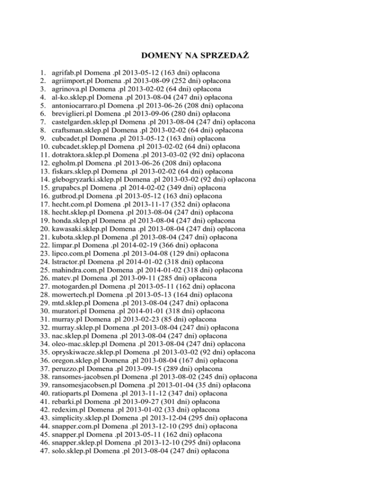 DOMENY NA SPRZEDAŻ 1. agrifab.pl Domena .pl 2013-05-12 (163 dni) opłacona 2. agriimport.pl Domena .pl 2013-08-09 (252 dni) opłacona 3. agrinova.pl Domena .pl 2013-02-02 (64 dni) opłacona 4. al-ko.sklep.pl Domena .pl 2013-08-04 (247 dni) opłacona 5. antoniocarraro.pl Domena .pl 2013-06-26 (208 dni) opłacona 6. breviglieri.pl Domena .pl 2013-09-06 (280 dni) opłacona 7. castelgarden.sklep.pl Domena .pl 2013-08-04 (247 dni) opłacona 8. craftsman.sklep.pl Domena .pl 2013-02-02 (64 dni) opłacona 9. cubcadet.pl Domena .pl 2013-05-12 (163 dni) opłacona 10. cubcadet.sklep.pl Domena .pl 2013-02-02 (64 dni) opłacona 11. dotraktora.sklep.pl Domena .pl 2013-03-02 (92 dni) opłacona 12. egholm.pl Domena .pl 2013-06-26 (208 dni) opłacona 13. fiskars.sklep.pl Domena .pl 2013-02-02 (64 dni) opłacona 14. glebogryzarki.sklep.pl Domena .pl 2013-03-02 (92 dni) opłacona 15. grupabcs.pl Domena .pl 2014-02-02 (349 dni) opłacona 16. gutbrod.pl Domena .pl 2013-05-12 (163 dni) opłacona 17. hecht.com.pl Domena .pl 2013-11-17 (352 dni) opłacona 18. hecht.sklep.pl Domena .pl 2013-08-04 (247 dni) opłacona 19. honda.sklep.pl Domena .pl 2013-08-04 (247 dni) opłacona 20. kawasaki.sklep.pl Domena .pl 2013-08-04 (247 dni) opłacona 21. kubota.sklep.pl Domena .pl 2013-08-04 (247 dni) opłacona 22. limpar.pl Domena .pl 2014-02-19 (366 dni) opłacona 23. lipco.com.pl Domena .pl 2013-04-08 (129 dni) opłacona 24. lstractor.pl Domena .pl 2014-01-02 (318 dni) opłacona 25. mahindra.com.pl Domena .pl 2014-01-02 (318 dni) opłacona 26. matev.pl Domena .pl 2013-09-11 (285 dni) opłacona 27. motogarden.pl Domena .pl 2013-05-11 (162 dni) opłacona 28. mowertech.pl Domena .pl 2013-05-13 (164 dni) opłacona 29. mtd.sklep.pl Domena .pl 2013-08-04 (247 dni) opłacona 30. muratori.pl Domena .pl 2014-01-01 (318 dni) opłacona 31. murray.pl Domena .pl 2013-02-23 (85 dni) opłacona 32. murray.sklep.pl Domena .pl 2013-08-04 (247 dni) opłacona 33. nac.sklep.pl Domena .pl 2013-08-04 (247 dni) opłacona 34. oleo-mac.sklep.pl Domena .pl 2013-08-04 (247 dni) opłacona 35. opryskiwacze.sklep.pl Domena .pl 2013-03-02 (92 dni) opłacona 36. oregon.sklep.pl Domena .pl 2013-08-04 (167 dni) opłacona 37. peruzzo.pl Domena .pl 2013-09-15 (289 dni) opłacona 38. ransomes-jacobsen.pl Domena .pl 2013-08-02 (245 dni) opłacona 39. ransomesjacobsen.pl Domena .pl 2013-01-04 (35 dni) opłacona 40. ratioparts.pl Domena .pl 2013-11-12 (347 dni) opłacona 41. rebarki.pl Domena .pl 2013-09-27 (301 dni) opłacona 42. redexim.pl Domena .pl 2013-01-02 (33 dni) opłacona 43. simplicity.sklep.pl Domena .pl 2013-12-04 (295 dni) opłacona 44. snapper.com.pl Domena .pl 2013-12-10 (295 dni) opłacona 45. snapper.pl Domena .pl 2013-05-11 (162 dni) opłacona 46. snapper.sklep.pl Domena .pl 2013-12-10 (295 dni) opłacona 47. solo.sklep.pl Domena .pl 2013-08-04 (247 dni) opłacona 48. stiga.sklep.pl Domena .pl 2013-08-04 (247 dni) opłacona 49. stihl.sklep.pl Domena .pl 2013-02-02 (64 dni) opłacona 50. tielburger.pl Domena .pl 2013-08-04 (247 dni) opłacona 51. toro.sklep.pl Domena .pl 2013-08-04 (247 dni) opłacona 52. traktorki.pl Domena .pl 2013-12-24 (309 dni) opłacona 53. valpadana.pl Domena .pl 2013-09-20 (294 dni) opłacona 54. vari.pl Domena .pl 2013-08-30 (273 dni) opłacona 55. victus.sklep.pl Domena .pl 2013-08-04 (247 dni) opłacona 56. wiedenmann.pl Domena .pl 2013-08-16 (259 dni) opłacona 57. wolfgarten.sklep.pl Domena .pl 2013-02-02 (64 dni) opłacona 58. yardman.pl Domena .pl 2013-05-12 (163 dni) opłacona 59. zamiatarki.sklep.pl Domena .pl 2013-03-02 (92 dni) opłacona Wszystkie domen są zaparkowane na serwerach HOME.PL Kod authinfo wydawany jest za darmo Wystawiamy faktury Vat