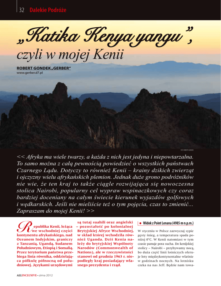 32 Dalekie Podróże „Katika Kenya yangu”, czyli w mojej Kenii ROBERT GONDEK „GERBER“ www.gerber.d7.pl FOT. ROBERT GONDEK << Afryka ma wiele twarzy, a każda z nich jest jedyna i niepowtarzalna. To samo można z całą pewnością powiedzieć o wszystkich państwach Czarnego Lądu. Dotyczy to również Kenii – krainy dzikich zwierząt i ojczyzny wielu afrykańskich plemion. Jednak duże grono podróżników nie wie, że ten kraj to także ciągle rozwijająca się nowoczesna stolica Nairobi, popularny cel wypraw wspinaczkowych czy coraz bardziej doceniany na całym świecie kierunek wyjazdów golfowych i wędkarskich. Jeśli nie mieliście też o tym pojęcia, czas to zmienić... Zapraszam do mojej Kenii! >> R są tutaj suahili oraz angielski zz Widok z Point Lenana (4985 m n.p.m.) epublika Kenii, leżąca – pozostałość po kolonialnej we wschodniej części Brytyjskiej Afryce Wschodniej, W styczniu w Polsce zazwyczaj sypie kontynentu afrykańskiego, nad w skład której wchodziła rów- gęsty śnieg, a temperatura spada poOceanem Indyjskim, graniczy nież Uganda. Dziś Kenia na- niżej 0°C. W Kenii natomiast w tym z Tanzanią, Ugandą, Sudanem leży do brytyjskiej Wspólnoty czasie panuje pora sucha. Do kenijskiej Południowym, Etiopią i Somalią. Narodów (Commonwealth of stolicy – Nairobi – przybywamy nocą, Przez terytorium państwa prze- Nations), ale w rzeczywistości bo duża część linii lotniczych oferubiega linia równika, oddzielają- stanowi od grudnia 1963 r. nie- je loty międzykontynentalne właśnie ca półkulę północną od połu- podległy kraj posiadający wła- w godzinach nocnych. Na lotnisku czeka na nas Jeff. Będzie nam towadniowej. Językami urzędowymi snego prezydenta i rząd. AllInclusive • zima 2012 Dalekie Podróże 33 FOT. ROBERT GONDEK zz Dolina Mackindera z endemicznymi senecjami rzyszył podczas całej podróży. Zawozi nas małym busem do hotelu w centrum Nairobi. Na drzewach rosnących wzdłuż drogi śpią ibisy i wielkie marabuty. Mijamy również kilka pomników słoni. Gdzieniegdzie zauważam ciemne sylwetki zwierząt majaczące w mroku… nek. Popijając coca-colę (którą w Afryce kupimy prawie wszędzie), obserwujemy orły szybujące nad tutejszym jeziorem. Na kolację udajemy się do restauracji Carnivore w centrum stolicy. Ze względów bezpieczeństwa przed wjazdem na teren obiektu samochód sprawdzany jest wykrywaczem bomb. Na miejscu za 35 dolarów możemy najeść się do syta. Do wyboru mamy różne rodzaje mięsa z grilla, z których próbujemy indyka, kurczaka, wołowiny, wieprzowiny, strusia, krokodyla i barana. Rząd kenijski wprowadził w 2004 r. zakaz sprzedaży mięsa dzikich zwierząt. Dlatego, FOT. ROBERT GONDEK Nairobi – nowoczesna metropolia Rankiem budzą nas ptaki, które śpiewają za oknem. Zwiedzanie Kenii zaczynamy od Nairobi. Nad tym nowoczesnym i czystym miastem góruje kilka wysokich wieżowców. Na jednym z nich – Kenyatta International Convention Centre (KICC), oprócz lądowiska dla helikopterów, znajduje się znakomity punkt widokowy. Wypatrujemy z niego Parku Wolności (w języku suahili Uhuru Park). Niedługo potem zatrzymujemy się w nim na krótki odpoczyzz Nowoczesne centrum Nairobi zima 2012 • AllInclusive 34 Dalekie Podróże FOT. ROBERT GONDEK żeby sprawdzić, jak smakuje potrawa z elanda, kudu, guźca czy zebry, musimy udać się do RPA lub Namibii. W Kenii za najbardziej egzotyczne pozycje z menu uchodzą specjały ze strusia i krokodyla oraz bycze jaja. Warto wspomnieć, że lokalnymi środkami płatniczymi są zarówno szylingi kenijskie, jak i dolary amerykańskie. Trzeba tylko pamiętać, że banknoty powinny być nowe i o dużych nominałach (najlepiej studolarowe), bo starszych niż 5-letnie nikt nie chce przyjmować. zz Potężna Dolina Gorgesa z licznymi malowniczymi jeziorkami Na potrzeby drobniejszych zakupów lepiej wymienić dolary w jednym z licznych kantorów albo skorzystać z bankomatów. Organizację safari lub trekkingu opłacimy już jednak tylko walutą amerykańską. tu Afryki (po Kilimandżaro) – Kenii (5199 m n.p.m.). Z Nairobi do Parku Narodowego Góry Kenia (Mount Kenya National Park) wyjeżdżamy autostradą z trzema pasami ruchu w każdą stronę. W rzeczywistości obok siebie porusza się tu tyle pojazdów, ile mieści się na całej szerokości jezdni. W niektóMasyw Kenia – śnieg na równiku rych miejscach brakuje również asfaltu. Następnego dnia wyruszamy z Jeffem Z każdym kilometrem droga staje się w stronę drugiego najwyższego szczy- coraz węższa. Wokół nas rozpościera FOT. ROBERT GONDEK się charakterystyczna czerwona afrykańska ziemia. W oddali dostrzegamy ośnieżone wierzchołki wulkanu Kenia. Mijamy równik i po 3 godz. docieramy do bramy parku narodowego. Na szczyt prowadzi kilka szlaków – my wybraliśmy Sirimon Route. Zdobycie najwyższego punktu Kenii, w przeciwieństwie do leżącego ok. 400 km na południe Kilimandżaro, wymaga – niestety – umiejętności wspinaczkowych. Na szczęście masyw posiada kilka wierzchołków. Dwa najwyższe z nich (Batian – 5199 m n.p.m. i Nelion – 5188 m n.p.m.) zostawiamy doświadczonym alpinistom, a sami wybieramy trzeci w kolejności – Point Lenana (4985 m n.p.m.) – idealny na trekking. zz Ostatnie 200 m na Point Lenana to śnieg i lód AllInclusive • zima 2012 Dalekie Podróże 35 FOT. ROBERT GONDEK zz Przełęcz nad jeziorem Harris Tarn Aby wejść na jego szczyt, wystarczy w miarę dobra kondycja i odporność na zmiany wysokości. Przed nami 4-dniowa wędrówka z przewodnikiem, tragarzami i kucharzem. Pierwszego dnia już zaledwie po 3 godz. zatrzymujemy się na wysokości 3300 m n.p.m. w Old Moses Hut, niewielkiej chacie z kilkoma pokojami. Znajdują się w niej po 4 piętrowe łóżka i przewiewne okna, dzięki którym do środka wciąż wpada świeże powietrze. Drugiego dnia wędrujemy przez jedną z najpiękniejszych kotlin Afryki – Dolinę Mackinde
