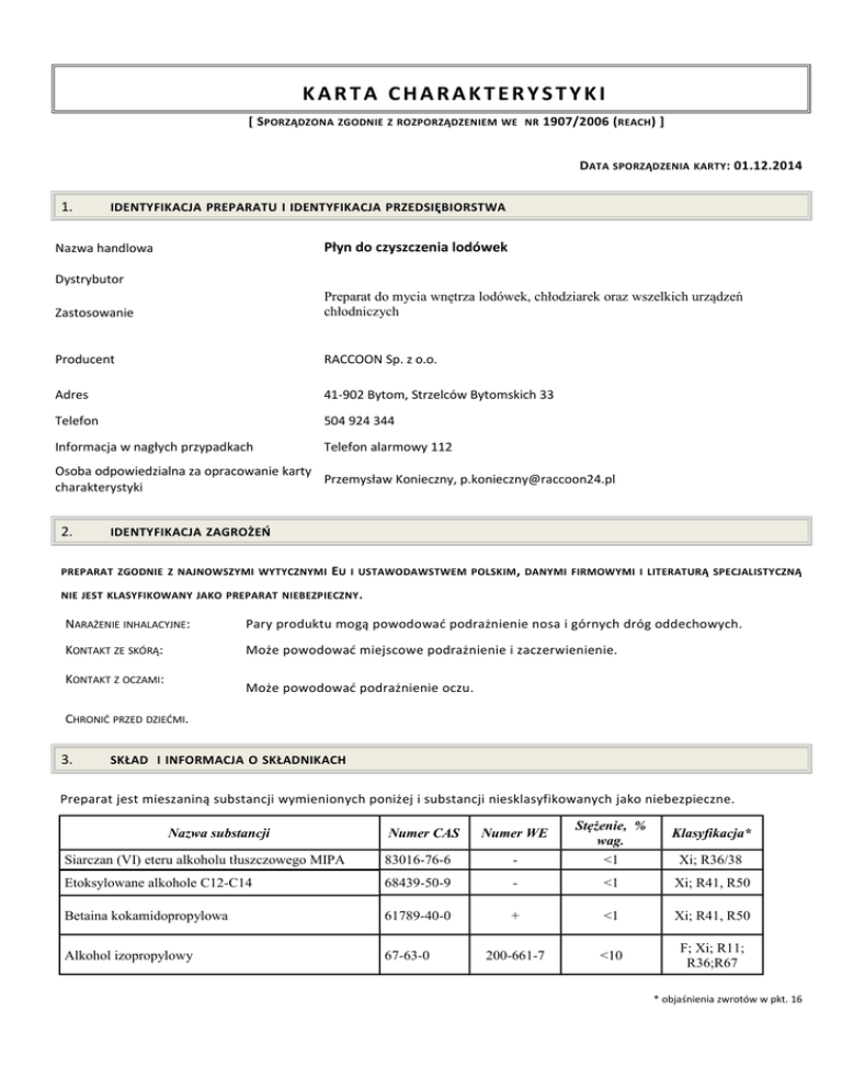 KARTA CHARAKTERYSTYKI [ SPORZĄDZONA ZGODNIE Z ROZPORZĄDZENIEM WE NR 1907/2006 (REACH ) ] DATA SPORZĄDZENIA KARTY: 01.12.2014 1. IDENTYFIKACJA PREPARATU I IDENTYFIKACJA PRZEDSIĘBIORSTWA Płyn do czyszczenia lodówek Nazwa handlowa Dystrybutor Zastosowanie Preparat do mycia wnętrza lodówek, chłodziarek oraz wszelkich urządzeń chłodniczych Producent RACCOON Sp. z o.o. Adres 41-902 Bytom, Strzelców Bytomskich 33 Telefon 504 924 344 Informacja w nagłych przypadkach Telefon alarmowy 112 Osoba odpowiedzialna za opracowanie karty Przemysław Konieczny, [email protected] charakterystyki 2. IDENTYFIKACJA ZAGROŻEŃ PREPARAT ZGODNIE Z NAJNOWSZYMI WYTYCZNYMI EU I USTAWODAWSTWEM POLSKIM , DANYMI FIRMOWYMI I LITERATURĄ SPECJALISTYCZNĄ NIE JEST KLASYFIKOWANY JAKO PREPARAT NIEBEZPIECZNY . NARAŻENIE INHALACYJNE: Pary produktu mogą powodować podrażnienie nosa i górnych dróg oddechowych. KONTAKT ZE SKÓRĄ: Może powodować miejscowe podrażnienie i zaczerwienienie. KONTAKT Z OCZAMI: Może powodować podrażnienie oczu. CHRONIĆ PRZED DZIEĆMI. 3. SKŁAD I INFORMACJA O SKŁADNIKACH Preparat jest mieszaniną substancji wymienionych poniżej i substancji niesklasyfikowanych jako niebezpieczne. Nazwa substancji Numer CAS Numer WE Stężenie, % wag. Klasyfikacja* Siarczan (VI) eteru alkoholu tłuszczowego MIPA 83016-76-6 - <1 Xi; R36/38 Etoksylowane alkohole C12-C14 68439-50-9 - <1 Xi; R41, R50 Betaina kokamidopropylowa 61789-40-0 + <1 Xi; R41, R50 Alkohol izopropylowy 67-63-0 200-661-7 <10 F; Xi; R11; R36;R67 * objaśnienia zwrotów w pkt. 16 4. PIERWSZA POMOC DROGI ODDECHOWE : Wyprowadzić na świeże powietrze; w przypadku trudności z oddychaniem skontaktować się z lekarzem. KONTAKT Z OCZAMI : Przemywać wielokrotnie dużą ilością czystej wody trzymając szeroko otwarte powieki przez 10 min. Skontaktować się z lekarzem. KONTAKT ZE SKÓRĄ : Zdjąć zanieczyszczoną odzież. Skórę przemyć wodą. SPOŻYCIE : Nie wymuszać wymiotów. Przepłukać usta wodą. Pić wodę. Skontaktować się z lekarzem. Osobie nieprzytomnej nie podawać niczego do ust. 5. POSTĘPOWANIE W PRZYPADKU POŻARU Preparat zawiera niewielką ilość składnika wysoce łatwopalnego w roztworze wodnym. Nie został sklasyfikowany jako preparat łatwopalny. ŚRODKI GAŚNICZE ZALECANE : Piana, agregaty CO2 , proszek lub rozpryskujący się strumień wody ŚRODKI GAŚNICZE NIEODPOWIEDNIE : brak NIEBEZPIECZNE PRODUKTY ROZKŁADU W wyniku rozkładu w czasie spalania mogą powstawać toksyczne gazy ŚRODKI OCHRONY OSOBISTEJ : Odzież ognioodporna i aparat izolujący do oddychania. 6. POSTĘPOWANIE W PRZYPADKU NIEZAMIERZONEGO UWOLNIENIA DO ŚRODOWISKA INDYWIDUALNE ŚRODKI OSTROŻNOŚCI: Należy przestrzegać ogólnych zasad bezpieczeństwa. Zadbać o dobrą wentylacje. ŚRODKI OSTROŻNOŚCI W ODNIESIENIU DO ŚRODOWISKA: Nie należy dopuścić do przedostania się produktu do wód gruntowych lub powierzchniowych. W przypadku uwolnienia większych ilości powiadomić odpowiednie służby ratownicze. METODY OCZYSZCZANIA: Zapewnić odpowiednią wentylację. Wylany materiał usunąć mechanicznie, resztę zebrać do pojemnika na odpady za pomocą substancji adsorbującej ciecz (np. mączka drzewna, ziemia okrzemkowa, piasek, trociny). Dalsze informacje na temat usuwania odpadów patrz rozdział. 13. Zanieczyszczone powierzchnie spłukać wodą. 7. POSTĘPOWANIE Z PREPARATEM I JEGO MAGAZYNOWANIE Podczas stosowania i przechowywania produktu przestrzegać ogólnie obowiązujące przepisy BHP POSTĘPOWANIE Z PREPARATEM: Postępować tak jak w przypadku preparatów chemicznych; zapewnić dobrą wentylację pomieszczeń. Nie rozpylać nad otwartym płomieniem lub żarzącym materiałem. Nie palić w czasie aplikacji. Nie mieszać zawartości pojemników z innymi chemikaliami. MAGAZYNOWANIE: Przechowywać z dala od źródeł zapłonu w pomieszczeniach wentylowanych. Nie palić tytoniu. Nie przechowywać razem z mocnymi kwasami, zasadami i środkami utleniającymi lub redukującymi, gumą, plastikami, aluminium i metalami lekkimi. Magazynować w suchym i dobrze wentylowanym miejscu w oryginalnych pojemnikach w pozycji pionowej. Po otwarciu opakowanie należy zamykać. Chronić przed bezpośrednim światłem słonecznym i wysoką temperaturą. Nie przechowywać z żywnością, napojami i paszą. Chronić przed dziećmi. 8. KONTROLA NARAŻENIA I ŚRODKI OCHRONY INDYWIDUALNEJ Preparat zawiera składnik szkodliwy dla zdrowia w środowisku pracy (wg regulacji o najwyższych dopuszczalnych stężeniach w zależności od czasu narażenia w ciągu zmiany roboczej zawartych w Dz. U. Nr 217 poz. 1833 z 29.11.2002 oraz zmianami Dz. U. Nr 212 poz. 1769 z 10.10.2005 r.) IZOPROPANOL NDS – MG/M3 NDSCH – 1200 MG/M3 ZALECENIA OGÓLNE: W miejscu pracy należy zapewnić punkt do mycia i płukania oczu. Sprzęt ochronny osobistej powinien znajdować się w miejscu pracy. OCHRONA DRÓG ODDECHOWYCH: Preparat nie stwarza zagrożenia podczas normalnego użytkowania preparatu i przestrzeganiu zaleceń bezpieczeństwa. OCHRONA OCZU: Stosować okulary ochronne. OCHRONA RĄK: Rękawice ochronne OCHRONA SKÓRY: Odzież robocza, buty robocze. HIGIENA PRACY: Stanowiska do przemywania oczu i prysznice w miejscach zagrożenia. ROZWIĄZANIA TECHNICZNE: Podczas pracy w kontakcie z produktem stosować odpowiednie środki mające na celu zminimalizowanie kontaktu z produktem i poprawę stanu BHP. 9. WŁAŚCIWOŚCI FIZYCZNE I CHEMICZNE INFORMACJE OGÓLNE Postać Kolor Zapach WAŻNE INFORMACJE DOTYCZĄCE ZDROWIA, BEZPIECZEŃSTWA I ŚRODOWISKA pH Temperatura wrzenia Temperatura zapłonu Palność Właściwości wybuchowe Właściwości utleniające Prężność par Gęstość względna Rozpuszczalność w wodzie Współczynnik podziału: n-oktanol/woda Gęstość par Szybkość parowania INNE INFORMACJE rozpuszczalność w tłuszczach przewodnictwo elektryczne temperatura topnienia temperatura samozapłonu Mieszanina cieczy Mleczno - biały Charakterystyczny dla uzyt