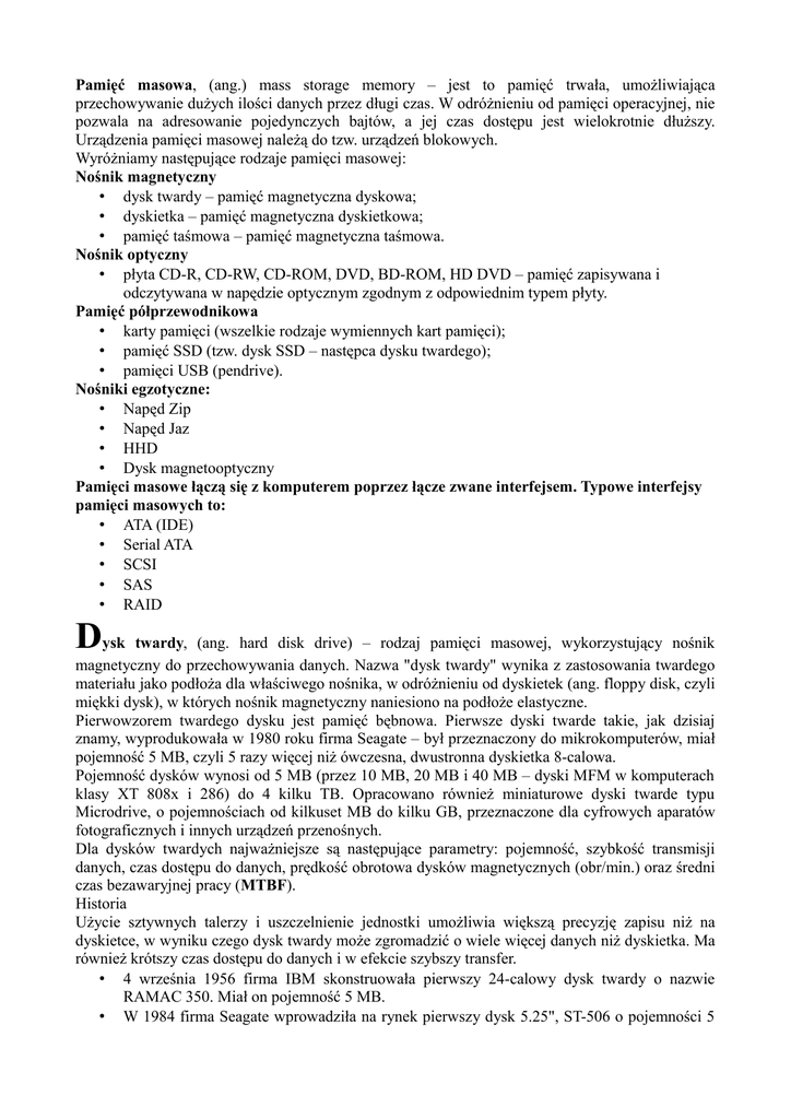Pamięć masowa, (ang.) mass storage memory – jest to pamięć trwała, umożliwiająca przechowywanie dużych ilości danych przez długi czas. W odróżnieniu od pamięci operacyjnej, nie pozwala na adresowanie pojedynczych bajtów, a jej czas dostępu jest wielokrotnie dłuższy. Urządzenia pamięci masowej należą do tzw. urządzeń blokowych. Wyróżniamy następujące rodzaje pamięci masowej: Nośnik magnetyczny • dysk twardy – pamięć magnetyczna dyskowa; • dyskietka – pamięć magnetyczna dyskietkowa; • pamięć taśmowa – pamięć magnetyczna taśmowa. Nośnik optyczny • płyta CD-R, CD-RW, CD-ROM, DVD, BD-ROM, HD DVD – pamięć zapisywana i odczytywana w napędzie optycznym zgodnym z odpowiednim typem płyty. Pamięć półprzewodnikowa • karty pamięci (wszelkie rodzaje wymiennych kart pamięci); • pamięć SSD (tzw. dysk SSD – następca dysku twardego); • pamięci USB (pendrive). Nośniki egzotyczne: • Napęd Zip • Napęd Jaz • HHD • Dysk magnetooptyczny Pamięci masowe łączą się z komputerem poprzez łącze zwane interfejsem. Typowe interfejsy pamięci masowych to: • ATA (IDE) • Serial ATA • SCSI • SAS • RAID Dysk twardy, (ang. hard disk drive) – rodzaj pamięci masowej, wykorzystujący nośnik magnetyczny do przechowywania danych. Nazwa "dysk twardy" wynika z zastosowania twardego materiału jako podłoża dla właściwego nośnika, w odróżnieniu od dyskietek (ang. floppy disk, czyli miękki dysk), w których nośnik magnetyczny naniesiono na podłoże elastyczne. Pierwowzorem twardego dysku jest pamięć bębnowa. Pierwsze dyski twarde takie, jak dzisiaj znamy, wyprodukowała w 1980 roku firma Seagate – był przeznaczony do mikrokomputerów, miał pojemność 5 MB, czyli 5 razy więcej niż ówczesna, dwustronna dyskietka 8-calowa. Pojemność dysków wynosi od 5 MB (przez 10 MB, 20 MB i 40 MB – dyski MFM w komputerach klasy XT 808x i 286) do 4 kilku TB. Opracowano również miniaturowe dyski twarde typu Microdrive, o pojemnościach od kilkuset MB do kilku GB, przeznaczone dla cyfrowych aparatów fotograficznych i innych urządzeń przenośnych. Dla dysków twardych najważniejsze są następujące parametry: pojemność, szybkość transmisji danych, czas dostępu do danych, prędkość obrotowa dysków magnetycznych (obr/min.) oraz średni czas bezawaryjnej pracy (MTBF). Historia Użycie sztywnych talerzy i uszczelnienie jednostki umożliwia większą precyzję zapisu niż na dyskietce, w wyniku czego dysk twardy może zgromadzić o wiele więcej danych niż dyskietka. Ma również krótszy czas dostępu do danych i w efekcie szybszy transfer. • 4 września 1956 firma IBM skonstruowała pierwszy 24-calowy dysk twardy o nazwie RAMAC 350. Miał on pojemność 5 MB. • W 1984 firma Seagate wprowadziła na rynek pierwszy dysk 5.25", ST-506 o pojemności 5 MB. • W 1986 został opracowany kontroler IDE (Integrated Drive Electronics). • W 1987 rozpoczęła się era dysków 3,5 cala • W 2008 pojawiły się dyski SSD. Na początku technologia ta była bagatelizowana przez dużych graczy (np. Western Digital). Jednak stosunkowo duże zainteresowanie rynku mimo bardzo wysokiej ceny, duża wydajność dzięki minimalnemu czasowi dostępu do danych oraz malejąca cena za MB szybko zmieniła ich nastawienie. • Od marca 2012 roku na rynku pozostało jedynie 3 producentów dysków twardych: Western Digital, Seagate Technology oraz Toshiba. BUDOWA DYSKU: Dysk stały składa się z zamkniętego w obudowie, wirującego talerza (dysku) lub zespołu talerzy, wykonanych najczęściej ze stopów aluminium, o wypolerowanej powierzchni, pokrytej nośnikiem magnetycznym o grubości kilku mikrometrów, oraz z głowic elektromagnetycznych umożliwiających zapis i odczyt danych. Na każdą powierzchnię talerza dysku przypada po jednej głowicy odczytu i zapisu. Głowice są umieszczone na elastycznych ramionach i w stanie spoczynku stykają się z talerzem blisko jego osi. W czasie pracy unoszą się, a ich odległość nad talerzem jest stabilizowana dzięki sile aerodynamicznej powstałej w wyniku szybkich obrotów talerza. Ramię głowicy dysku ustawia głowice w odpowiedniej odległości od osi obrotu talerza w celu odczytu lub zapisu danych na odpowiednim cylindrze. Najpopularniejszym obecnie jest tzw. voice coil czyli cewka, wzorowana na układzie magnetodynamicznym stosowanym w głośnikach. Umieszczona w silnym polu magnetycznym cewka porusza się i zajmuje położenie zgodnie z przepływającym przez nią prądem, ustawiając ramię w odpowiedniej pozycji. Dzięki temu czas przejścia między kolejnymi ścieżkami jest nawet krótszy niż 1 milisekunda, a przy większych odległościach nie przekracza kilkudziesięciu milisekund. Informacja jest zapisywana na dysk przez przesyłanie strumienia elektromagnetycznego przez antenę albo głowicę zapisującą, która jest bardzo blisko magnetycznie polaryzowalnego materiału, zmieniającego swoją polaryzacją magnetyczną. Informacja może być z powrotem odczytana w odwrotny sposób, gdyż zmienne pole magnetyczne powoduje indukowanie napięcia elektrycznego w cewce głowicy lub zmianę oporu w głowicy magnetyczno-oporowej. Ramiona połączone są zworą i poruszają się razem. Zwora kieruje głowicami promieniowo po talerzach a w miarę rotacji talerzy, daje każdej głowicy dostęp do całości jej talerza. Zintegrowana elektronika kontroluje ruch zwory, obroty dysku, oraz przygotowuje odczyty i zapisy na rozkaz od kontrolera dysku. Nowoczesne układy elektroniczne są zdolne do skutecznego szeregowania odczytów i zapisów na przestrzeni dysku oraz do zastępowania uszkodzonych sektorów zapasowymi. Obudowa chroni części napędu od pyłu, pary wodnej, i innych źródeł zanieczyszczenia. Jakiekolwiek zanieczyszczenie głowic lub talerzy może doprowadzić do uszkodzenia głowicy (head crash), awarii dysku, w której głowica uszkadza talerz, ścierając cienką wa