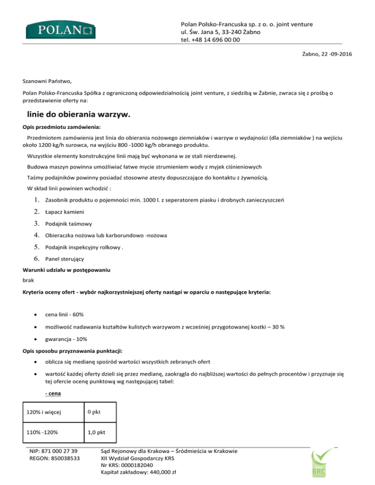 Polan Polsko-Francuska sp. z o. o. joint venture ul. Św. Jana 5, 33-240 Żabno tel. +48 14 696 00 00 Żabno, 22 -09-2016 Szanowni Państwo, Polan Polsko-Francuska Spółka z ograniczoną odpowiedzialnością joint venture, z siedzibą w Żabnie, zwraca się z prośbą o przedstawienie oferty na: linie do obierania warzyw. Opis przedmiotu zamówienia: Przedmiotem zamówienia jest linia do obierania nożowego ziemniaków i warzyw o wydajności (dla ziemniaków ) na wejściu około 1200 kg/h surowca, na wyjściu 800 -1000 kg/h obranego produktu. Wszystkie elementy konstrukcyjne linii mają być wykonana w ze stali nierdzewnej. Budowa maszyn powinna umożliwiać łatwe mycie strumieniem wody z myjek ciśnieniowych Taśmy podajników powinny posiadać stosowne atesty dopuszczające do kontaktu z żywnością. W skład linii powinien wchodzić : 1. Zasobnik produktu o pojemności min. 1000 l. z seperatorem piasku i drobnych zanieczyszczeń 2. Łapacz kamieni 3. Podajnik taśmowy 4. Obieraczka nożowa lub karborundowo -nożowa 5. Podajnik inspekcyjny rolkowy . 6. Panel sterujący Warunki udziału w postępowaniu brak Kryteria oceny ofert - wybór najkorzystniejszej oferty nastąpi w oparciu o następujące kryteria: cena linii - 60% możliwość nadawania kształtów kulistych warzywom z wcześniej przygotowanej kostki – 30 % gwarancja - 10% Opis sposobu przyznawania punktacji: oblicza się medianę spośród wartości wszystkich zebranych ofert wartość każdej oferty dzieli się przez medianę, zaokrągla do najbliższej wartości do pełnych procentów i przyznaje się tej ofercie ocenę punktową wg następującej tabel: - cena 120% i więcej 0 pkt 110% -120% 1,0 pkt NIP: 871 000 27 39 REGON: 850038533 Sąd Rejonowy dla Krakowa – Śródmieścia w Krakowie XII Wydział Gospodarczy KRS Nr KRS: 0000182040 Kapitał zakładowy: 440,000 zł 90% - 110% 2,0 pkt 80% - 90% 3,0 pkt 70% - 80% 4,0 pkt 70% i mniej 5,0 pkt -możliwość nadawania regularnych kształtów kulistych warzywom z wcześniej przygotowanej kostki brak 0,0 pkt możliwość 5,0 pkt -gwarancja brak 0,0 pkt 1 rok 1 pkt 2 lata 2,0 pkt pow. 2 lat 5,0 pkt Informacja na temat zakresu wykluczenia brak Termin składania ofert termin składania ofert upływa: 30.09.2016, liczy się data wpłynięcia oferty do siedziby zamawiającego Termin realizacji zamówienia ostateczny możliwy do zaakceptowania termin realizacji zamówienia upływa: 30.11.2016 Formy składania oferty e-mail na adres: [email protected] osobiście w siedzibie zamawiającego: Polan Polsko-Francuska Spółka z ograniczoną odpowiedzialnością joint venture, ul. Św. Jana 5, 33-240 Żabno, Polska pisemnie, za pośrednictwem kuriera lub poczty na adres: Polan Polsko-Francuska Spółka z ograniczoną odpowiedzialnością joint venture, ul. Św. Jana 5, 33-240 Żabno, Polska Złożona oferta powinna zawierać co najmniej: dane identyfikujące oferenta (pełna nazwa i adres) imię i nazwisko oraz podpis osoby upoważnionej do występowania w imieniu oferenta datę sporządzenia oferty 2 opis nawiązujący do parametrów wyszczególnionych w zapytaniu ofertowym (opis przedmiotu zamówienia) warunki serwisu i gwarancji wartość oferty netto w polskich złotych oraz wartość podatku VAT. Oferty w walucie innej niż PLN będą przeliczone na złotówki wg średniego kursu NBP z daty oferty. warunki płatności termin realizacji zamówienia termin ważności oferty referencje podające przedsiębiorstwa i firmy gdzie pracują linie oferowane przez składającego ofertę (o podobnej wydajności). Wszelkie pytania dotyczące oferty proszę kierować do: Tadeusz Stasik, tel. +48 695 58 31 32, e-mail. [email protected] Tadeusz Stasik Dyrektor ds. Technicznych 3
