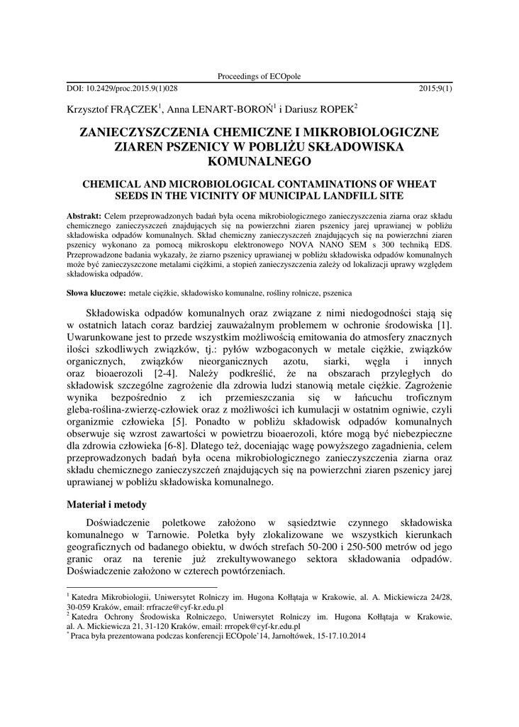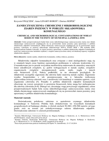 Proceedings of ECOpole DOI: 10.2429/proc.2015.9(1)028 2015;9(1) Krzysztof FRĄCZEK1, Anna LENART-BOROŃ1 i Dariusz ROPEK2 ZANIECZYSZCZENIA CHEMICZNE I MIKROBIOLOGICZNE ZIAREN PSZENICY W POBLIŻU SKŁADOWISKA KOMUNALNEGO CHEMICAL AND MICROBIOLOGICAL CONTAMINATIONS OF WHEAT SEEDS IN THE VICINITY OF MUNICIPAL LANDFILL SITE Abstrakt: Celem przeprowadzonych badań była ocena mikrobiologicznego zanieczyszczenia ziarna oraz składu chemicznego zanieczyszczeń znajdujących się na powierzchni ziaren pszenicy jarej uprawianej w pobliżu składowiska odpadów komunalnych. Skład chemiczny zanieczyszczeń znajdujących się na powierzchni ziaren pszenicy wykonano za pomocą mikroskopu elektronowego NOVA NANO SEM s 300 techniką EDS. Przeprowadzone badania wykazały, że ziarno pszenicy uprawianej w pobliżu składowiska odpadów komunalnych może być zanieczyszczone metalami ciężkimi, a stopień zanieczyszczenia zależy od lokalizacji uprawy względem składowiska odpadów. Słowa kluczowe: metale ciężkie, składowisko komunalne, rośliny rolnicze, pszenica Składowiska odpadów komunalnych oraz związane z nimi niedogodności stają się w ostatnich latach coraz bardziej zauważalnym problemem w ochronie środowiska [1]. Uwarunkowane jest to przede wszystkim możliwością emitowania do atmosfery znacznych ilości szkodliwych związków, tj.: pyłów wzbogaconych w metale ciężkie, związków organicznych, związków nieorganicznych azotu, siarki, węgla i innych oraz bioaerozoli [2-4]. Należy podkreślić, że na obszarach przyległych do składowisk szczególne zagrożenie dla zdrowia ludzi stanowią metale ciężkie. Zagrożenie wynika bezpośrednio z ich przemieszczania się w łańcuchu troficznym gleba-roślina-zwierzę-człowiek oraz z możliwości ich kumulacji w ostatnim ogniwie, czyli organizmie człowieka [5]. Ponadto w pobliżu składowisk odpadów komunalnych obserwuje się wzrost zawartości w powietrzu bioaerozoli, które mogą być niebezpieczne dla zdrowia człowieka [6-8]. Dlatego też, doceniając wagę powyższego zagadnienia, celem przeprowadzonych badań była ocena mikrobiologicznego zanieczyszczenia ziarna oraz składu chemicznego zanieczyszczeń znajdujących się na powierzchni ziaren pszenicy jarej uprawianej w pobliżu składowiska komunalnego. Materiał i metody Doświadczenie poletkowe założono w sąsiedztwie komunalnego w Tarnowie. Poletka były zlokalizowane we geograficznych od badanego obiektu, w dwóch strefach 50-200 i granic oraz na terenie już zrekultywowanego sektora Doświadczenie założono w czterech powtórzeniach. czynnego składowiska wszystkich kierunkach 250-500 metrów od jego składowania odpadów. 1 Katedra Mikrobiologii, Uniwersytet Rolniczy im. Hugona Kołłątaja w Krakowie, al. A. Mickiewicza 24/28, 30-059 Kraków, email: [email protected] 2 Katedra Ochrony Środowiska Rolniczego, Uniwersytet Rolniczy im. Hugona Kołłątaja w Krakowie, al. A. Mickiewicza 21, 31-120 Kraków, email: [email protected] * Praca była prezentowana podczas konferencji ECOpole’14, Jarnołtówek, 15-17.10.2014 218 Krzysztof Frączek, Anna Lenart-Boroń i Dariusz Ropek Próbki ziaren pszenicy jarej do badań laboratoryjnych pobierano w okresie zbioru plonów w dwóch sezonach wegetacyjnych. Analizę EDS składu chemicznego zanieczyszczeń występujących na powierzchni ziaren wykonano za pomocą mikroskopu elektronowego NOVA NANO SEM s 300 [9]. Tabela 1 Poletka doświadczalne zlokalizowane w otoczeniu składowiska odpadów komunalnych w Tarnowie Table 1 Experimental plots in the vicinity of municipal landfill site in Tarnow Poletka Plots WI W II NI N II EI E II SI S II Z Lokalizacja poletek - strefa [m] Localization of plots - zone [m] 50-250 250-500 50-250 250-500 50-250 250-500 50-250 250-500 Sektor zrekultywowany Reclaimed sector Kierunek względem składowiska Direction to the landfill site Zachód/West Zachód/West Północ/North Północ/North Wschód/East Wschód/East Południe/South Południe/South Oprócz analizy składu chemicznego zanieczyszczeń występujących na ziarnie pszenicy wykonano analizę mikrobiologiczną. Liczbę jednostek tworzących kolonie (jtk) występujących drobnoustrojów na ziarnach pszenicy jarej oznaczano metodą posiewu rozcieńczeń, przeliczając wynik oznaczenia na jeden gram suchej masy ziaren (jtk·g–1 s.m.). Wyniki i dyskusja Stały wzrost liczby ludności i postęp cywilizacyjny wymuszają produkcję coraz większej ilości żywności o wysokiej wartości odżywczej, a zarazem bezpiecznej dla konsumenta. Wszystkie produkty roślinne stanowiące pokarm dla ludzi lub pasze dla zwierząt mogą jednak zawierać zanieczyszczenia pochodzenia chemicznego (pozostałości nawozów, środków ochrony roślin, metali ciężkich) oraz mikrobiologicznego [10, 11]. W niniejszej pracy przedstawiono skład chemiczny zanieczyszczeń znajdujących się na powierzchni nasion oraz mikrobiologiczne zanieczyszczenia ziaren pszenicy jarej uprawianej na poletkach doświadczalnych, zlokalizowanych wokół składowiska odpadów komunalnych w Tarnowie. Otrzymane wyniki zestawiono w tabelach 2-4. Należy podkreślić, że spośród zanieczyszczeń chemicznych zanieczyszczenie środowiska metalami ciężkimi jest jednym z ważniejszych zagrożeń dla zdrowia człowieka, gdyż są one wdychane, wchłaniane przez skórę, spożywane z produktami roślinnymi i zwierzęcymi. Zmieniają one również w znacznym stopniu właściwości gleby i z tego względu są także poważnym problemem dla całego ekosystemu [5, 12]. Przeprowadzona analiza pozwoliła stwierdzić, że w składzie chemicznym zanieczyszczeń znajdujących się na badanych ziarnach pszenicy obok pierwiastków powszechnie występujących w środowisku, tj. C, N, O, Na, Mg, Al., Si, P, S, K, Ca, Cl, były także obecne metale ciężkie: Pb, Cd, Mn, Fe, Ni, Cu, Zn. Warto tu również podkreślić, że istotny wzrost zawartości metali ciężkich zaliczanych do grupy o bardzo wysokim 