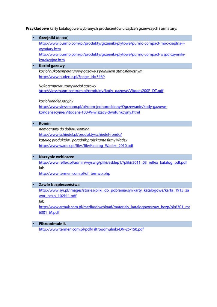 Przykładowe karty katalogowe wybranych producentów urządzeń grzewczych i armatury: Grzejniki (dobór) http://www.purmo.com/pl/produkty/grzejniki-plytowe/purmo-compact-moc-cieplna-iwymiary.htm http://www.purmo.com/pl/produkty/grzejniki-plytowe/purmo-compact-wspolczynnikikorekcyjne.htm Kocioł gazowy kocioł niskotemperaturowy gazowy z palnikiem atmosferycznym http://www.buderus.pl/?page_id=3469 Niskotemperaturowy kocioł gazowy http://viessmann-centrum.pl/produkty/kotly_gazowe/Vitogas200F_DT.pdf kocioł kondensacyjny http://www.viessmann.pl/pl/dom-jednorodzinny/Ogrzewanie/kotly-gazowekondensacyjne/Vitodens-100-W-wiszacy-dwufunkcyjny.html Komin nomogramy do doboru komina http://www.schiedel.pl/produkty/schiedel-rondo/ katalog produktów i poradnik projektanta firmy Wadex http://www.wadex.pl/files/file/Katalog_Wadex_2010.pdf Naczynie wzbiorcze http://www.reflex.pl/admin/wyswig/pliki/esklep1//pliki/2011_03_reflex_katalog_pdf.pdf lub http://www.termen.com.pl/of_ternwp.php Zawór bezpieczeństwa http://www.syr.pl/images/stories/pliki_do_pobrania/syr/karty_katalogowe/karta_1915_za wor_bezp_102k11.pdf lub http://www.armak.com.pl/media/download/materialy_katalogowe/zaw_bezp/pl/6301_m/ 6301_M.pdf Filtroodmulnik http://www.termen.com.pl/pdf/Filtroodmulniki-DN-25-150.pdf