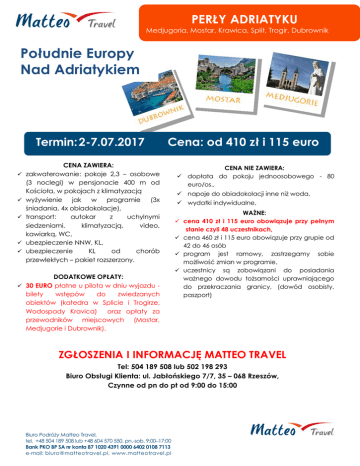 PERŁY ADRIATYKU Medjugoria, Mostar, Krawica, Split, Trogir, Dubrownik Południe Europy Nad Adriatykiem Termin: 2-7.07.2017 Cena: od 410 zł i 115 euro CENA ZAWIERA: zakwaterowanie: pokoje 2,3 – osobowe (3 noclegi) w pensjonacie 400 m od Kościoła, w pokojach z klimatyzacją wyżywienie jak w programie (3x śniadania, 4x obiadokolacje), transport: autokar z uchylnymi siedzeniami, klimatyzacją, video, kawiarką, WC, ubezpieczenie NNW, KL, ubezpieczenie KL od chorób przewlekłych – pakiet rozszerzony. DODATKOWE OPŁATY: 30 EURO płatne u pilota w dniu wyjazdu - bilety wstępów do zwiedzanych obiektów (katedra w Splicie i Trogirze, Wodospady Kravica) oraz opłaty za przewodników miejscowych (Mostar, Medjugorie i Dubrownik). CENA NIE ZAWIERA: dopłata do pokoju jednoosobowego - 80 euro/os., napoje do obiadokolacji inne niż woda, wydatki indywidualne, WAŻNE: cena 410 zł i 115 euro obowiązuje przy pełnym stanie czyli 48 uczestnikach, cena 460 zł i 115 euro obowiązuje przy grupie od 42 do 46 osób program jest ramowy, zastrzegamy sobie możliwość zmian w programie, uczestnicy są zobowiązani do posiadania ważnego dowodu tożsamości uprawniającego do przekraczania granicy, (dowód osobisty, paszport) ZGŁOSZENIA I INFORMACJĘ MATTEO TRAVEL Tel: 504 189 508 lub 502 198 293 Biuro Obsługi Klienta: ul. Jabłońskiego 7/7, 35 – 068 Rzeszów, Czynne od pn do pt od 9:00 do 15:00 Biuro Podróży Matteo Travel, tel. +48 504 189 508 lub +48 604 570 550, pn.-sob. 9:00–17:00 Bank PKO BP SA nr konta 87 1020 4391 0000 6402 0108 7113 e-mail: [email protected], www.matteotravel.pl PERŁY ADRIATYKU Medjugoria, Mostar, Krawica, Split, Trogir, Dubrownik 1. DZIEŃ (ndz) 02.07.2017 WYJAZD Zbiórka uczestników wycieczki w godzinach południowych. Przejazd przez Słowację, Węgry w kierunku Chorwacji. Jazda nocna. 2. DZIEŃ (pn) 03.07.2017 TROGIR, SPLIT, W godzinach porannych przyjazd do Trogiru – zespół starego miasta, Katedra Św. Wawrzyńca z XII w., kościoły gotyckie, kaplica błogosławionego Ivana Ursini – najpiękniejszy zabytek renesansu w Dalmacji. Przejazd do Splitu (jest jednym z większych miast leżących na Chorwackim wybrzeżu. Jako gospodarcze, kulturalne i turystyczne centrum Dalmacji, o bogatej historii, posiada wiele zabytków i zbiorów muzealnych. M.in.: rzymski pałac Dioklecjana z III w. z mauzoleum, świątynią Jowisz, rezydencją cesarską, kolumnowym dziedzińcem, bramami, liczne romańskie, gotyckie i barokowe kościoły, pałace, pomniki, muzea. Przejazd do Medjugorie, zakwaterowanie w hotelu i obiadokolacja. 3. DZIEŃ (wt) 04.07.2017 MOSTAR, KRAWICA Śniadanie, przejazd do Mostaru - miasta zachwycającego swoim orientalnym klimatem, z najcenniejszym zabytkiem - kamiennym starym mostem (wpisanym na listę UNESCO) nad rzeką Neretwą, który łączy dwie części miasta - muzułmańską i chrześcijańską. Przejazd nad wodospady Krawica – możliwość kąpieli i plażowania. Powrót do hotelu. Obiadokolacja i nocleg. 4. DZIEŃ (śr) 05.07.2017 DUBROWNIK Śniadanie. Wyjazd w kierunku Dubrownika – miasta nazywanego „perłą Adriatyku”spacer po starówce z przewodnikiem. Czas wolny. Przejazd do Medjugoria. i obiadokolacja. Nocleg. 5. DZIEŃ (czw) 06.07.2017 MEDJUGORIE Śniadanie, całodzienny pobyt w Medjugorie, wejście na Górę Objawień, góra Kriżvak, dla chętnych możliwość udziału we mszy świętej. Obiadokolacja. Wykwaterowanie się z pensjonatu. Wyjazd w stronę Polski w godzinach wieczornych. 6. DZIEŃ (pt) 07.07.2017 POWRÓT Przyjazd do Polski w godzinach południowych. Biuro Podróży Matteo Travel, tel. +48 504 189 508 lub +48 604 570 550, pn.-sob. 9:00–17:00 Bank PKO BP SA nr konta 87 1020 4391 0000 6402 0108 7113 e-mail: [email protected], www.matteotravel.pl