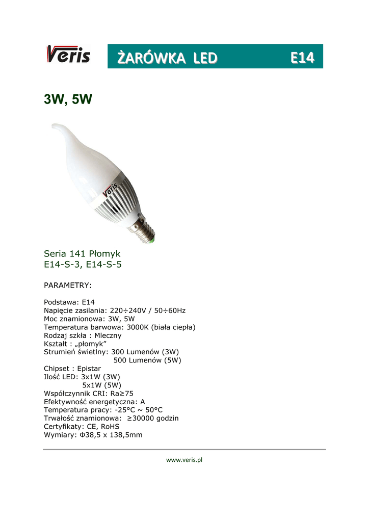 ŻARÓWKA LED E14 3W, 5W Seria 141 Płomyk E14-S-3, E14-S-5 PARAMETRY: Podstawa: E14 Napięcie zasilania: 220÷240V / 50÷60Hz Moc znamionowa: 3W, 5W Temperatura barwowa: 3000K (biała ciepła) Rodzaj szkła : Mleczny Kształt : „płomyk” Strumień świetlny: 300 Lumenów (3W) 500 Lumenów (5W) Chipset : Epistar Ilość LED: 3x1W (3W) 5x1W (5W) Współczynnik CRI: Ra≥75 Efektywność energetyczna: A Temperatura pracy: -25°C ~ 50°C Trwałość znamionowa: ≥30000 godzin Certyfikaty: CE, RoHS Wymiary: Φ38,5 x 138,5mm www.veris.pl .