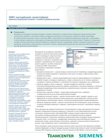 Teamcenter MRO zarządzanie materiałami Zapewnia przejrzystość zasobów i umożliwia globalną kontrolę fact sheet Siemens PLM Software www.siemens.com/teamcenter Streszczenie Rozwiązanie do zarządzania materiałami dostępne w systemie Teamcenter® umożliwia firmom świadczącym usługi serwisowe pełne monitorowanie zgodności z wymogami materiału „od zakupu do złomowania” i kontrolę części, narzędzi oraz sprzętu potrzebnego do realizacji operacji konserwacji, napraw i remontów (MRO). Funkcjonalności do zarządzania konfiguracjami wiążą części i odpowiadające im dane dotyczące użytkowania z poszczególnym konfiguracjami aktualnie wykorzystywanych środków trwałych. Pojedyncze, zintegrowane i dostępne sieciowo źródło danych ułatwia kompleksowe zarządzanie częściami uwzględniając możliwość zarządzania zapytaniami o części, dystrybucją, zamówieniami, pokwitowaniami, wymianami i zwrotami. Zespoły wykorzystują te dane aby skutecznie realizować kontrakty typu PBL (performance based logistics). Korzyści Usprawnia proces podejmowania decyzji dzięki zapewnieniu zespołom serwisowym wglądu w dane dotyczące zapasów części, narzędzi i sprzętu Ulepsza stopień wykorzystania zapasów umożliwiając zespołom serwisowym ocenę aktualnego statusu części czy zamówienia w odniesieniu do zapotrzebowania przy pracy (przyporządkowanej do aktualnej konfiguracji środków trwałych) Podnosi wydajność dzięki wykorzystaniu zautomatyzowanych procedur w celu minimalizowania czasu potrzebnego do wykonywania czynności, które nie generują wartości dodanej takich jak wstępne zamówienia, przygotowywanie informacji czy zdobywanie pozwoleń Ulepsza kontrolę organizacyjną udostępniając monitoring audytów związanych z zapasami; wykorzystuje definicje planu kont dla poszczególnych części, które w łatwy sposób integrują te części z istniejącymi systemami zarządzania finansowego i zapewniają skoordynowany wgląd w należności i płatności związane z poszczególnymi dostawcami Zwiększa stopień synergii łańcucha wartości zapewniając wgląd w zamówienia części i usług, które wymagają wycen i utrzymywania pewnego poziomu zapasów Zwiększa integralność danych udostępniając pojedyncze, dostępne sieciowo źródło do zarządzania i oceny wszystkich informacji związanych z serwisem części, narzędzi i sprzętu Rozwiązanie do zarządzania materiałami dostępne w systemie Teamcenter pozwala firmom świadczącym usługi serwisowe zarządzać szerokim zakresem danych związanych z częściami, narzędziami oraz sprzętem i optymalizować tym sposobem poziom zapasów i zasobów związanych z działaniami MRO. Rozwiązanie do zarządzania materiałami umożliwia organizacjom: • Zarządzanie dostawcami – poprzez bieżące monitorowanie ich klasyfikacji uwzględniającej jakość, skuteczność działań związanych z dostawami, ilość wycen na usługi, a także dostawy części, narzędzi oraz sprzętu • Katalogowanie części – poprzez przyporządkowanie części do odpowiadających im konfiguracji środków trwałych w bieżącym użytkowaniu, a także w odniesieniu do ich struktur zgodnych z projektem, finalnym produktem i w odniesieniu do aktywów znajdujących się w eksploatacji • Uzyskanie wglądu w dane o zapasach – poprzez zarządzanie częściami w zakresie minimalnych/maksymalnych poziomów zapasów, pokwitowań, warunków lokalizacji, w której się znajdują (uwzględniając status kwarantanny), wydań/rezerwacji, zamówień, wymian, źródeł zaopatrzenia i kosztów • Kontrolę stanu zapasów narzędzi – zapewniając przejrzystość stanu, lokalizacji i rozdysponowania do pracy zinwentaryzowanych narzędzi • Zarządzanie procesami napraw – poprzez monitorowanie części, narzędzi i sprzętu w celu zapewnienia, że wyceny dostawcy zostaną dostarczone i przeanalizowane; steruje również indywidualnymi zamówieniami napraw i monitoruje realizację działań wysyłania/odbierania • Mierzenie wydajności działań – poprzez monitorowanie firm świadczących usługi serwisowe w zakresie transakcji związanych z zapasami, wykorzystania surowców i wskaźnikami realizacji zamówień Firmy zajmujące się usługami serwisowymi i konserwacyjnymi mogą wykorzystywać ten poziom zapasów i przejrzystość procesów związanych z częściami w celu maksymalizowania zwrotu z inwestycji, skracania czasów cykli działań MRO i poprawy stopnia wykorzystania zapasów (np: poprzez redukcję kosztownych niedoborów lub zmniejszenie poziomu zapasów niewykorzystanych). Teamcenter udostępnia użytkownikom dane do podjęcia decyzji związanych z zapasami części i ich statusami, uwzględniając oznakowanie (aby zidentyfikować zapasy przestarzałe, zużyte, wyremontowane, złomowane, nadwyżki i oznaczone kodami branżowymi), wyceny, czasy oczekiwania i dane o zatwierdzonych dostawcach. Firmy świadczące usługi serwisowe mogą rozszerzyć zakres tej kontroli, aby optymalnie zarządzać wieloma lokalizacjami, w których znajdują się zapasy. Ponadto kody kreskowe i system kontroli przepływu towarów RFID mogą być wykorzystane w celu zmniejszenia liczby błędów w łańcuchu dostaw. Teamcenter fact sheet Funkcje Zarządzanie dostawcami Rozwiązanie do zarządzania materiałami w systemie Teamcenter wykorzystuje podstawowe funkcjonalności zarządzania dokumentacją w celu zarządzania danymi części i dokumentami od dostawców. Wykorzystuje również procesy workflow i funkcjonalności kontroli eksportu według procedury ITAR w celu wdrożenia najlepszych praktyk w odniesieniu do procedur zachowywania zgodności z wymogami. Zarządzanie wycenami Przykłady wykorzystania Zarządzanie częściami, narzędziami i sprzętem Poziomy maksymalny/minimalny Źródło zaopatrzenia i cena Znakowanie Katalogowanie Status Czas oczekiwania Klasyfikacja dostawców Zarządzanie zapasami Wydawanie Wypożyczenia i
