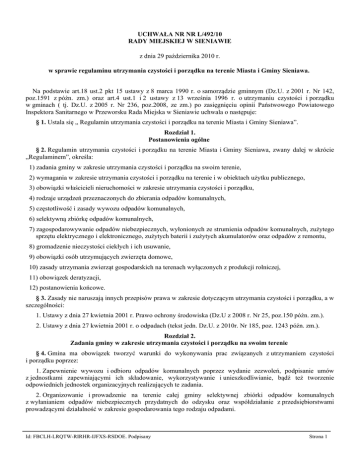 UCHWAŁA NR NR L/492/10 RADY MIEJSKIEJ W SIENIAWIE z dnia 29 października 2010 r. w sprawie regulaminu utrzymania czystości i porządku na terenie Miasta i Gminy Sieniawa. Na podstawie art.18 ust.2 pkt 15 ustawy z 8 marca 1990 r. o samorządzie gminnym (Dz.U. z 2001 r. Nr 142, poz.1591 z późn. zm.) oraz art.4 ust.1 i 2 ustawy z 13 września 1996 r. o utrzymaniu czystości i porządku w gminach ( tj. Dz.U. z 2005 r. Nr 236, poz.2008, ze zm.) po zasięgnięciu opinii Państwowego Powiatowego Inspektora Sanitarnego w Przeworsku Rada Miejska w Sieniawie uchwala o następuje: § 1. Ustala się „ Regulamin utrzymania czystości i porządku na terenie Miasta i Gminy Sieniawa”. Rozdział 1. Postanowienia ogólne § 2. Regulamin utrzymania czystości i porządku na terenie Miasta i Gminy Sieniawa, zwany dalej w skrócie „Regulaminem”, określa: 1) zadania gminy w zakresie utrzymania czystości i porządku na swoim terenie, 2) wymagania w zakresie utrzymania czystości i porządku na terenie i w obiektach użytku publicznego, 3) obowiązki właścicieli nieruchomości w zakresie utrzymania czystości i porządku, 4) rodzaje urządzeń przeznaczonych do zbierania odpadów komunalnych, 5) częstotliwość i zasady wywozu odpadów komunalnych, 6) selektywną zbiórkę odpadów komunalnych, 7) zagospodarowywanie odpadów niebezpiecznych, wyłonionych ze strumienia odpadów komunalnych, zużytego sprzętu elektrycznego i elektronicznego, zużytych baterii i zużytych akumulatorów oraz odpadów z remontu, 8) gromadzenie nieczystości ciekłych i ich usuwanie, 9) obowiązki osób utrzymujących zwierzęta domowe, 10) zasady utrzymania zwierząt gospodarskich na terenach wyłączonych z produkcji rolniczej, 11) obowiązek deratyzacji, 12) postanowienia końcowe. § 3. Zasady nie naruszają innych przepisów prawa w zakresie dotyczącym utrzymania czystości i porządku, a w szczególności: 1. Ustawy z dnia 27 kwietnia 2001 r. Prawo ochrony środowiska (Dz.U z 2008 r. Nr 25, poz.150 późn. zm.). 2. Ustawy z dnia 27 kwietnia 2001 r. o odpadach (tekst jedn. Dz.U. z 2010r. Nr 185, poz. 1243 późn. zm.). Rozdział 2. Zadania gminy w zakresie utrzymania czystości i porządku na swoim terenie § 4. Gmina ma obowiązek tworzyć warunki do wykonywania prac związanych z utrzymaniem czystości i porządku poprzez: 1. Zapewnienie wywozu i odbioru odpadów komunalnych poprzez wydanie zezwoleń, podpisanie umów z jednostkami zapewniającymi ich składowanie, wykorzystywanie i unieszkodliwianie, bądź też tworzenie odpowiednich jednostek organizacyjnych realizujących te zadania. 2. Organizowanie i prowadzenie na terenie całej gminy selektywnej zbiórki odpadów komunalnych z wyłanianiem odpadów niebezpiecznych przydatnych do odzysku oraz współdziałanie z przedsiębiorstwami prowadzącymi działalność w zakresie gospodarowania tego rodzaju odpadami. Id: FBCLH-LRQTW-RIRHR-IJFXS-RSDOE. Podpisany Strona 1 3. Zapewnienie zbierania, transport i unieszkodliwianie zwłok bezdomnych zwierząt lub ich części oraz współdziałanie z przedsiębiorcami podejmującymi działalność w tym zakresie. 4. Utrzymywanie czystości na terenach ulic, chodnikach, placach, terenach zieleni, parkach, drogach publicznych, których zarządcą jest gmina. 5. Organizowanie ochrony przed bezdomnymi zwierzętami na zasadach określonych w odrębnych przepisach. 6. Znakowania obszarów dotkniętych lub zagrożonych chorobą zakaźną. 7. Utworzenie ewidencji zbiorników bezodpływowych i oczyszczalni przydomowych w celu opracowania planu rozwoju sieci kanalizacyjnej. 8. Prowadzenie ewidencji umów zawartych na odbieranie odpadów komunalnych od właścicieli nieruchomości w celu kontroli wykonywania przez właścicieli nieruchomości i przedsiębiorców obowiązków wynikających z ustawy. 9. Budowę, utrzymanie i eksploatację wspólnych z innymi gminami: szaletów publicznych. Rozdział 3. Wymagania w zakresie otrzymania czystości i porządku na terenie i w obiektach użytku publicznego § 5. Osobom korzystającym z terenów i obiektów użyteczności publicznej zabrania się: 1. Wyrzucania i wylewania odpadów do rowów przydrożnych, cieków i terenów użytku publicznego. 2. Niszczenia znajdujących się na tych terenach elementów infrastruktury technicznej takich jak: koszy na śmieci, ławek, instalacji oświetleniowej, tablic informacyjnych i innych urządzeń. 3. Niszczenia zieleni. 4. Hałasowania i zachowywania się w sposób wykraczający poza ogólnie przyjęte normy. 5. Spalania odpadów gromadzonych w koszach ulicznych i pojemnikach specjalnie do tego celu przeznaczonych. 6. Rozmieszczania ogłoszeń, plakatów, itp. w miejscach nie przeznaczonych do tego celu, a przede wszystkim na drzewach, słupach, przystankach autobusowych, elewacjach budynków, ogrodzeń innych obiektów stanowiących własność komunalną. 7. Zabrania się gromadzenia w koszach ulicznych odpadów komunalnych powstających w lokalach handlowych, gastronomicznych, usługowych i mieszkalnych. § 6. 1. Na terenach użytku publicznego (drogach, placach, parkach, obiektach sportowych) rozmieszcza się kosze uliczne. 2. Obowiązek utrzymania czystości wokół koszy oraz usuwanie zgromadzonych w nich odpadów ciąży na zarządcy drogi, a na innych nieruchomościach na ich właścicielach. 3. Ustala się częstotliwość opróżniania koszy ulicznych: „w miarę potrzeb” oraz w okresie wiosenno-letnim przynajmniej 2 razy w miesiącu. Rozdział 4. Obowiązki właścicieli nieruchomości w zakresie utrzymania czystości i porządku § 7. Obowiązki właścicieli nieruchomości w zakresie utrzymania czystości i porządku 1. Właściciele nieruchomości są obowiązani do utrzymania porządku, czystości oraz należytego stanu sanitarno–higienicznego nieruchomości. 2. Właściciele nieruchomości oraz najemcy/właściciele lokali zapewniają utrzymanie czystości i porządku na terenie nieruchomości poprzez: 1) wyposażenie nieru