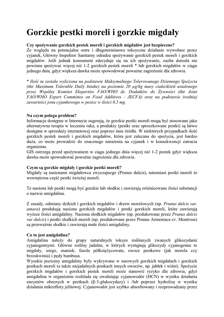 Gorzkie pestki moreli i gorzkie migdały Czy spożywanie gorzkich pestek moreli i gorzkich migdałów jest bezpieczne? Ze względu na potencjalne ostre i długoterminowe toksyczne działanie wywołane przez cyjanek, Główny Inspektor Sanitarny odradza spożywanie gorzkich pestek moreli i gorzkich migdałów. Jeśli jednak konsument zdecyduje się na ich spożywanie, osoba dorosła nie powinna spożywać więcej niż 1-2 gorzkich pestek moreli * lub gorzkich migdałów w ciągu jednego dnia, gdyż większa dawka może spowodować poważne zagrożenie dla zdrowia. * Ilość ta została wyliczona na podstawie Maksymalnego Tolerowanego Dziennego Spożycia (the Maximum Tolerable Daily Intake) na poziomie 20 µg/kg masy ciała/dzień ustalonego przez Wspólny Komitet Ekspertów FAO/WHO ds. Dodatków do Żywności (the Joint FAO/WHO Expert Committee on Food Additives - JECFA) oraz na podstawie średniej zawartości jonu cyjankowego w pestce w ilości 0,5 mg. Na czym polega problem? Informacje dostępne w Internecie sugerują, że gorzkie pestki moreli mogą być stosowane jako alternatywna terapia w leczeniu raka, a produkty (pestki oraz sproszkowane pestki) są łatwo dostępne w sprzedaży internetowej oraz poprzez inne źródła. W niektórych przypadkach ilość gorzkich pestek moreli i gorzkich migdałów, która jest zalecana do spożycia, jest bardzo duża, co może prowadzić do znacznego narażenia na cyjanek i w konsekwencji zatrucia organizmu. GIS ostrzega przed spożywaniem w ciągu jednego dnia więcej niż 1-2 pestek gdyż większa dawka może spowodować poważne zagrożenie dla zdrowia. Czym są gorzkie migdały i gorzkie pestki moreli? Migdały są nasionami migdałowca zwyczajnego (Prunus dulcis), natomiast pestki moreli to wewnętrzna część pestki świeżej moreli. Te nasiona lub pestki mogą być gorzkie lub słodkie i zawierają zróżnicowane ilości substancji o nazwie amigdalina. Z zasady, odmiany dzikich i gorzkich migdałów i drzew morelowych (np. Prunus dulcis var. amara) produkują nasiona gorzkich migdałów i pestki gorzkich moreli, które zawierają wyższe ilości amigdaliny. Nasiona słodkich migdałów (np. produkowane przez Prunus dulcis var dulcis) i pestki słodkich moreli (np. produkowane przez Prunus Armeniaca cv. Montrose) są przeważnie słodkie i zawierają małe ilości amigdaliny. Co to jest amigdalina? Amigdalina należy do grupy naturalnych toksyn roślinnych zwanych glikozydami cyjanogennymi. Główne rośliny jadalne, w których występują glikozydy cyjanogenne to migdały, sorgo, maniok, fasola półksiężycowata, owoce pestkowe (jak morela czy brzoskwinia) i pędy bambusa. Wysokie poziomy amigdaliny były wykrywane w surowych gorzkich migdałach i gorzkich pestkach moreli (a także niejadalnych pestkach innych owoców, np. jabłek i wiśni). Spożycie gorzkich migdałów i gorzkich pestek moreli może stanowić ryzyko dla zdrowia, gdyż amigdalina w organizmie rozkłada się uwalniając cyjanowodór (HCN) w wyniku działania enzymów obecnych w pestkach (β-3-glukozydazy) i /lub poprzez hydrolizę w wyniku działania mikroflory jelitowej. Cyjanowodór jest szybko absorbowany i rozprowadzany przez organizm i może powodować poważne działania toksyczne w zależności od stężenia spożytej amigdaliny i innych czynników metabolicznych. Jakie jest zastosowanie tych pestek? Pestki moreli i migdałów (gorzkie lub słodkie) są używane do wzbogacania smaku żywności i napojów, w tym likierów (np. amaretto) oraz niektórych ciastek i ciast. Jednakże, używa się ich w bardzo małych ilościach co nie powoduje zagrożenia dla zdrowia. W ostatnim czasie, gorzkie pestki moreli oraz gorzkie migdały są błędnie promowane jako posiadające działanie przeciw-nowotworowe, co sprawiło, że niektórzy ludzie spożywają znacznie większe ilości tych produktów niż zwykle. Przeczytałem, że gorzkie pestki moreli i gorzkie migdały mają działanie antyoksydacyjne i mogą być używane w leczeniu anty-nowotworowym? Nie ma dowodów naukowych, potwierdzających że gorzkie pestki moreli, gorzkie migdały lub amigdalina są skuteczne w leczeniu raka. Gorzkie pestki moreli i gorzkie migdały nie powinny być spożywane w celach leczniczych. Co może się zdarzyć jeśli spożyłem te produkty? Ryzyko i stopień zatrucia mogą różnić się w zależności od ilości spożytego produktu i zawartej w nim amigdaliny. Objawy zatrucia cyjankiem to ból głowy, zawroty głowy, zaburzenia psychiczne i ruchowe, sinica (niebieskawe zabarwienie skóry i błon śluzowych) z drgawkami i konwulsją, a w ciężkich przypadkach zatrzymanie akcji serca, śpiączka, a nawet śmierć. Zjadłem gorzkie pestki moreli /gorzkie migdały i czuję się źle. Co powinienem zrobić? Jeśli zjadłeś te produkty i źle się czujesz, należy jak najszybciej zgłosić się do lekarza. Czy planowane jest podjęcie działań w celu ograniczenia wprowadzania do obrotu tych produktów? Obecność cyjanowodoru w gorzkich pestkach moreli i gorzkich migdałach stanowi potwierdzone poważne zagrożenie dla zdrowia konsumentów w Unii Europejskiej (UE) i dlatego, działania na poziomie UE będą rozpatrywane po uzyskaniu oceny ryzyka przygotowanej przez Europejski Urząd ds. Bezpieczeństwa Żywności.