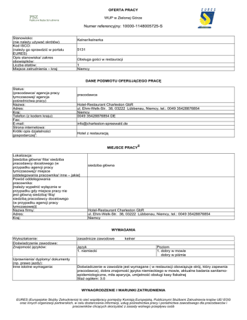 OFERTA PRACY WUP w Zielonej Górze Numer referencyjny: 10000-1148005725-S Stanowisko: (nie należy używać skrótów) Kod ISCO: (należy go sprawdzić w portalu EURES) Opis stanowiska/ zakres obowiązków: Liczba etatów: Miejsce zatrudnienia – kraj: Kelner/kelnerka 5131 Obsługa gości w restauracji 1 Niemcy DANE PODMIOTU OFERUJĄCEGO PRACĘ Status: (pracodawca/ agencja pracy tymczasowej/ agencja pośrednictwa pracy) Nazwa: Adres: Kraj: Telefon (z kodem kraju): Fax: E-mail: Strona internetowa: Krótki opis działalności gospodarczeji: pracodawca Hotel-Restaurant Charleston GbR ul. Ehm-Welk-Str. 38, 03222 Lübbenau, Niemcy, tel.: 0049 35428876854 Niemcy 0049 35428876854 DE [email protected] Hotel z restauracją MIEJSCE PRACYii Lokalizacja: [siedziba główna/ filia/ siedziba pracodawcy docelowego (w przypadku agencji pracy tymczasowej)/ miejsce oddelegowania pracownika/ inne – jakie] Powód oddelegowania pracownika: [należy wypełnić wyłącznie w przypadku gdy miejsce pracy nie jest główną siedzibą/ filią/ siedzibą pracodawcy docelowego (w przypadku agencji pracy tymczasowej)] Nazwa firmy: Adres: Kraj: siedziba główna Hotel-Restaurant Charleston GbR ul. Ehm-Welk-Str. 38, 03222 Lübbenau, Niemcy, tel.: 0049 35428876854 Niemcy WYMAGANIA Wykształcenie: Doświadczenie zawodowe: Znajomość języków: Uprawnienia/ dyplomy/ dokumenty (np. prawo jazdy): Inne istotne wymagania: zasadnicze zawodowe Język 1. niemiecki kelner Poziom 1. dobry w mowie dobry w piśmie Doświadczenie w zawodzie jest wymagane ( w restauracji obowiązuje strój, który zapewnia pracodawca), dobra znajomość języka niemieckiego w mowie, aktualne badania sanitarnoepidemiologiczne, miła aparycja, umijetność obsługi kasy fiskalnej Staż ogółem: 3.0 WYNAGRODZENIE I WARUNKI ZATRUDNIENIA EURES (Europejskie Służby Zatrudnienia) to sieć współpracy pomiędzy Komisją Europejską, Publicznymi Służbami Zatrudnienia krajów UE/ EOG oraz innych organizacji partnerskich, w celu dostarczania informacji, usług pośrednictwa pracy i poradnictwa zawodowego dla pracodawców i pracowników chcących skorzystać z zasady wolnego przepływu osób Wysokość pensji brutto: Wysokość pensji netto: Waluta, w jakiej wypłacana jest pensja: Rodzaj stawki wynagrodzenia: (godzinowa/ tygodniowa/ miesięczna/ roczna/ inna) Premie: Dodatkowe świadczenia (zakwaterowanie, wyżywienie, koszty związane ze zmianą miejsca zamieszkania, koszty podróży itp.): Nazwa firmy, z którą zostanie podpisana umowa: Rodzaj umowy: (umowa o pracę, umowa zlecenia, wolontariat, praktyka zawodowa/ staż, praca zdalna, agencja pracy tymczasowej, inne): Wymiar czasu pracy (praca na pełen etat/ część etatu): Czas trwania umowy: (nieokreślony/ określony) 8,84 Liczba godzin tygodniowo: Zmiany i praca w dni wolne: Data rozpoczęcia: Inne informacje: 40,00 Praca również w dni wolne od pracy oraz święta. 2017-03-01 Praca w systemie dwuzmianowym, do uzgodnienia z pracodawcą w godzinach od 12.00 do 22.00 Euro Czasowy ze stawką godzinową brak danych Praca na czas nieokreślony, pracodawca gwarantuje zakwaterowanie (odpłatnie) Hotel-Restaurant Charleston GbR umowa o pracę pełen etat Data wygaśnięcia umowy (w przypadku umowy na czas określony): nieokreślony SPOSÓB SKŁADANIA WNIOSKU Wymagane dokumenty (list motywacyjny, CV itp.): Język, w którym muszą być sporządzone przedkładane dokumenty: Do kogo należy wysłać dokumenty: (do pracodawcy/ doradcy EURES) Gdzie należy wysłać dokumenty: (adres, adres e-mail, nr faksu z kodem kraju itp.) Dane teleadresowe doradcy EURES lub przedstawiciela pracodawcy: (nazwisko, adres, telefon, fax, e-mail itp.) życiorys z referencjami i świadectwami pracy ( w zawodzie kelnera) niemiecki do pracodawcy pocztą tradycyjną Hotel-Restaurant Charleston GbR Herr Handschick Ehm-Welk-Str. 38 03222 Lübbenau/Spreewald Brandenburg Deutschland wpisując na kopercie "Restaurantfachmann" pocztą tradycyjną Hotel-Restaurant Charleston GbR Herr Handschick Ehm-Welk-Str. 38 03222 Lübbenau/Spreewald Brandenburg Deutschland wpisując na kopercie "Restaurantfachmann" DODATKOWE INFORMACJE Wiecej informacji na stronie internetowej http://www.charleston-spreewald.de/kontakt/stellenangebote.php WAŻNOŚĆ 2017-02-09 Data publikacji: Termin przedkładania podań o pracę / 2017-06-30 zakończenia ważności oferty: EURES (Europejskie Służby Zatrudnienia) to sieć współpracy pomiędzy Komisją Europejską, Publicznymi Służbami Zatrudnienia krajów UE/ EOG oraz innych organizacji partnerskich, w celu dostarczania informacji, usług pośrednictwa pracy i poradnictwa zawodowego dla pracodawców i pracowników chcących skorzystać z zasady wolnego przepływu osób Uprzejmie informujemy, że skontaktujemy się wyłącznie z wybranymi kandydatami. UWAGA: 1. Umowa z zagranicznym pracodawcą jest zawierana, co do zasady, zgodnie z prawem kraju zatrudnienia. Oznacza to, że wszystkie roszczenia odnośnie warunków, które obejmuje umowa, można kierować wyłącznie do odpowiedniego sądu w kraju zatrudnienia. Publiczne służby zatrudnienia (EURES) nie mogą pośredniczyć ani reprezentować pracownika w sądzie kraju zatrudnienia w przypadku sporu z pracodawcą. 2. Publiczne służby zatrudnienia (EURES) dokładają wszelkich starań, aby zapewnić rzetelność i wiarygodność ofert pracy zgłoszonych w lokalnym urzędzie pracy. Należy wyjaśnić, że oferta pracy została zgłoszona przez stronę trzecią i EURES nie odpowiada za ewentualne rozbieżności między warunkami pracy określonymi w ofercie pracy i warunkami oferowanymi przez potencjalnego pracodawcę. 3. Publiczne służby zatrudnienia (EURES) informują, że będą zbierać, przetwarzać i przekazywać potencjalnym pracodawcom zgodnie z przepisami dotyczącymi ochrony danych osobowych wszystkie dane osobowe dostarczone przez osoby poszukujące pracy. iInformacje o firmie, takie jak: status prawny, sektor, typ działalności, rodzaj produkt