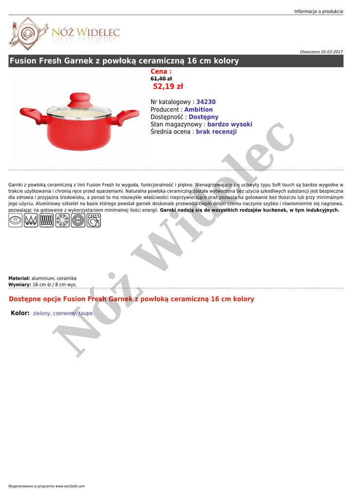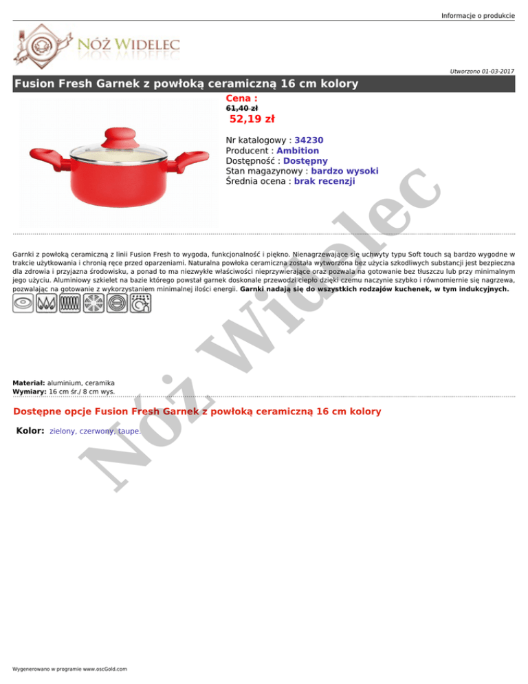 Informacje o produkcie Utworzono 01-03-2017 Fusion Fresh Garnek z powłoką ceramiczną 16 cm kolory Cena : 61,40 zł 52,19 zł le c Nr katalogowy : 34230 Producent : Ambition Dostępność : Dostępny Stan magazynowy : bardzo wysoki Średnia ocena : brak recenzji óż Materiał: aluminium, ceramika Wymiary: 16 cm śr./ 8 cm wys. W id e Garnki z powłoką ceramiczną z linii Fusion Fresh to wygoda, funkcjonalność i piękno. Nienagrzewające się uchwyty typu Soft touch są bardzo wygodne w trakcie użytkowania i chronią ręce przed oparzeniami. Naturalna powłoka ceramiczna została wytworzona bez użycia szkodliwych substancji jest bezpieczna dla zdrowia i przyjazna środowisku, a ponad to ma niezwykłe właściwości nieprzywierające oraz pozwala na gotowanie bez tłuszczu lub przy minimalnym jego użyciu. Aluminiowy szkielet na bazie którego powstał garnek doskonale przewodzi ciepło dzięki czemu naczynie szybko i równomiernie się nagrzewa, pozwalając na gotowanie z wykorzystaniem minimalnej ilości energii. Garnki nadają się do wszystkich rodzajów kuchenek, w tym indukcyjnych. Dostępne opcje Fusion Fresh Garnek z powłoką ceramiczną 16 cm kolory N Kolor: zielony, czerwony, taupe. Wygenerowano w programie www.oscGold.com