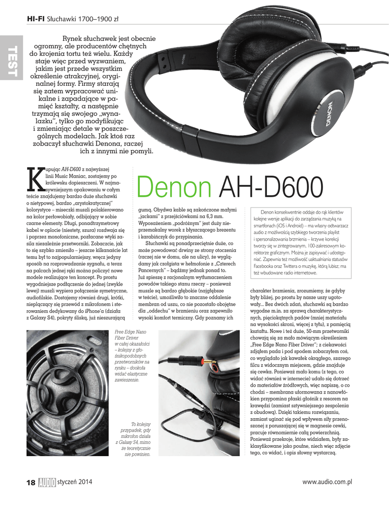 HI-FI Słuchawki 1700–1900 zł TEST Rynek słuchawek jest obecnie ogromny, ale producentów chętnych do krojenia tortu też wielu. Każdy staje więc przed wyzwaniem, jakim jest przede wszystkim określenie atrakcyjnej, oryginalnej formy. Firmy starają się zatem wypracować unikalne i zapadające w pamięć kształty, a następnie trzymają się swojego „wynalazku”, tylko go modyfikując i zmieniając detale w poszczególnych modelach. Jak ktoś raz zobaczył słuchawki Denona, raczej ich z innymi nie pomyli. K upując AH-D600 z najwyższej linii Music Maniac, zostajemy po królewsku dopieszczeni. W najmasywniejszym opakowaniu w całym teście znajdujemy bardzo duże słuchawki o nietypowej, bardzo „arystokratycznej” kolorystyce – miseczki muszli polakierowano na kolor perłowobiały, odbijający w sobie czarne elementy. Długi, ponadtrzymetrowy kabel w oplocie (niestety, szura) rozdwaja się i poprzez monofoniczne, pozłacane wtyki zasila niezależnie przetworniki. Zobaczcie, jak to się szybko zmieniło – jeszcze kilkanaście lat temu był to najpopularniejszy, wręcz jedyny sposób na rozprowadzanie sygnału, a teraz na palcach jednej ręki można policzyć nowe modele realizujące ten koncept. Po prostu wygodniejsze podłączenie do jednej (zwykle lewej) muszli wypiera połączenie symetryczne, audiofilskie. Dostajemy również drugi, krótki, nieplączący się przewód z mikrofonem i sterowaniem dedykowany do iPhone’a (działa z Galaxy S4), pokryty śliską, już nieszurającą Denon AH-D600 gumą. Obydwa kable są zakończone małymi „jackami” z przejściówkami na 6,3 mm. Wyposażeniem „podróżnym” jest duży nieprzemakalny worek z błyszczącego brezentu i karabińczyk do przypinania. Słuchawki są ponadprzeciętnie duże, co może powodować drwiny ze strony otoczenia (raczej nie w domu, ale na ulicy), że wyglądamy jak czołgista w hełmofonie z „Czterech Pancernych” – bądźmy jednak ponad to. Już spieszę z racjonalnym wytłumaczeniem powodów takiego stanu rzeczy – ponieważ muszle są bardzo głębokie (najgłębsze w teście), umożliwiło to znaczne oddalenie membran od uszu, co nie pozostało obojętne dla „oddechu” w brzmieniu oraz zapewniło wysoki komfort termiczny. Gdy poznamy ich Free Edge Nano Fiber Driver w całej okazałości – kolejny z głośnikopodobnych przetworników na rynku – dookoła widać elastyczne zawieszenie. To kolejny przypadek, gdy mikrofon działa z Galaxy S4, mimo że teoretycznie nie powinien. 18 styczeń 2014 Denon konsekwentnie oddaje do rąk klientów kolejne wersje aplikacji do zarządzania muzyką na smartfonach (iOS i Android) – ma własny odtwarzacz audio z możliwością szybkiego tworzenia playlist i spersonalizowania brzmienia – krzywe korekcji tworzy się w zintegrowanym, 100-zakresowym korektorze graficznym. Można je zapisywać i udostępniać. Zapewnia też możliwość uaktualniania statusów Facebooka oraz Twittera o muzykę, którą lubisz; ma też wbudowane radio internetowe. charakter brzmienia, zrozumiemy, że gdyby były bliżej, po prostu by nasze uszy ugotowały... Bez dwóch zdań, słuchawki są bardzo wygodne m.in. za sprawą charakterystycznych, pięciokątnych padów (mniej materiału na wysokości skroni, więcej z tyłu), z pamięcią kształtu. Nowe i też duże, 50-mm przetworniki chowają się za mało mówiącym określeniem „Free Edge Nano Fiber Driver”; z ciekawości zdjąłem pada i pod spodem zobaczyłem coś, co wyglądało jak kawałek okrągłego, szarego filcu z widocznym miejscem, gdzie znajduje się cewka. Ponieważ mało komu (z tego, co widać również w internecie) udało się dotrzeć do materiałów źródłowych, więc napiszę, o co chodzi – membrana uformowana z nanowłókien przypomina płaski głośnik z resorem na krawędzi (zamiast sztywniejszego zespolenia z obudową). Dzięki takiemu rozwiązaniu, zamiast uginać się pod wpływem siły przenoszonej z poruszającej się w magnesie cewki, pracuje równomiernie całą powierzchnią. Ponieważ przekroje, które widziałem, były zaklasyfikowane jako poufne, niech więc zdjęcie tego, co widać, i opis słowny wystarczą. www.audio.com.pl ODSŁUCH Co rok prorok... Co strona to inne brzmienie, a każde ciekawe, nie do pogardzenia. Jak się okazuje, Beyerdynamiki ze swoją mistrzowską neutralnością były tylko początkiem podróży, pokazującej bardzo różne wariacje na temat „słuchawki dla wymagających”. Beyerdynamiki już do końca będą dobrym układem odniesienia, co wcale nie znaczy, że najprzyjemniej słuchałoby się układu odniesienia... Denony mają mocno zaznaczoną specyfikę, są wręcz unikalne, i nie jest to kwestia jakichś smaczków, ale zasadniczych możliwości i charakteru, którego nikt nie przegapi; to nie są słuchawki tylko dla koneserów, którzy muszą być wyćwiczeni w wychwytywaniu jakichś niuansów, akcentów, klimatów. Potężny, dynamiczny, nasycony, swobodny, a przy tym nieagresywny dźwięk może zaimponować każdemu i niemal w każdym gatunku muzyki – wyciska soki ze wszystkich nagrań. Zwłaszcza basowe soki, ale nie tylko. Brzmienie oparte na bardzo solidnym fundamencie ma też barwną średnicę, a górę już łagodną, lecz słodką i ujmującą subtelnościami, a nie po prostu przytłumioną. Pozwolę sobie na takie porównanie – w żeńskiej wokalistyce spotykamy sopran i sopran koloraturowy – pierwszy występuje obficie w przyrodzie, bywa ostry jak brzytwa i w tandetnej odmianie skrzecząco bezlitosny, drugi jest głosem unikalnym, o szerszej skali i zdecydowanie piękniejszym. Oplot kabla dodaje splendoru, ale w praktyce może sprawiać kłopot, „drapiąc” o przedmioty; z wersją krótką nie ma tego problemu. Podobnie jest z AH-D600 – trzeba posłuchać, a można zakochać się w nich do grobowej deski albo je odrzucić. Mają one w sobie owo magiczne coś, co sprawia frajdę – potężne, a jednocześnie delika