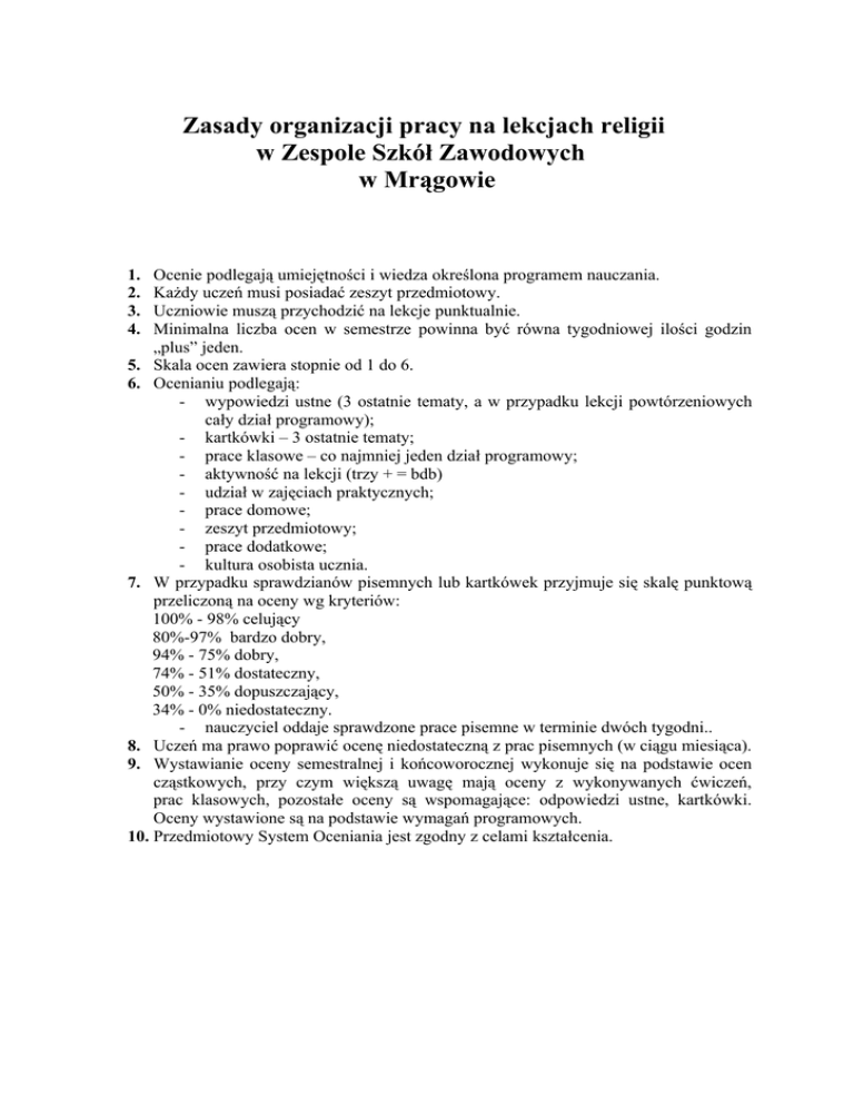 Zasady organizacji pracy na lekcjach religii w Zespole Szkół Zawodowych w Mrągowie 1. 2. 3. 4. Ocenie podlegają umiejętności i wiedza określona programem nauczania. Każdy uczeń musi posiadać zeszyt przedmiotowy. Uczniowie muszą przychodzić na lekcje punktualnie. Minimalna liczba ocen w semestrze powinna być równa tygodniowej ilości godzin „plus” jeden. 5. Skala ocen zawiera stopnie od 1 do 6. 6. Ocenianiu podlegają: - wypowiedzi ustne (3 ostatnie tematy, a w przypadku lekcji powtórzeniowych cały dział programowy); - kartkówki – 3 ostatnie tematy; - prace klasowe – co najmniej jeden dział programowy; - aktywność na lekcji (trzy + = bdb) - udział w zajęciach praktycznych; - prace domowe; - zeszyt przedmiotowy; - prace dodatkowe; - kultura osobista ucznia. 7. W przypadku sprawdzianów pisemnych lub kartkówek przyjmuje się skalę punktową przeliczoną na oceny wg kryteriów: 100% - 98% celujący 80%-97% bardzo dobry, 94% - 75% dobry, 74% - 51% dostateczny, 50% - 35% dopuszczający, 34% - 0% niedostateczny. - nauczyciel oddaje sprawdzone prace pisemne w terminie dwóch tygodni.. 8. Uczeń ma prawo poprawić ocenę niedostateczną z prac pisemnych (w ciągu miesiąca). 9. Wystawianie oceny semestralnej i końcoworocznej wykonuje się na podstawie ocen cząstkowych, przy czym większą uwagę mają oceny z wykonywanych ćwiczeń, prac klasowych, pozostałe oceny są wspomagające: odpowiedzi ustne, kartkówki. Oceny wystawione są na podstawie wymagań programowych. 10. Przedmiotowy System Oceniania jest zgodny z celami kształcenia. Przedmiotowy System Oceniania do przedmiotu: Religia Wymagania dotyczące poszczególnych ocen, z uwzględnieniem: umiejętności, wiedzy, przejawów zastosowania w życiu Ocena Niedostateczna Dopuszczająca Dostateczna Dobra Wymagania • Uczeń nie spełnia wymagań na ocenę dopuszczającą • Odmawia wszelkiej współpracy • Ma lekceważący stosunek do przedmiotu i wiary • Uczeń jest obecny na lekcji, słucha, nie przeszkadza w prowadzeniu lekcji • Zdobyte wiadomości nie są wystarczające na uzyskanie przez ucznia ogólnej wiedzy religijnej • Zna najbardziej istotne z podstawowych modlitw i prawd wiary • Dysponuje minimalną wiedzą w zakresie materiału przewidzianego programem • Rozwiązuje zadania o niewielkim stopniu trudności przy pomocy nauczyciela • Niechętnie bierze udział w lekcji • Często opuszcza katechezę • Ma lekceważący stosunek do przedmiotu • Uczeń prowadzi notatki, wykonuje zadania, potrafi odtworzyć z pamięci wnioski z lekcji • Uczeń opanował wiadomości i umiejętności umożliwiające zdobywanie dalszej wiedzy • Dysponuje przeciętną wiedzą w zakresie materiału przewidzianego programem • Nie wykazuje większego zainteresowania przedmiotem • Nieregularnie uczęszcza na lekcje • Wykonywanie zadań przez ucznia budzi zastrzeżenia • Nie bierze udziału w życiu parafii, w różnych formach duszpasterstwa • Uczeń posiada uzupełniony zeszyt, potrafi samodzielnie odpowiedzieć na wszystkie pytania związane z tematem lekcji, przejawia aktywność na zajęciach, posiada znajomość „Małego katechizmu” • Uczeń opanował wiadomości i umiejętności, które pozwalają na rozumienie większości relacji między elementami wiedzy religijnej • Zna podstawowe modlitwy i prawdy wiary, rozumie je oraz umie wyjaśnić czym jest chrześcijaństwo w życiu codziennym • Dysponuje dobrą umiejętnością zastosowania zdobytych wiadomości • • • Bardzo dobra • • • • • Celująca • • • • • • • Zachowuje szacunek dla przedmiotów, miejsc i znaków religijnych Nie zaniedbuje uczestnictwa na lekcjach, na które przychodzi przygotowany Uczestniczy w rekolekcjach szkolnych Uczeń jest zdyscyplinowany, posiada uzupełniony zeszyt, potrafi samodzielnie wyjaśnić i powiązać wiadomości z programu nauczania, posiada biegłą znajomość „Małego katechizmu”, bierze czynny udział w katechezie Uczeń opanował pełny zakres wiedzy i umiejętności określonych programem katechezy Sprawnie posługuje się zdobytymi wiadomościami Chętnie i regularnie uczestniczy w lekcjach Zachowuje szacunek dla przedmiotów, miejsc i znaków religijnych Chętnie uczestniczy w życiu parafii Przejawia postawę apostolską Uczeń nie tylko spełnia wymagania na oceną bardzo dobrą, ale również posiada wiedzę wykraczającą poza program katechezy Wyróżnia się aktywnością Aktywnie uczestniczy w życiu parafii Wypowiada się logicznie i wyczerpująco na dany temat, biegle posługuje się zdobytymi wiadomościami Osiąga sukcesy w konkursach religijnych lub posiada inne porównywalne osiągnięcia