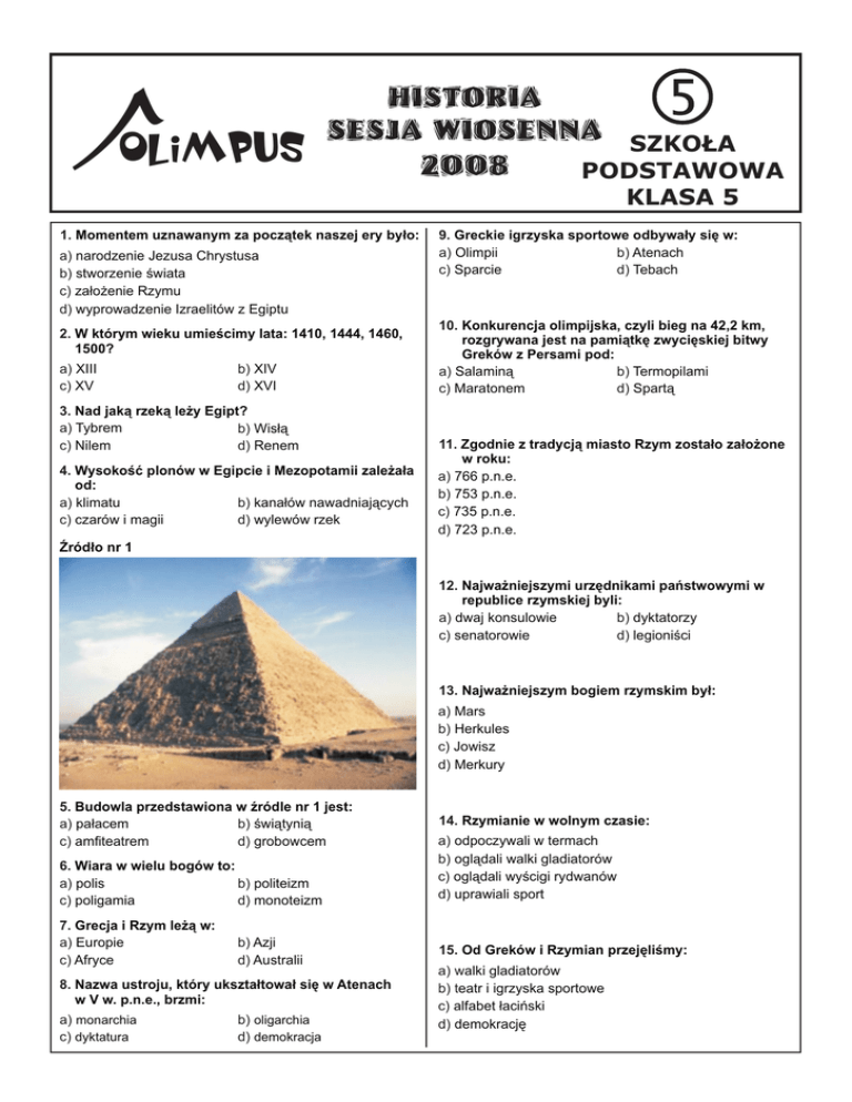 OLIMPUS 1. Momentem uznawanym za pocz¹tek naszej ery by³o: a) narodzenie Jezusa Chrystusa b) stworzenie œwiata c) za³o¿enie Rzymu d) wyprowadzenie Izraelitów z Egiptu 2. W którym wieku umieœcimy lata: 1410, 1444, 1460, 1500? a) XIII c) XV b) XIV d) XVI 3. Nad jak¹ rzek¹ le¿y Egipt? a) Tybrem b) Wis³¹ c) Nilem d) Renem 4. Wysokoœæ plonów w Egipcie i Mezopotamii zale¿a³a od: a) klimatu b) kana³ów nawadniaj¹cych c) czarów i magii d) wylewów rzek SZKOLA PODSTAWOWA KLASA 5 9. Greckie igrzyska sportowe odbywa³y siê w: a) Olimpii b) Atenach c) Sparcie d) Tebach 10. Konkurencja olimpijska, czyli bieg na 42,2 km, rozgrywana jest na pami¹tkê zwyciêskiej bitwy Greków z Persami pod: a) Salamin¹ b) Termopilami c) Maratonem d) Spart¹ 11. Zgodnie z tradycj¹ miasto Rzym zosta³o za³o¿one w roku: a) 766 p.n.e. b) 753 p.n.e. c) 735 p.n.e. d) 723 p.n.e. ród³o nr 1 12. Najwa¿niejszymi urzêdnikami pañstwowymi w republice rzymskiej byli: a) dwaj konsulowie b) dyktatorzy c) senatorowie d) legioniœci 13. Najwa¿niejszym bogiem rzymskim by³: a) Mars b) Herkules c) Jowisz d) Merkury 5. Budowla przedstawiona w Ÿródle nr 1 jest: a) pa³acem b) œwi¹tyni¹ c) amfiteatrem d) grobowcem 6. Wiara w wielu bogów to: a) polis b) politeizm c) poligamia d) monoteizm 7. Grecja i Rzym le¿¹ w: a) Europie c) Afryce b) Azji d) Australii 8. Nazwa ustroju, który ukszta³towa³ siê w Atenach w V w. p.n.e., brzmi: a) monarchia c) dyktatura b) oligarchia d) demokracja 14. Rzymianie w wolnym czasie: a) odpoczywali w termach b) ogl¹dali walki gladiatorów c) ogl¹dali wyœcigi rydwanów d) uprawiali sport 15. Od Greków i Rzymian przejêliœmy: a) walki gladiatorów b) teatr i igrzyska sportowe c) alfabet ³aciñski d) demokracjê 16. Epoka, która nast¹pi³a po upadku cesarstwa rzymskiego, to: a) œredniowiecze; b) renesans; c) barok; d) oœwiecenie. ród³o nr 2 17. ród³o nr 2 przedstawia: a) legionistê; b) hoplitê; c) rycerza; d) janczara. 18. Ka¿dego rycerza obowi¹zywa³y rycerskie zasady postêpowania, w myœl których: a) musia³ s³u¿yæ królowi; b) nie móg³ z³amaæ danego s³owa; c) musia³ broniæ s³abych; d) stawa³ w obronie dam. 19. Najbardziej znanym polskim rycerzem, na którego s³owie mo¿na by³o zawsze polegaæ by³: a) Zawisza Czarny; b) W³adys³aw Jagie³³o; c) Boles³aw Chrobry; d) Popiel. 20. Religia, ³¹czy³a mieszkañców Europy w œredniowieczu, to: a) islam; b) chrzeœcijañstwo; c) buddyzm; d) ¿adna. 21. Naszymi przodkami byli: a) Rzymianie; b) Grecy; c) S³owianie; d) Germanie. 22. Polska jest pañstwem chrzeœcijañskim od roku: a) 1000; b) 1025; c) 972; d) 966. 23. Pierwszym koronowanym w³adc¹ Polski by³: a) Mieszko I; b) Boles³aw Chrobry; c) Mieszko II; d) Kazimierz Wielki. ród³o nr 2 ( do pytañ 24,25,26 ) (…) cesarz Otto przyby³ do grobu œw. Wojciecha dla modlitwy i pojednania, a zarazem w celu poznania s³awnego Boles³awa, jak mo¿na o tym dok³adniej wyczytaæ w ksiêdze o mêczeñstwie tego œwiêtego. Boles³aw przyj¹³ go tak zaszczytnie i okazale, jak wypad³o przyj¹æ króla, cesarza rzymskiego i dostojnego goœcia. 24. Wydarzenie opisane w Ÿródle nr 2 odby³o siê w roku: a) w 966; b) w 1000; c) w 1025; d) w 1018. 25. Œw. Wojciech zgin¹³ w czasie nawracania pogañskich: a) Czechów; b) Litwinów; c) Prusów; d) Rusinów. 26. Przyjazd cesarza Ottona III do Gniezna, opisany w Ÿródle nr 2, by³: a) pielgrzymk¹; b) wizyt¹; c) misj¹; d) wycieczk¹. 27. LudŸmi wykszta³conymi w œredniowieczu byli przede wszystkim: a) mieszczanie; b) w³adcy; c) ksiê¿a; d) mnisi. 28. Wk³adem Kazimierza Wielkiego w polsk¹ naukê by³o za³o¿enie w 1364 roku: a) Akademii Medycznej; b) Akademii Krakowskiej; c) Uniwersytetu Warszawskiego; d) Akademii Rolniczej. 29. Jednym ze studentów Akademii Krakowskiej, który „Wstrzyma³ S³oñce, ruszy³ Ziemiê”, by³: a) Miko³aj Rej; b) Miko³aj Kopernik; c) Krzysztof Kolumb; d) Zawisza Czarny. 30. Jakie style w architekturze by³y charakterystyczne dla œredniowiecza? a) romañski i gotycki; b) dorycki i joñski; c) barokowy; d) ¿aden z wy¿ej podanych.